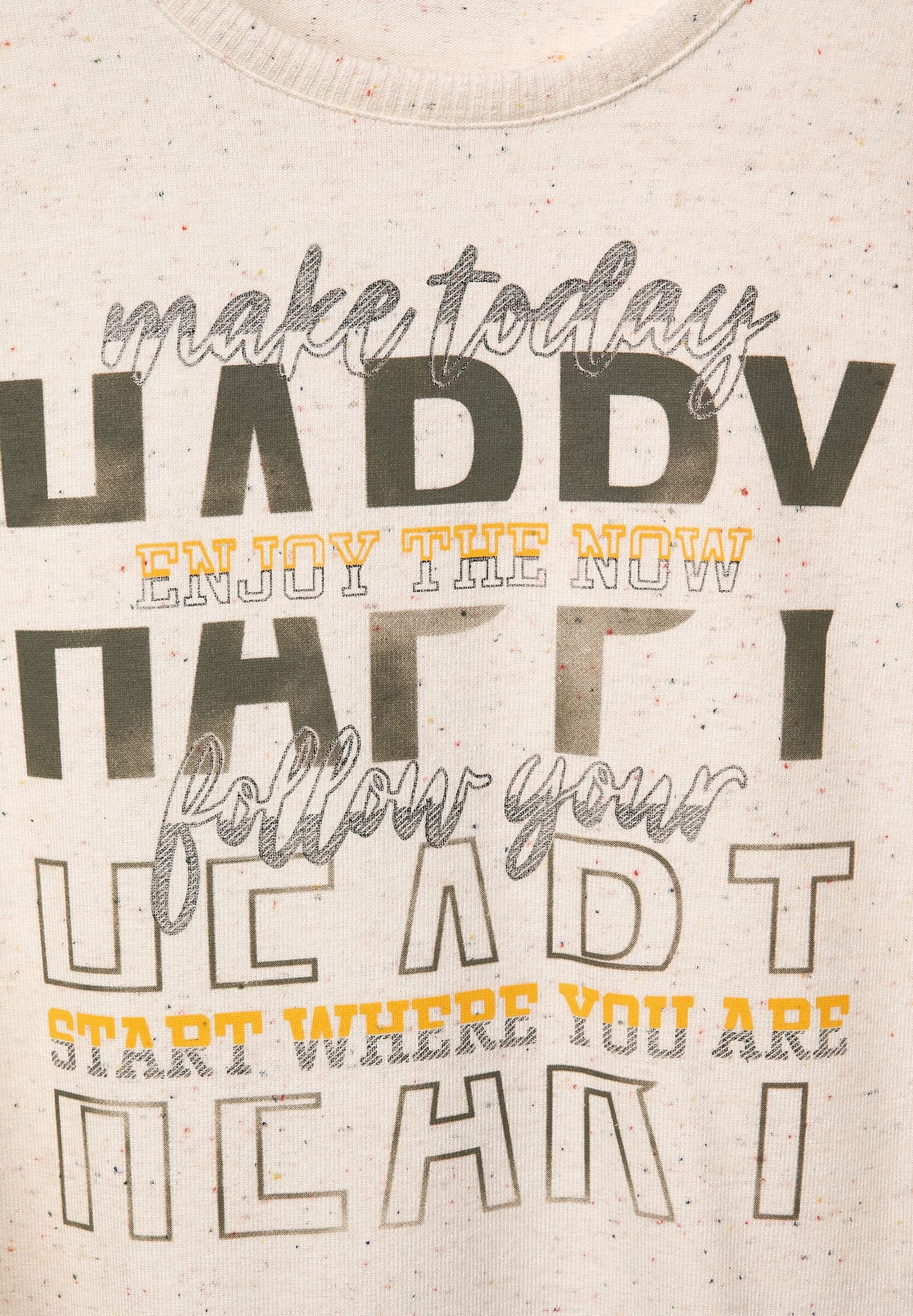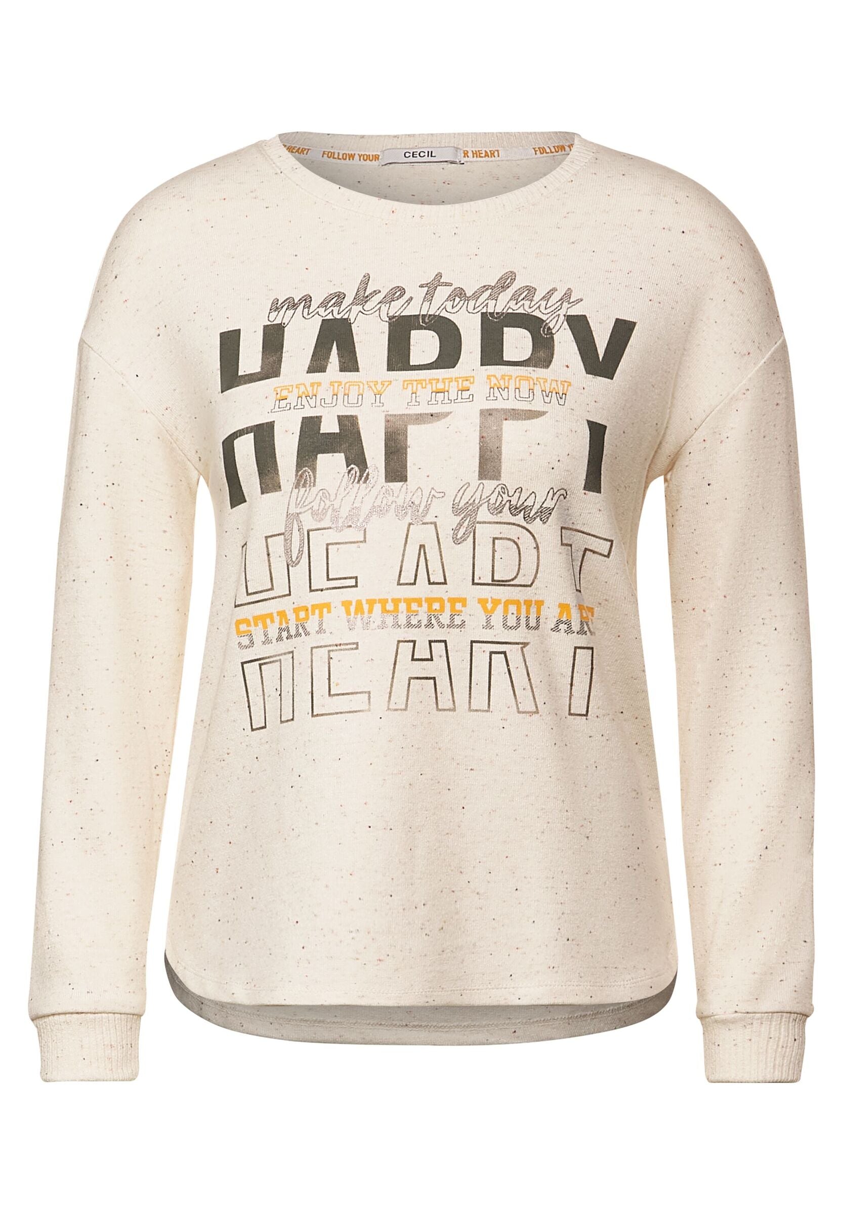 Happy heart! Besonders softes Damen Langarmshirt von CECIL. Auf der Vorderseite ist ein verspielter Wordingprint ein Hingucker auf der Melange Optik. Rippbündchen und Rundhalsausschnitt machen das Shirt zum Liebling an kalten Herbsttagen.