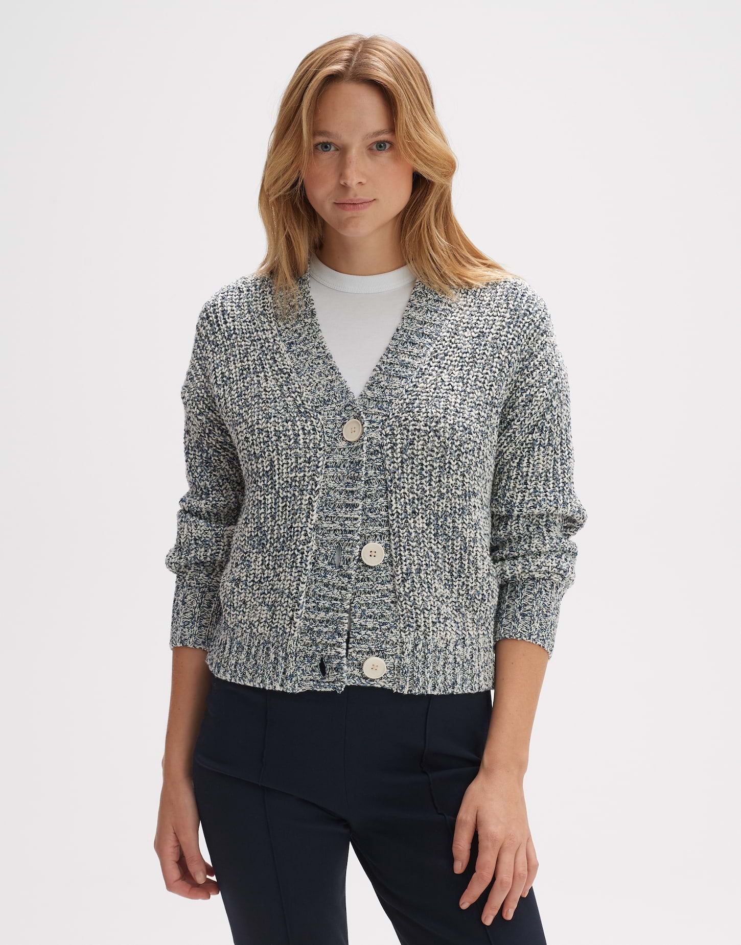 Lockere Passform, O-Form, Cropped Länge, Langarm, tiefer V-Ausschnitt, Rückenlänge ca. 52 cm bei Größe 36, Model Größe 177 cm trägt Größe 36, BCI Cotton Mix, Strick, Rippstruktur, natürlicher Griff, Mouliné Optik, elastischer Stoff, dezenter Schimmer, Mulitcolor, gerippter Saum, lange Knopfleiste, überschnittene Schultern, große Hornknöpfe, große Zier-Maschen am Ärmel und in der Front57% Baumwolle, 43% Polyamid