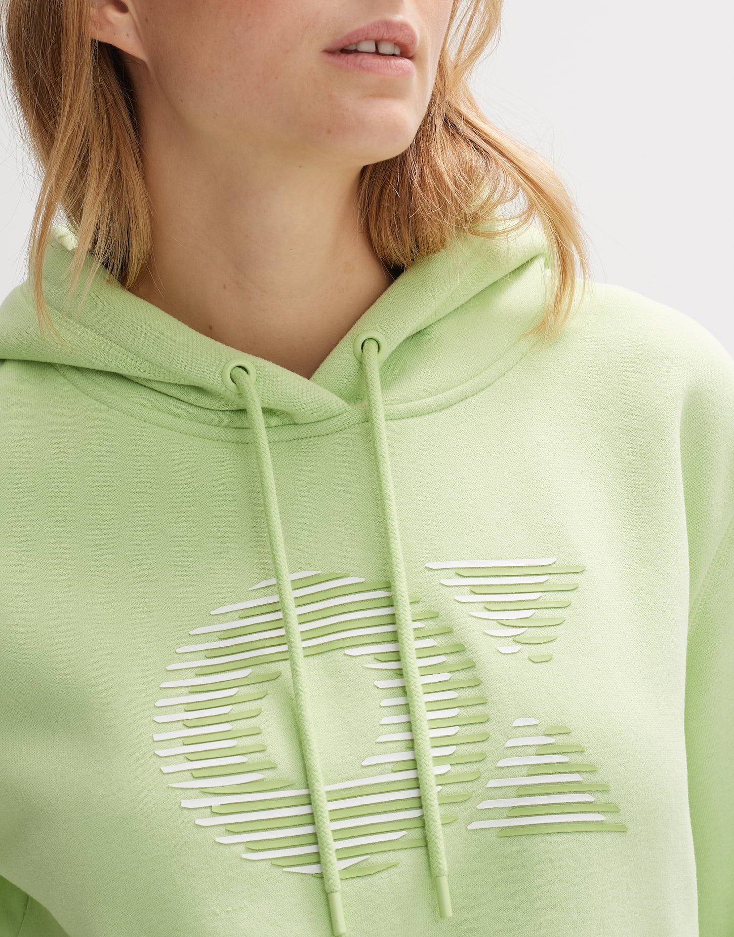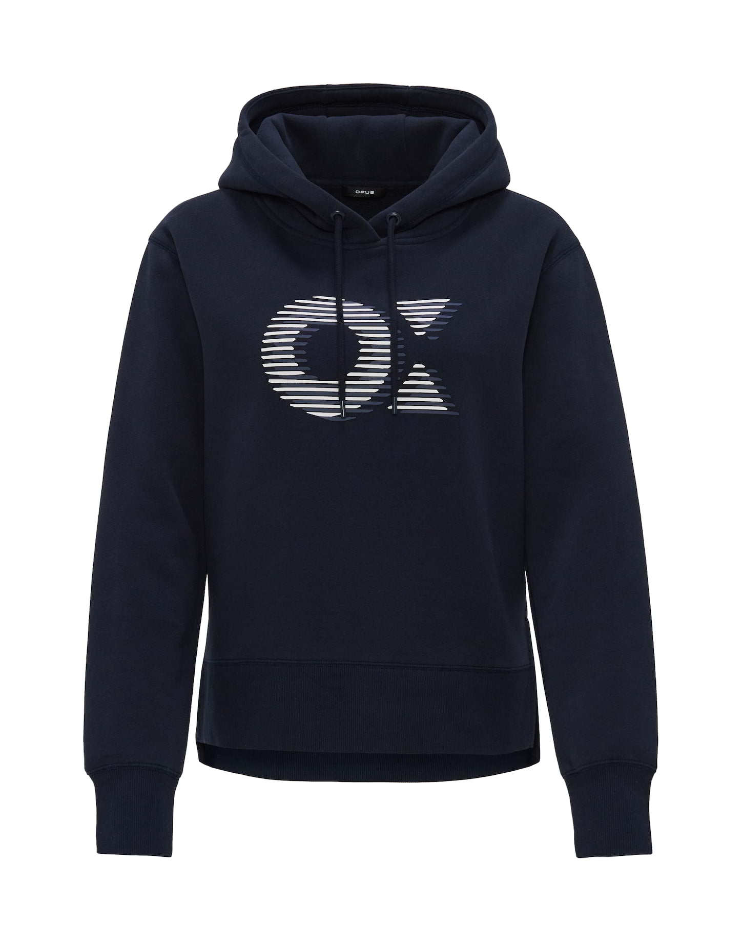 Lockere Passform, gerader Schnitt, Langarm, Kapuze, hinten länger als vorne, Rückenlänge ca. 61 cm bei Größe 36, Model Größe 176 cm trägt Größe 36, BCI Cotton Mix, Sweat, weicher Griff, angeraute Innenseite, wärmender Stoff, im Netzbeutel waschen, von links waschen und bügeln, abstrakter Rubber Print, gerippter Bund, kleine Schlitze in den Seiten, Kordel aus Baumwolle56% Baumwolle, 44% Polyester