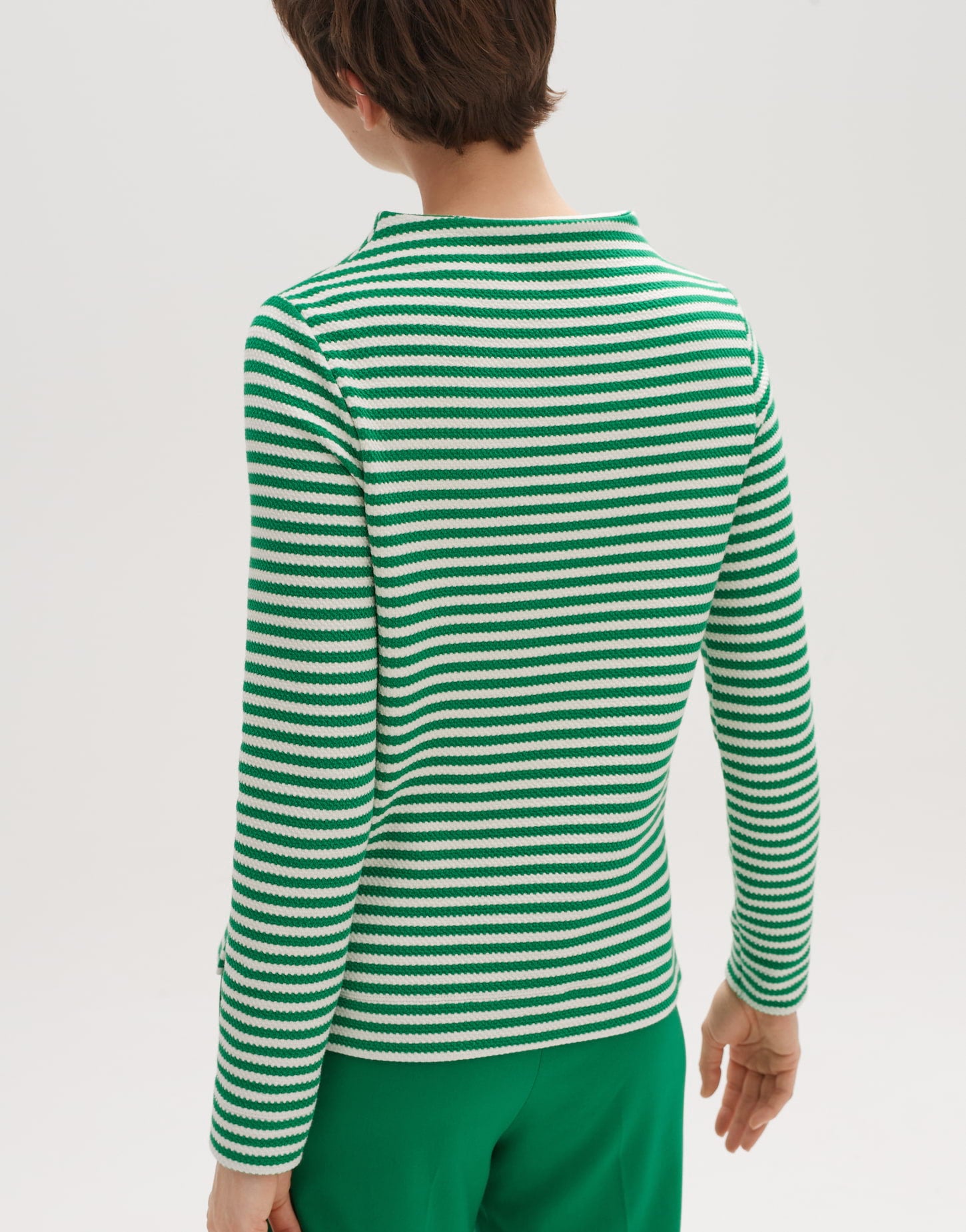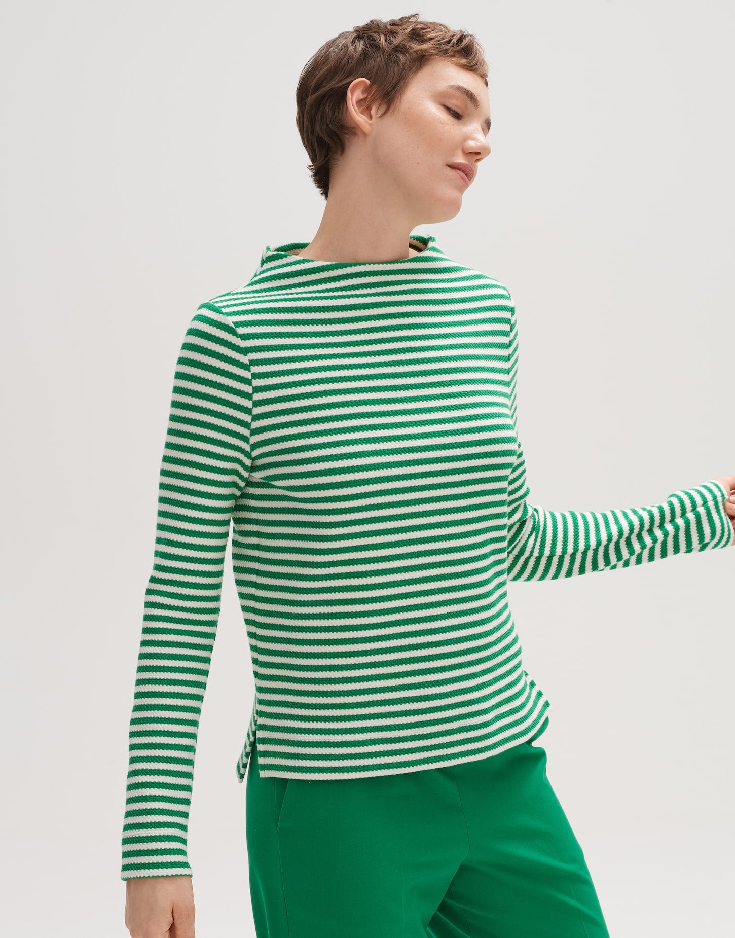 BCI Cotton Mix, Struktur, Funnelneck, Streifen, gerade, schmale Silhouette, das Model ist 176 cm groß und trägt Größe 3670% Baumwolle, 25% Polyester, 5% Elasthan