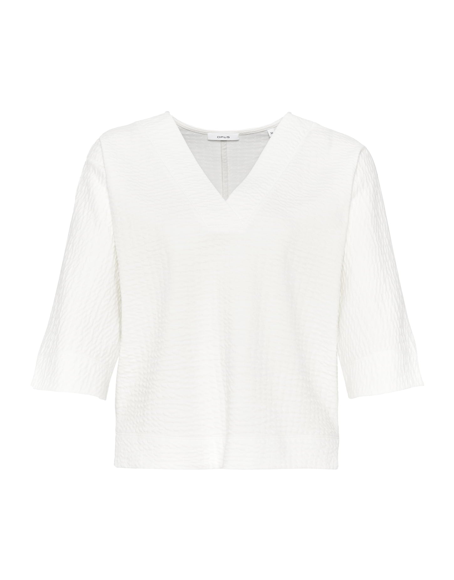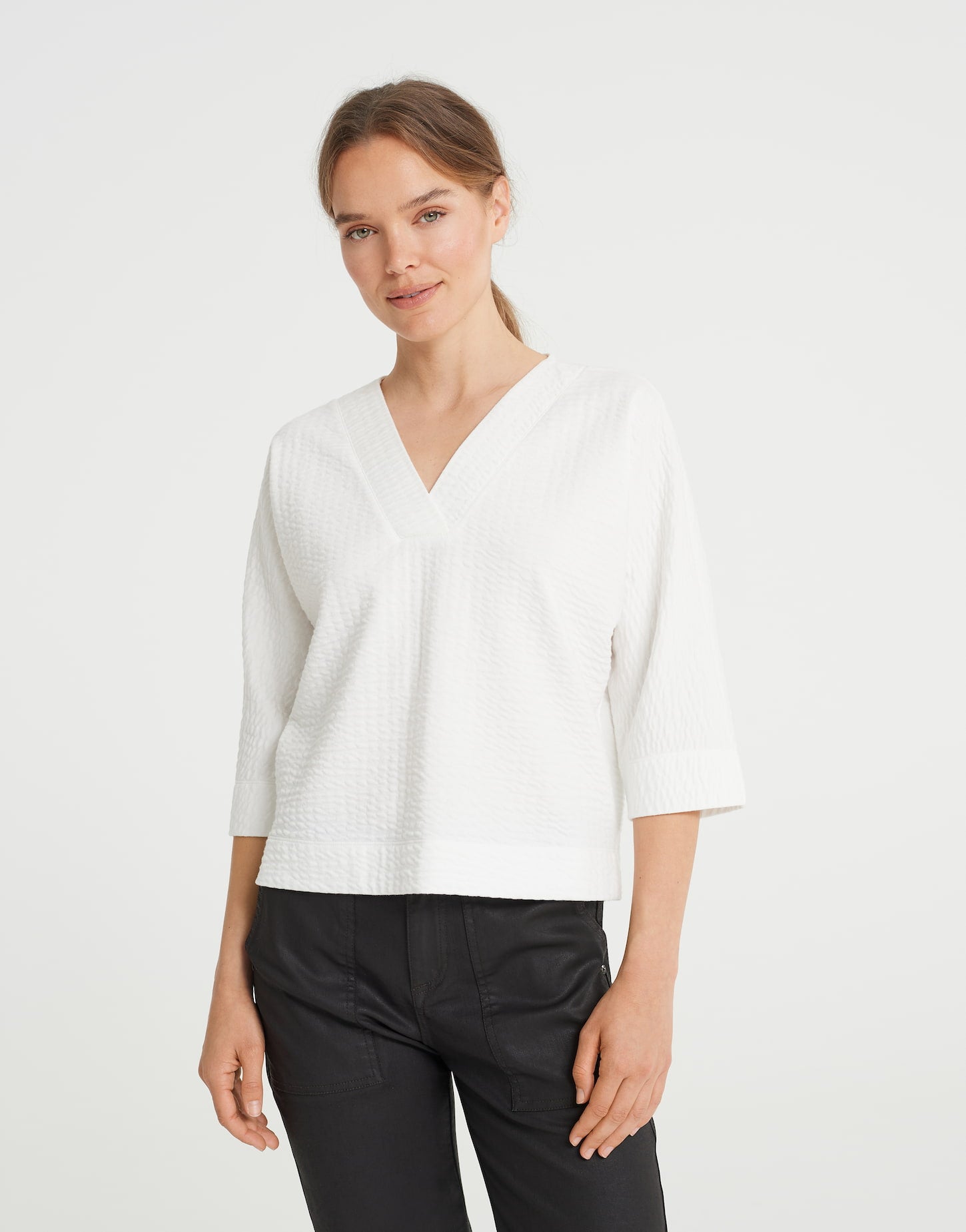 BCI Cotton Mix, Struktur, tiefer V-Neck, breit abgesteppt, angeschnittener Fledermaus-Ärmel in ¾ Länge, gerade Body, breiter Saum, Schlitze in den Seiten, das Model ist 176 cm groß und trägt Größe 3673% Baumwolle, 27% Polyester