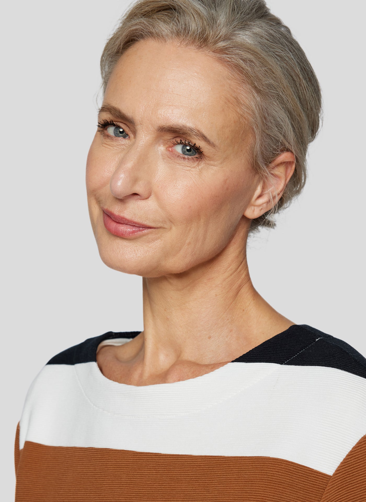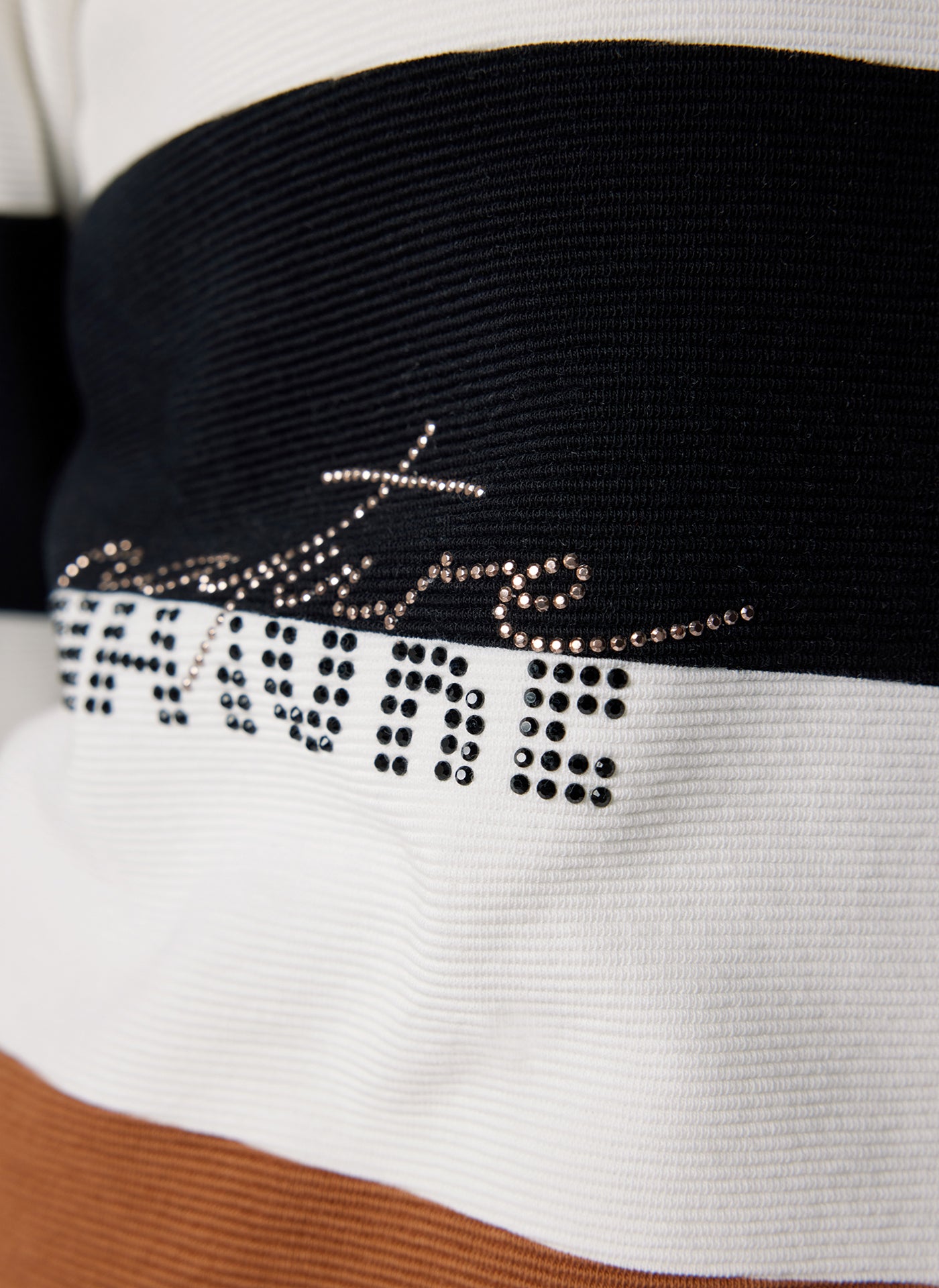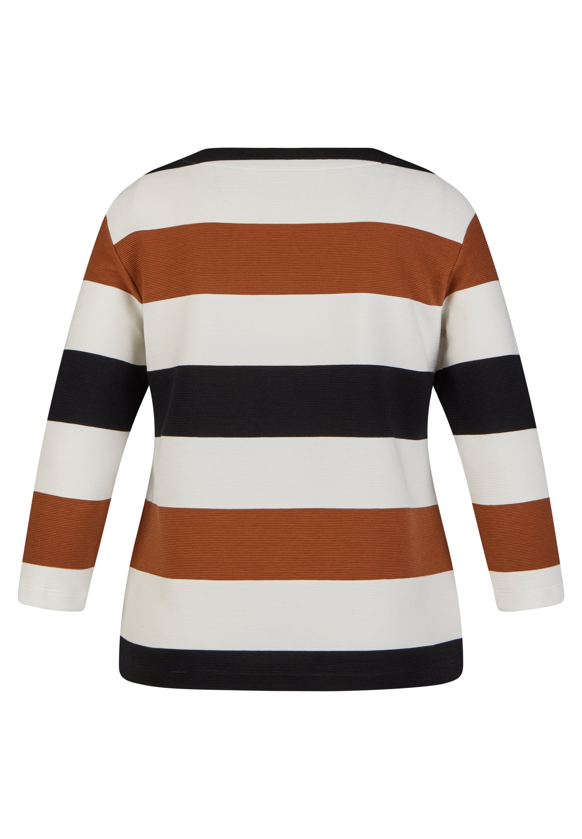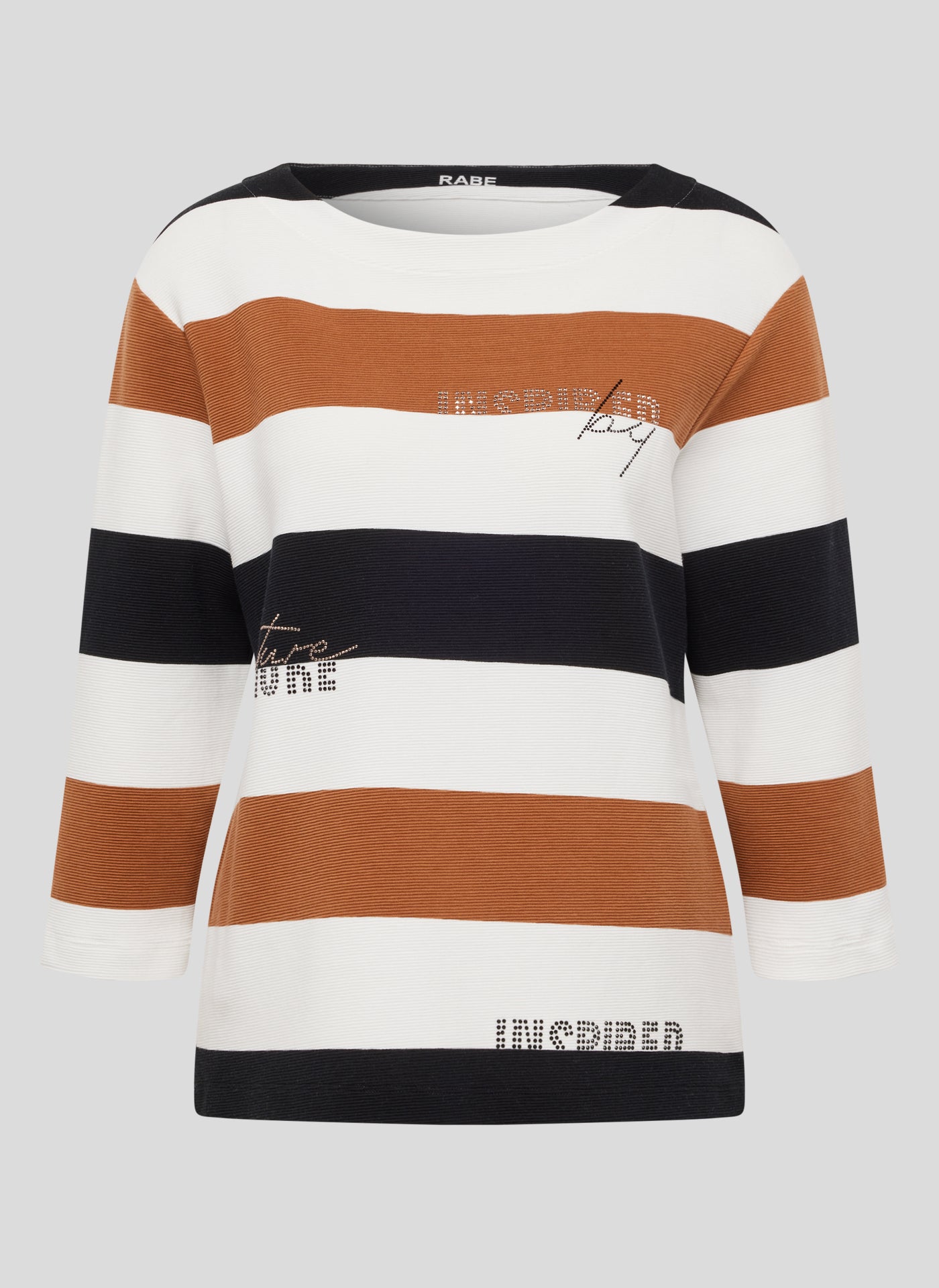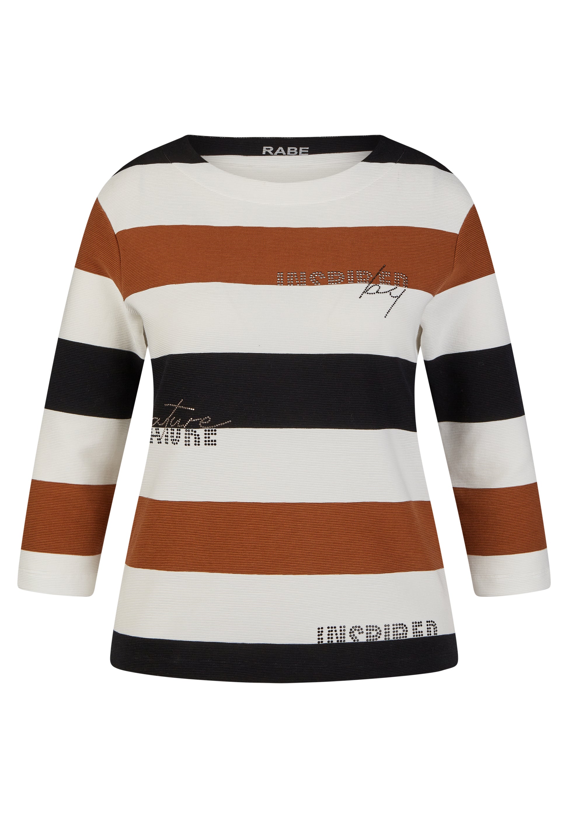 Das T-Shirt besteht aus einer angenehmen Mischung von 76% Baumwolle, 16% Polyester und 8% Elastan, die für optimalen Tragekomfort sorgt. Es verfügt über einen klassischen Rundhalsausschnitt und modische 3/4-Ärmel sowie eine gerade Schnittführung, die eine lässige Silhouette kreiert. Die überschnittenen Schultern und die Blockstreifen in Schwarz, Weiß und Cognac verleihen dem Shirt eine moderne Note. Eine Wording-Applikation setzt zusätzlich einen stilvollen Akzent und macht dieses T-Shirt zum vielseitigen Begleiter für verschiedene Anlässe.76 % Baumwolle, 16 % Polyester, 8 % Elasthan