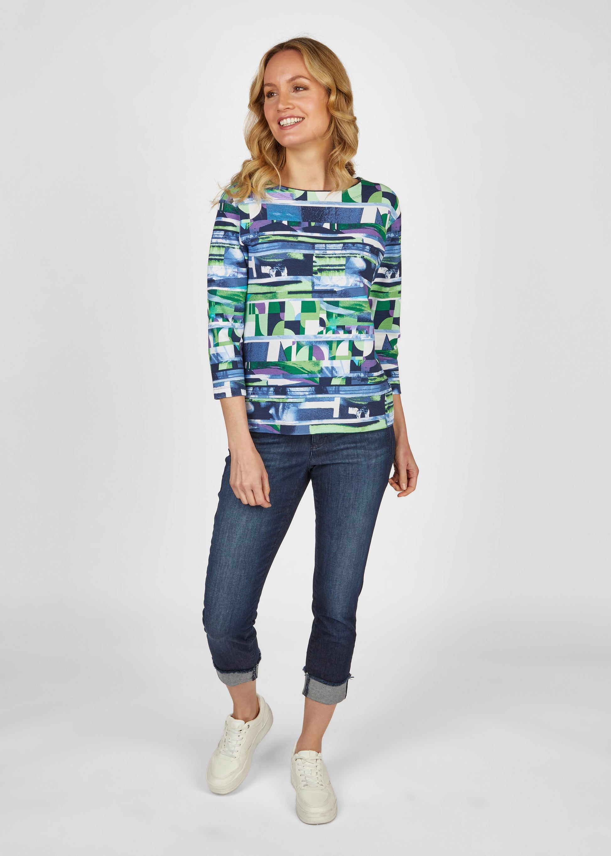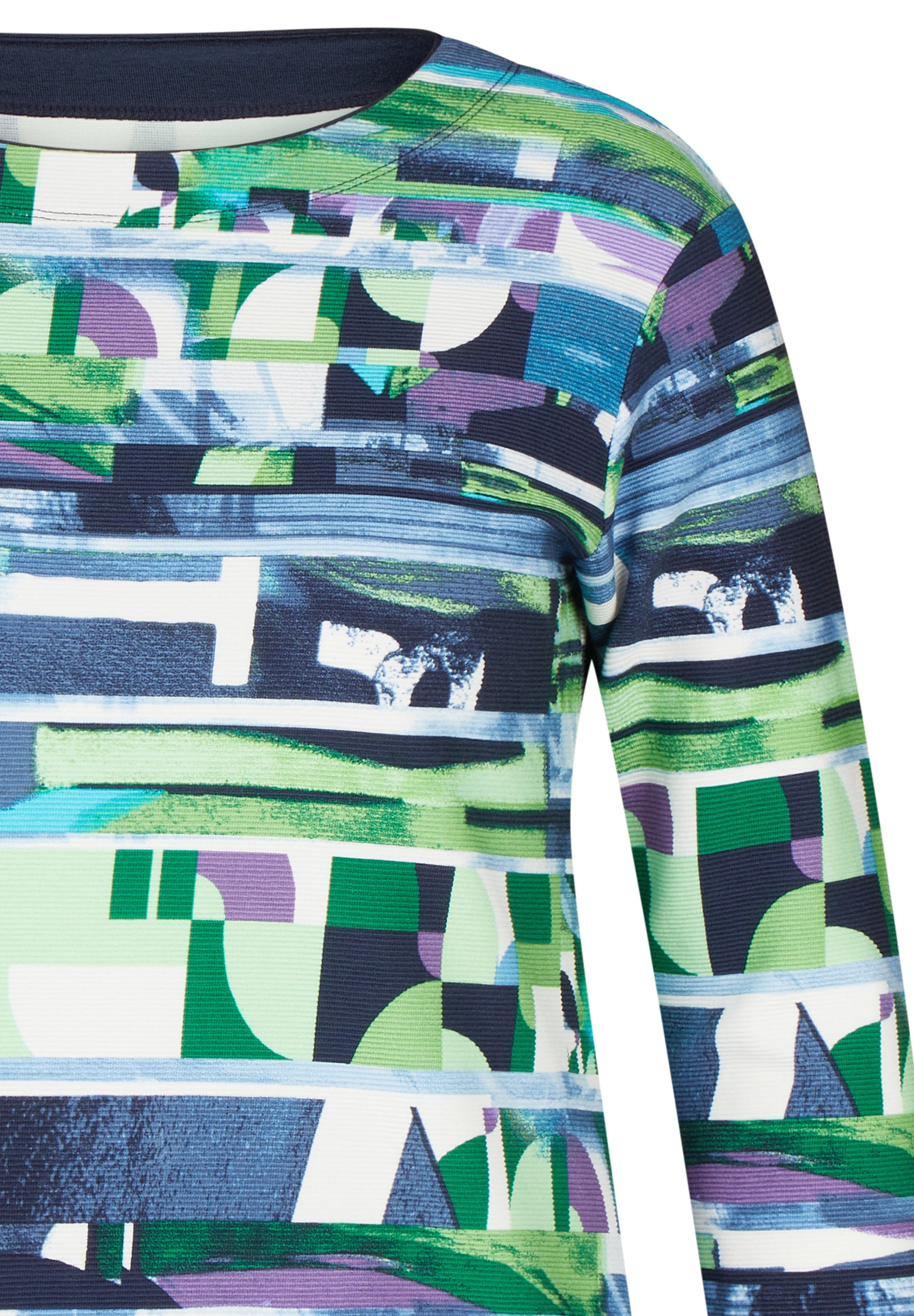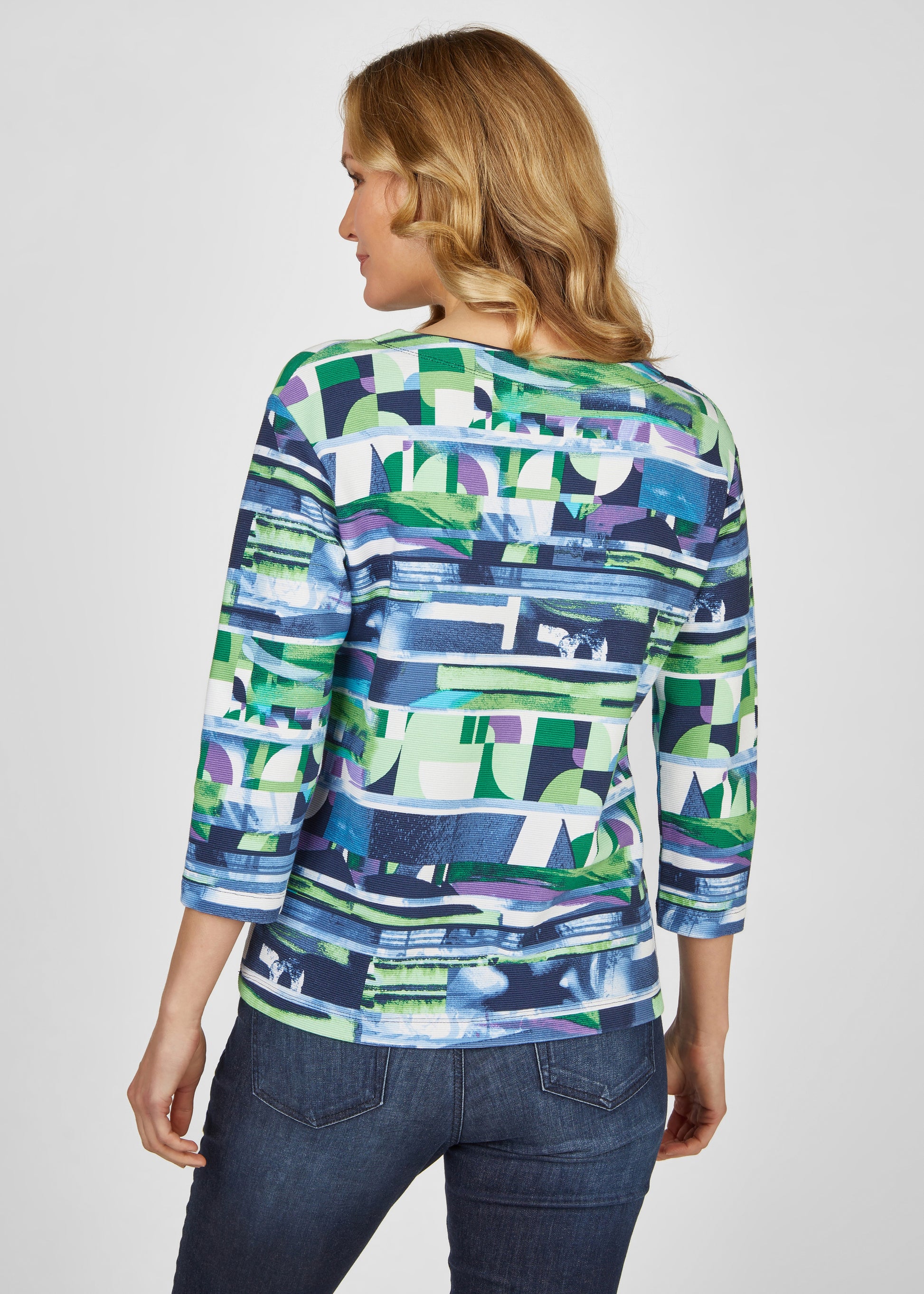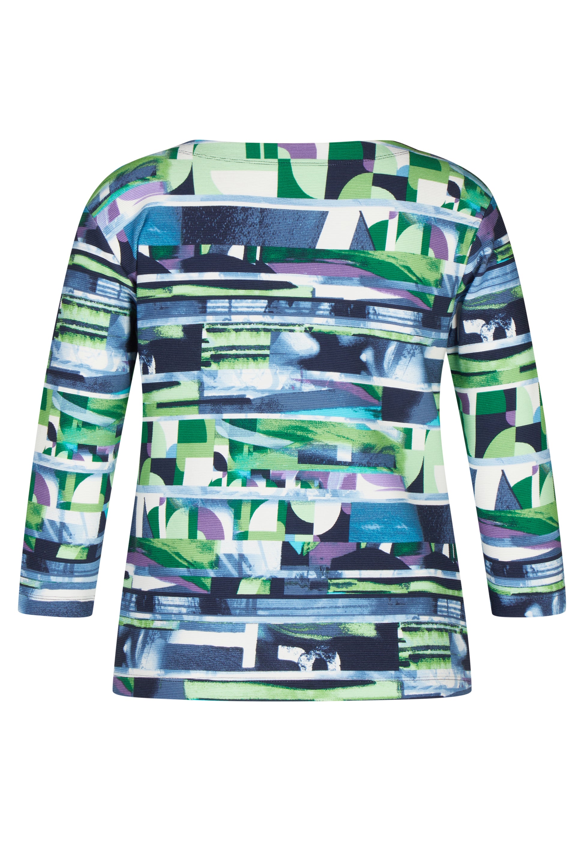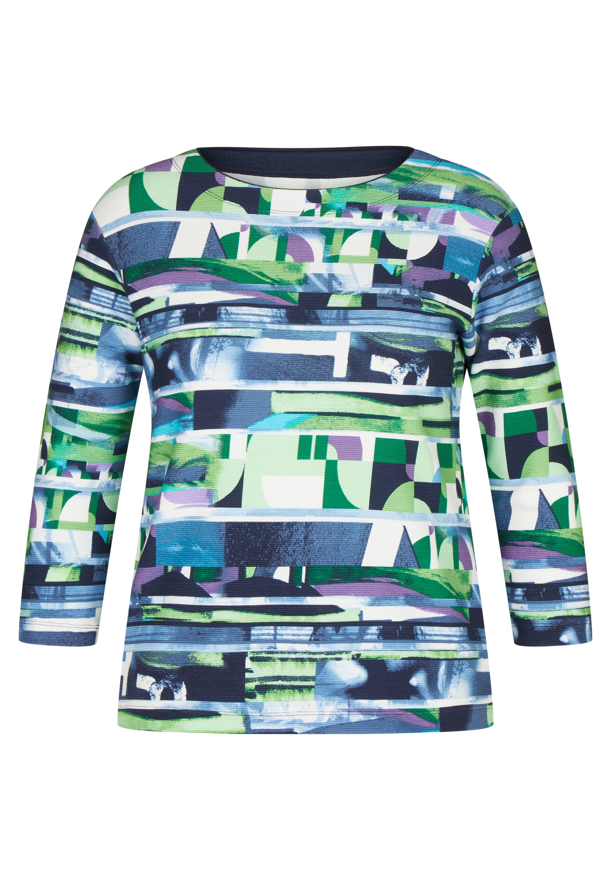Dieses gerippte T-Shirt besticht durch seine strahlend leuchtenden Farben und seinem einzigartigen Muster. Der 3/4 Arm bietet die perfekte Länge für einen lauen Sommertag. Kombinieren Sie das leicht ausgestellte T-Shirt mit einer Radlerhose und Sandaletten.76% Baumwolle, 16% Polyester, 8% Elasthan