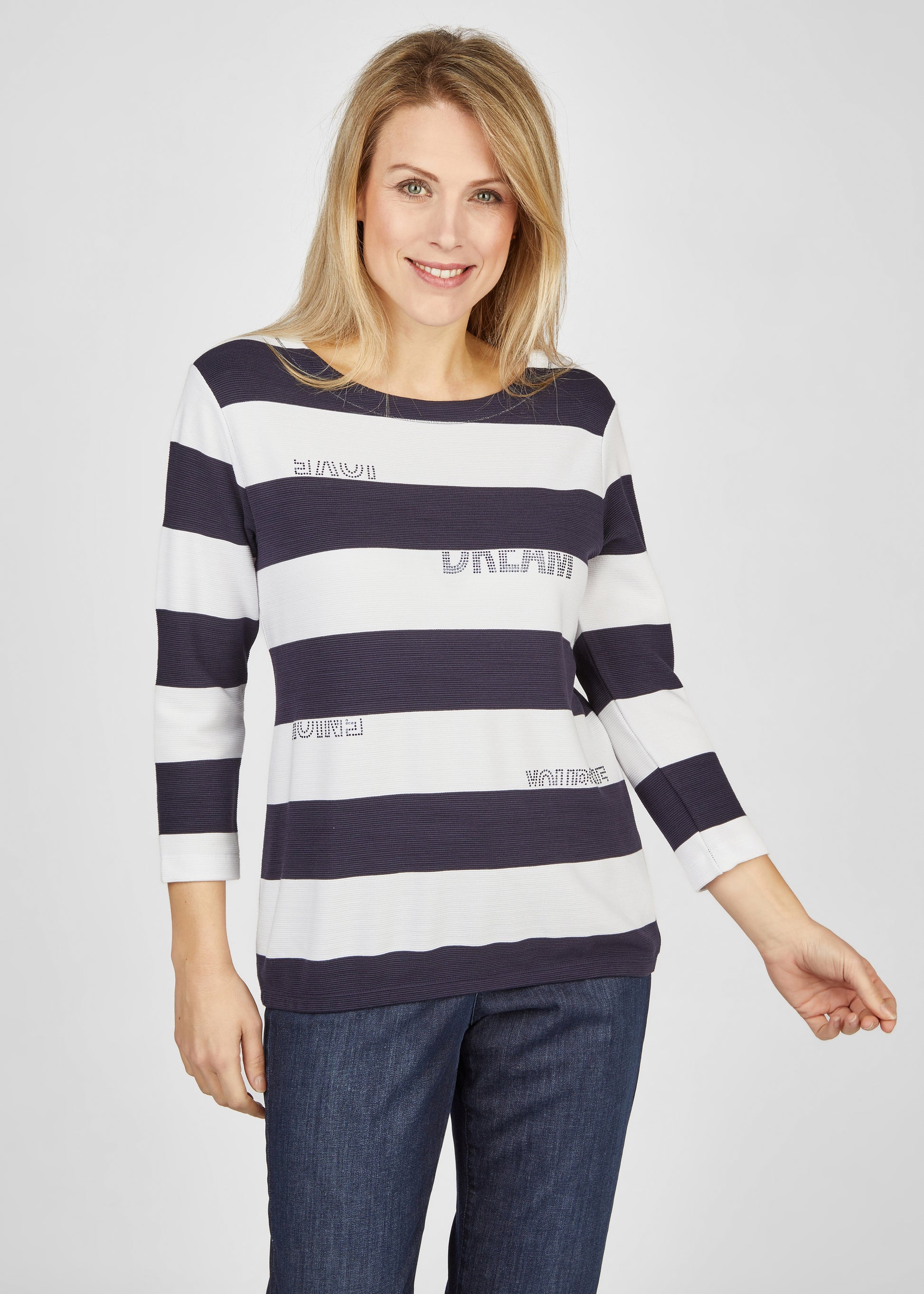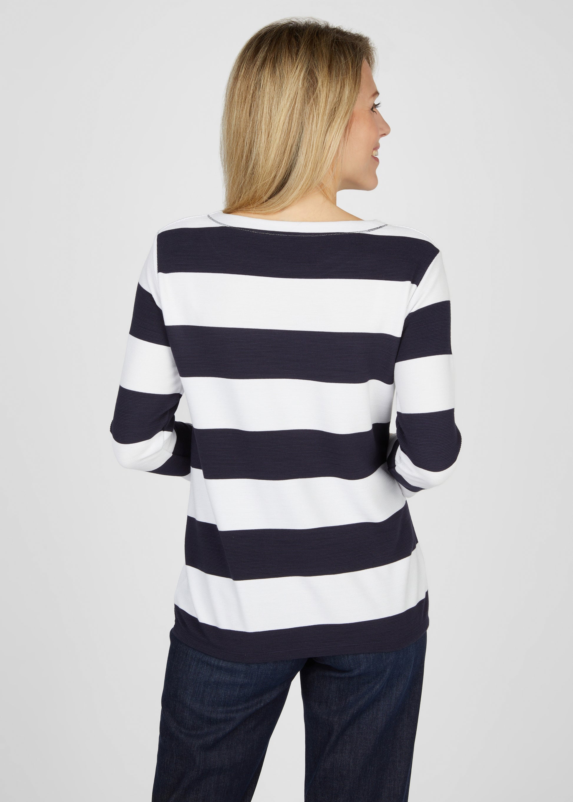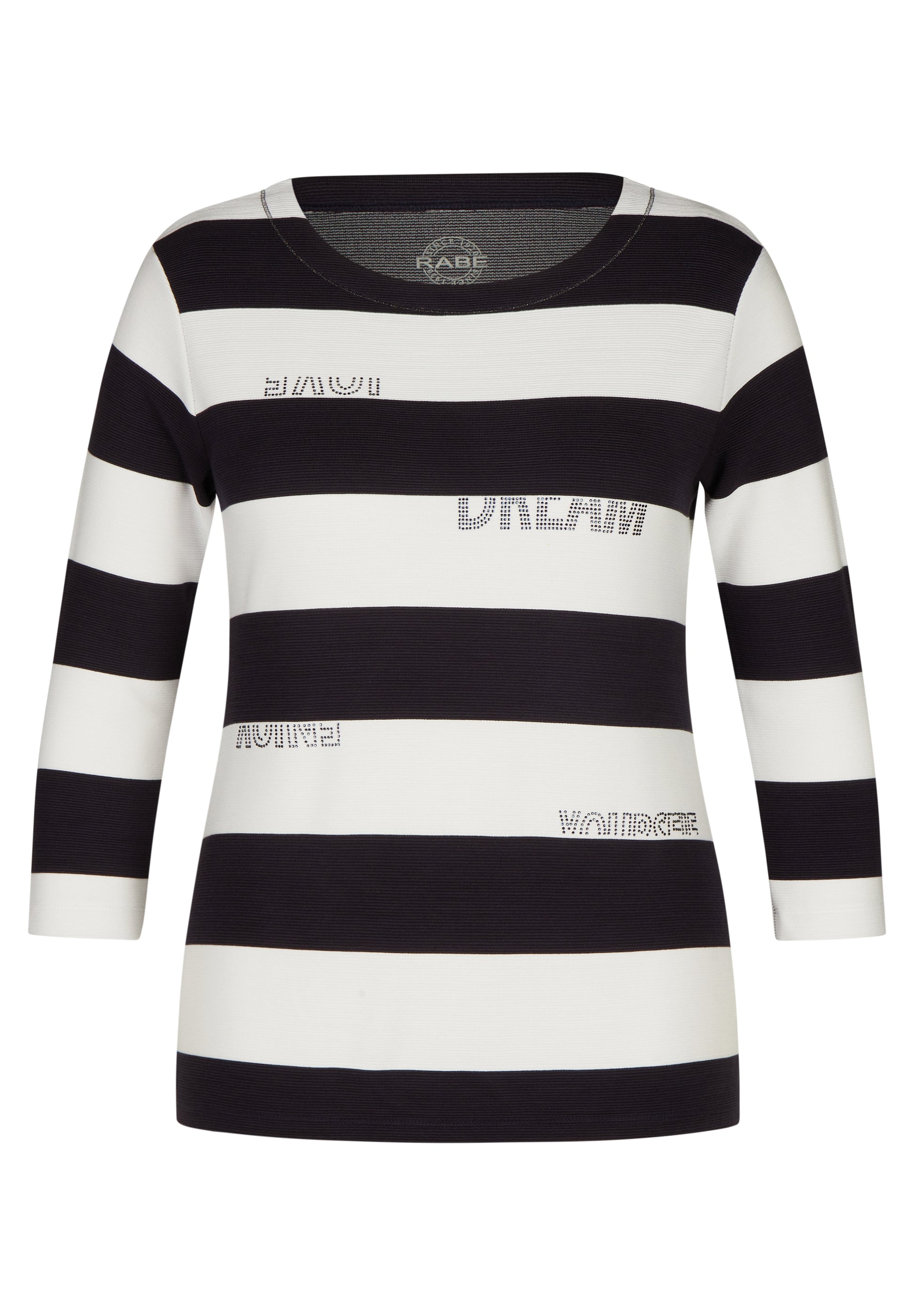 Unser Sweatshirt mit Blockstreifen ist ein modisches Kleidungsstück, das sich ideal für lässige und dennoch stilvolle Outfits eignet. Es zeichnet sich durch seine hochwertige Verarbeitung aus und bietet einen hohen Tragekomfort. Das Sweatshirt verfügt über eine ansprechende Gestaltung mit Blockstreifen, die dem Design eine moderne und trendige Note verleihen. Die Applikationen auf dem Sweatshirt sorgen für einen funkelnden Effekt und setzen stilvolle Akzente. Die gerippte Struktur des Sweatshirts verleiht ihm nicht nur einen interessanten visuellen Effekt, sondern bietet auch eine angenehme Haptik.70% Viskose, 25% Polyester, 5% Elasthan