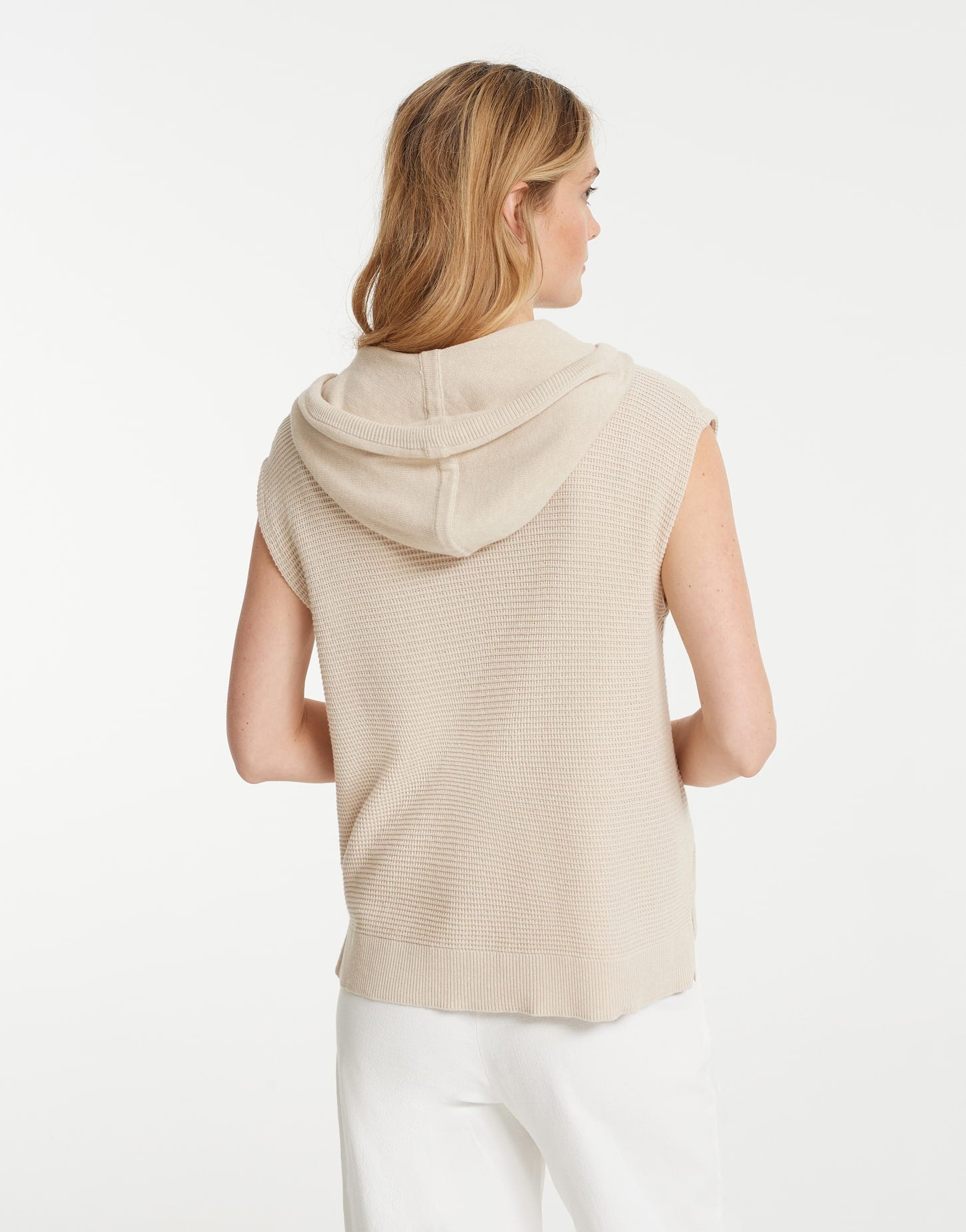 Mindful, BCI Cotton Mix, Kapuze und Zugbänder, feine Waffelstruktur, kleine Schlitze in den Seiten, weiter Body, Nullarm, das Model ist 176 cm groß und trägt Größe 3655% Polyacryl, 45% Baumwolle