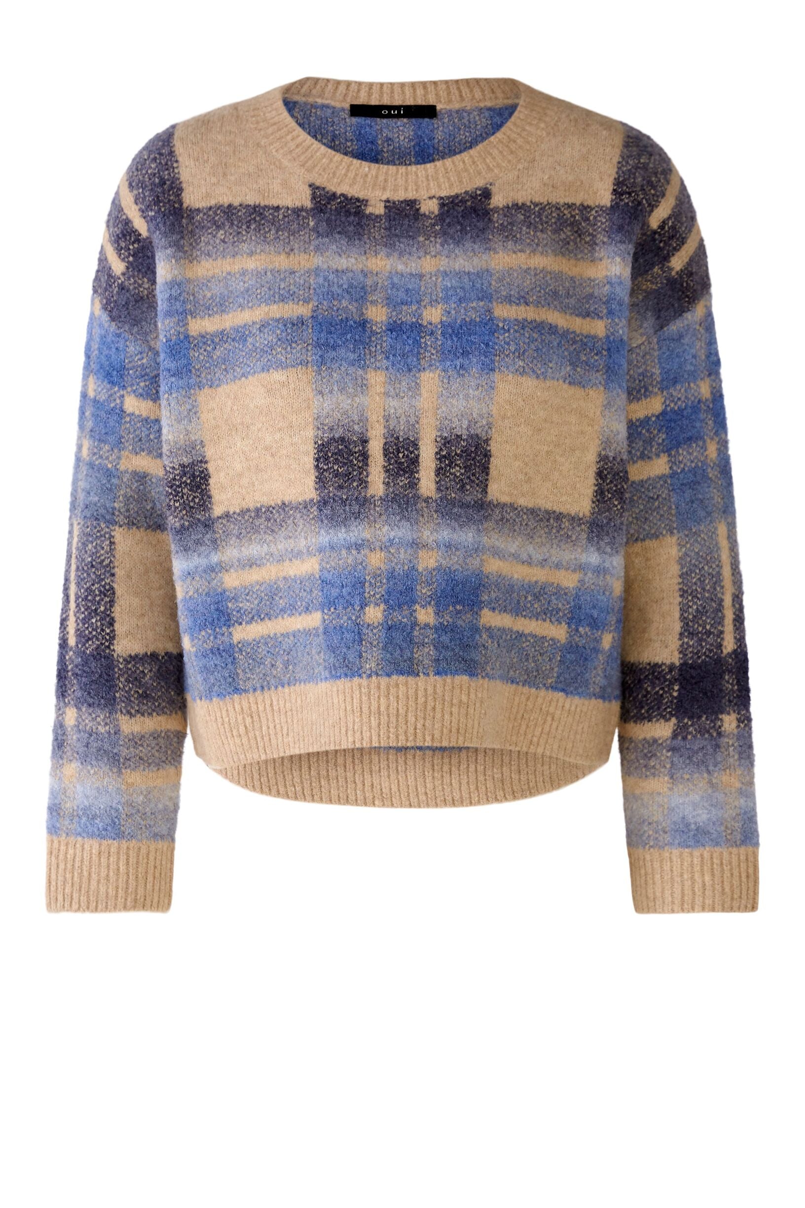 Zwei Garnqualitäten werden zu einem Karomuster verstrickt, daraus resultiert diese besondere Optik