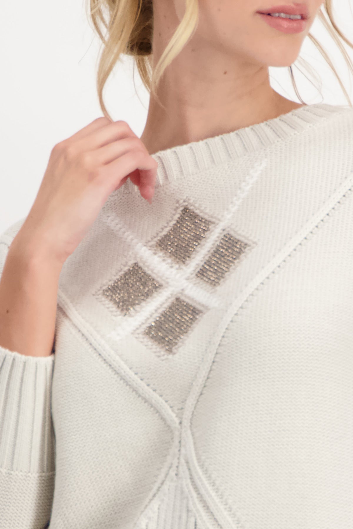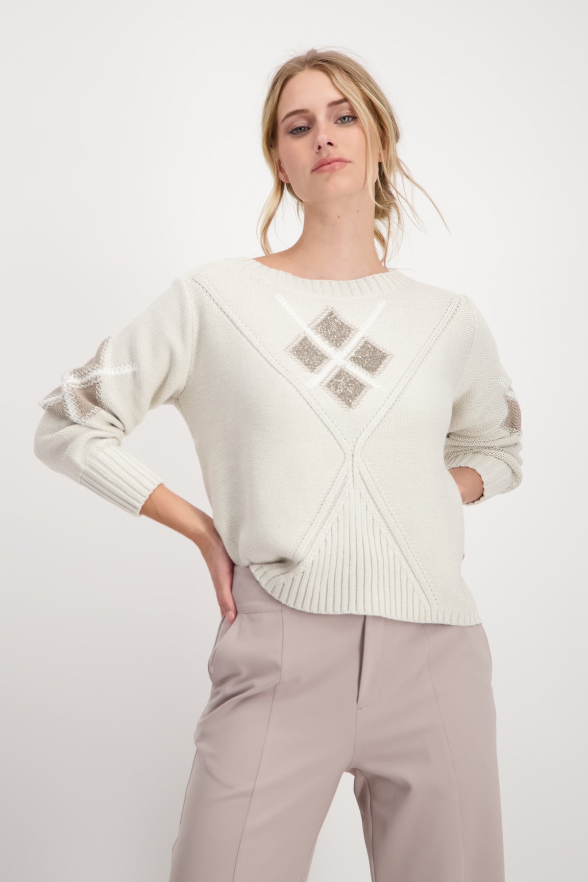 Ein besonderes Highlight dieses qualitativ hochwertigen Pullovers sind die geschmückten Rauten, die mit Strass veredelt sind.50% Baumwolle, 50% Polyacryl