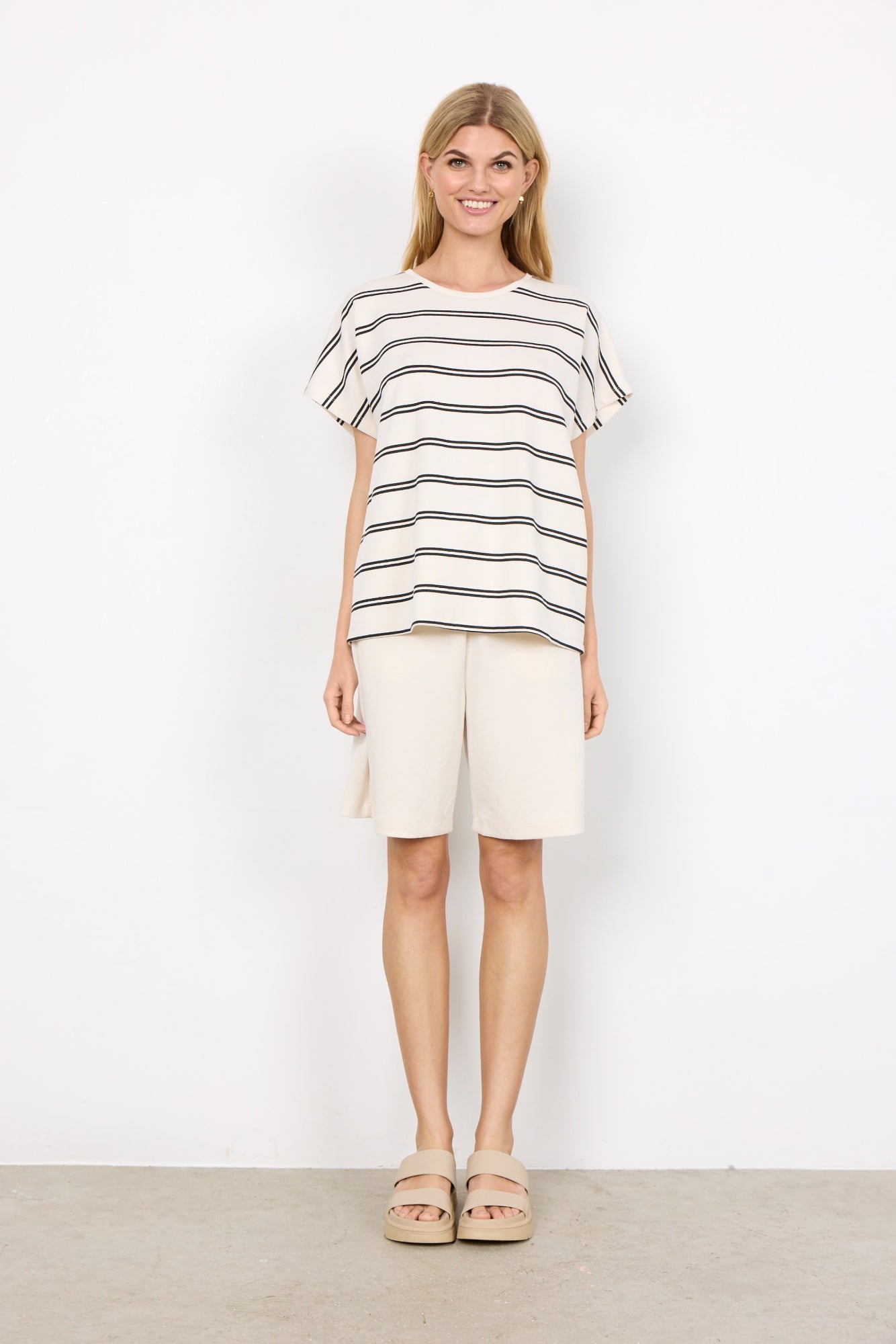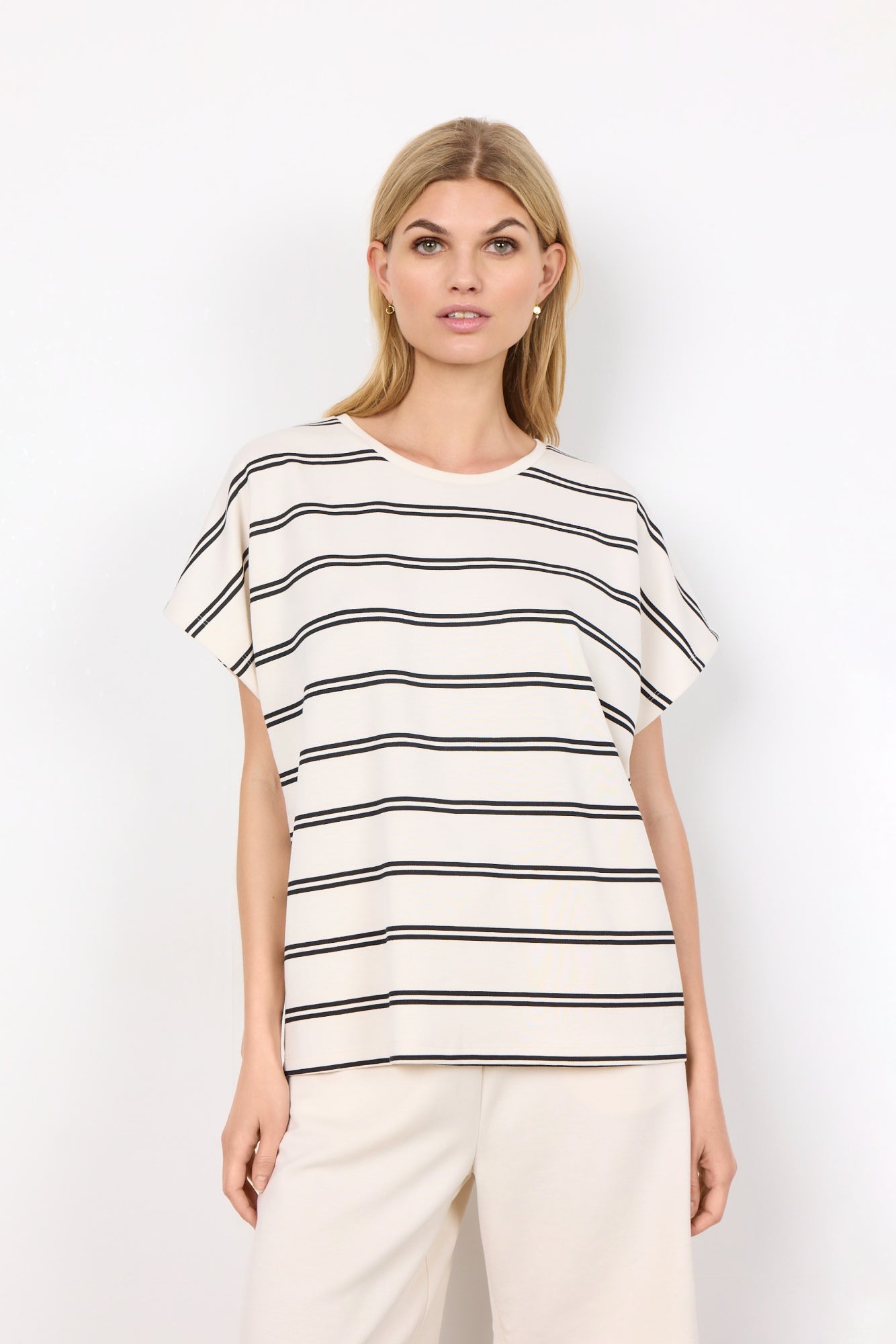 SC-Barni 17 ist ein lässiges T-Shirt aus einer schönen Mischung aus Modal, Polyester und Elasthan. Das Oversized-T-Shirt hat eine Sweat-Qualität, einen Rundhalsausschnitt, kurze Ärmel und ein Streifenmuster. Kombiniere dieses T-Shirt mit einer Shorts und Sneakers für einen lässigen Look.48% Modal, 48% Polyester, 4% Elasthan