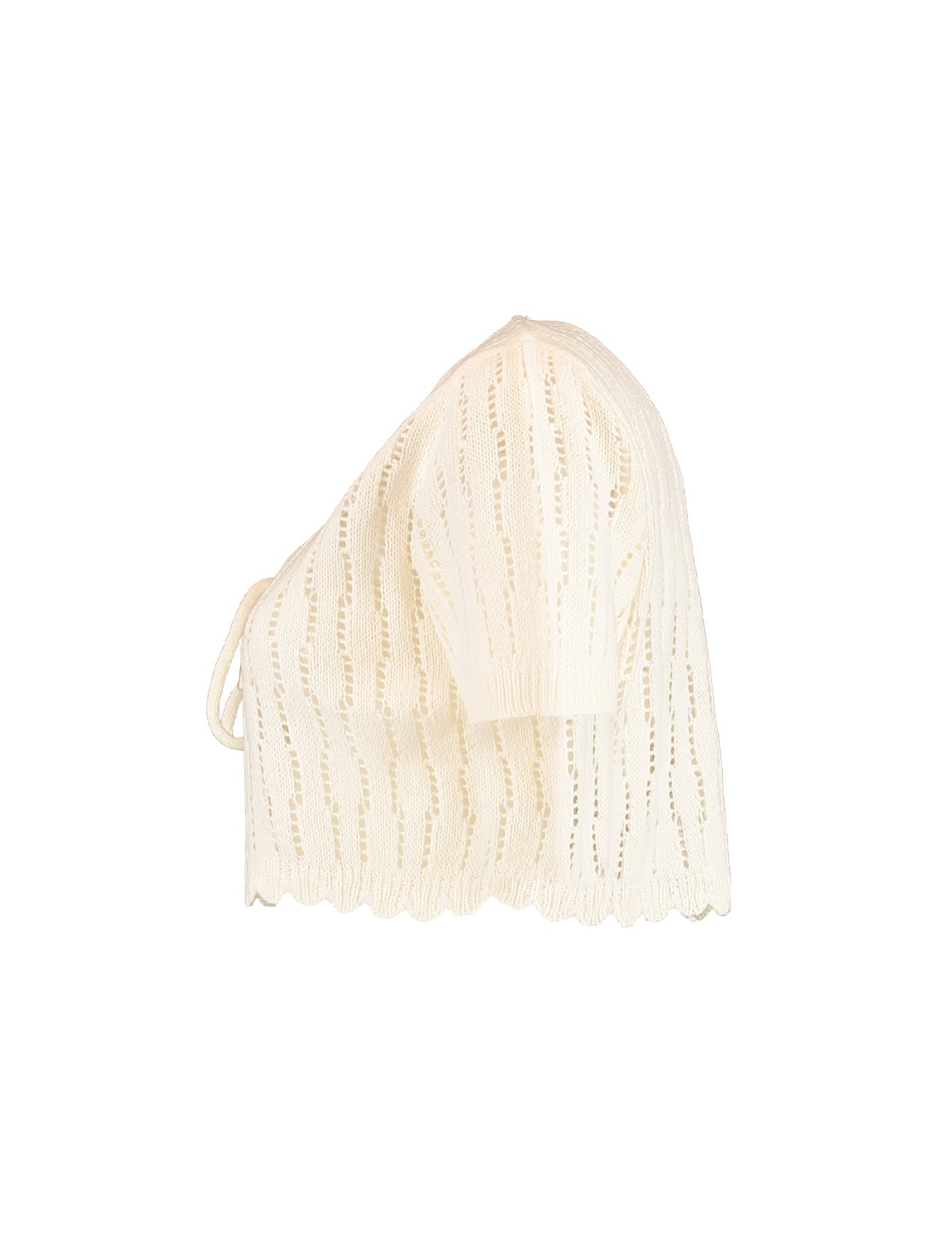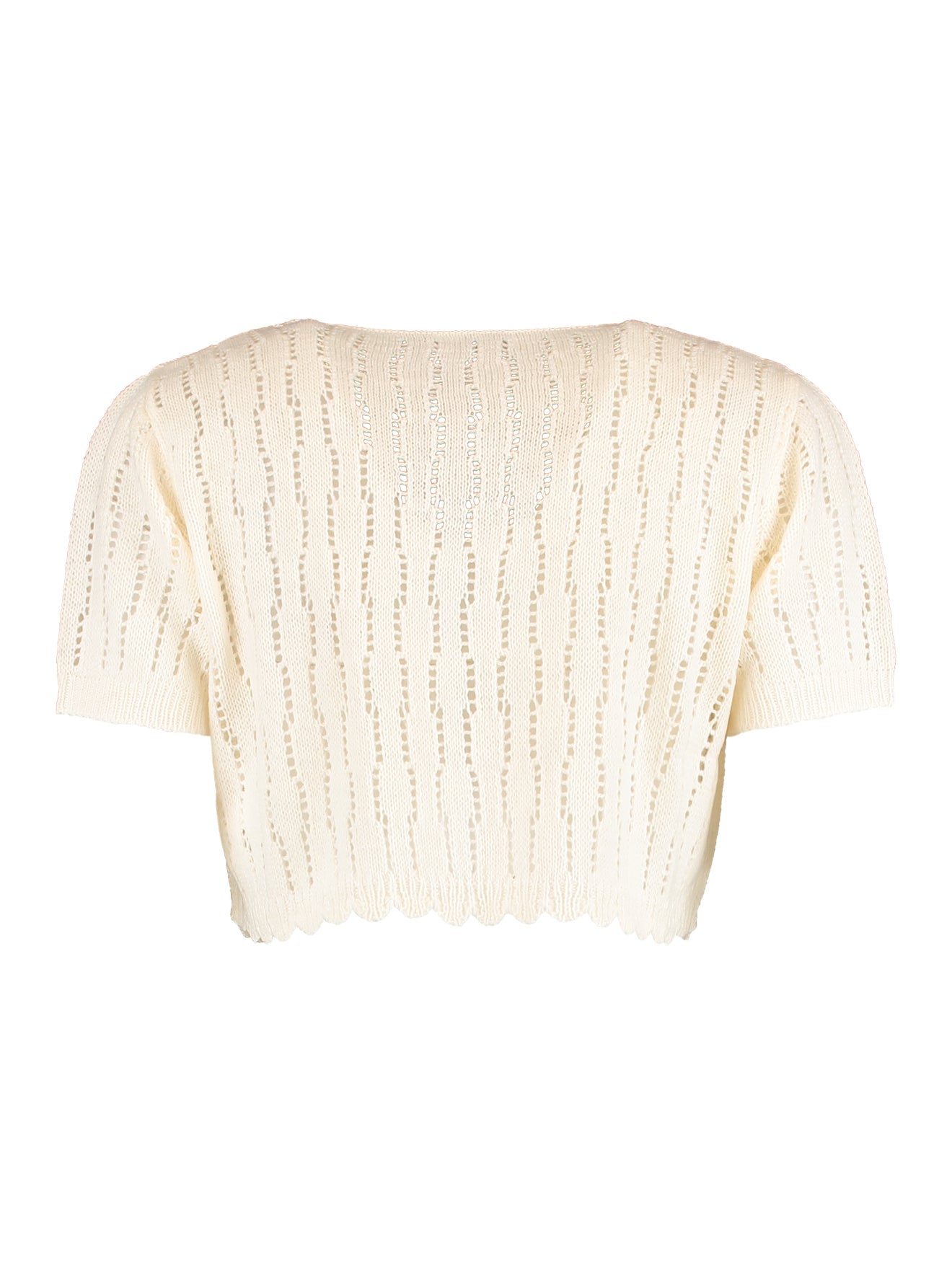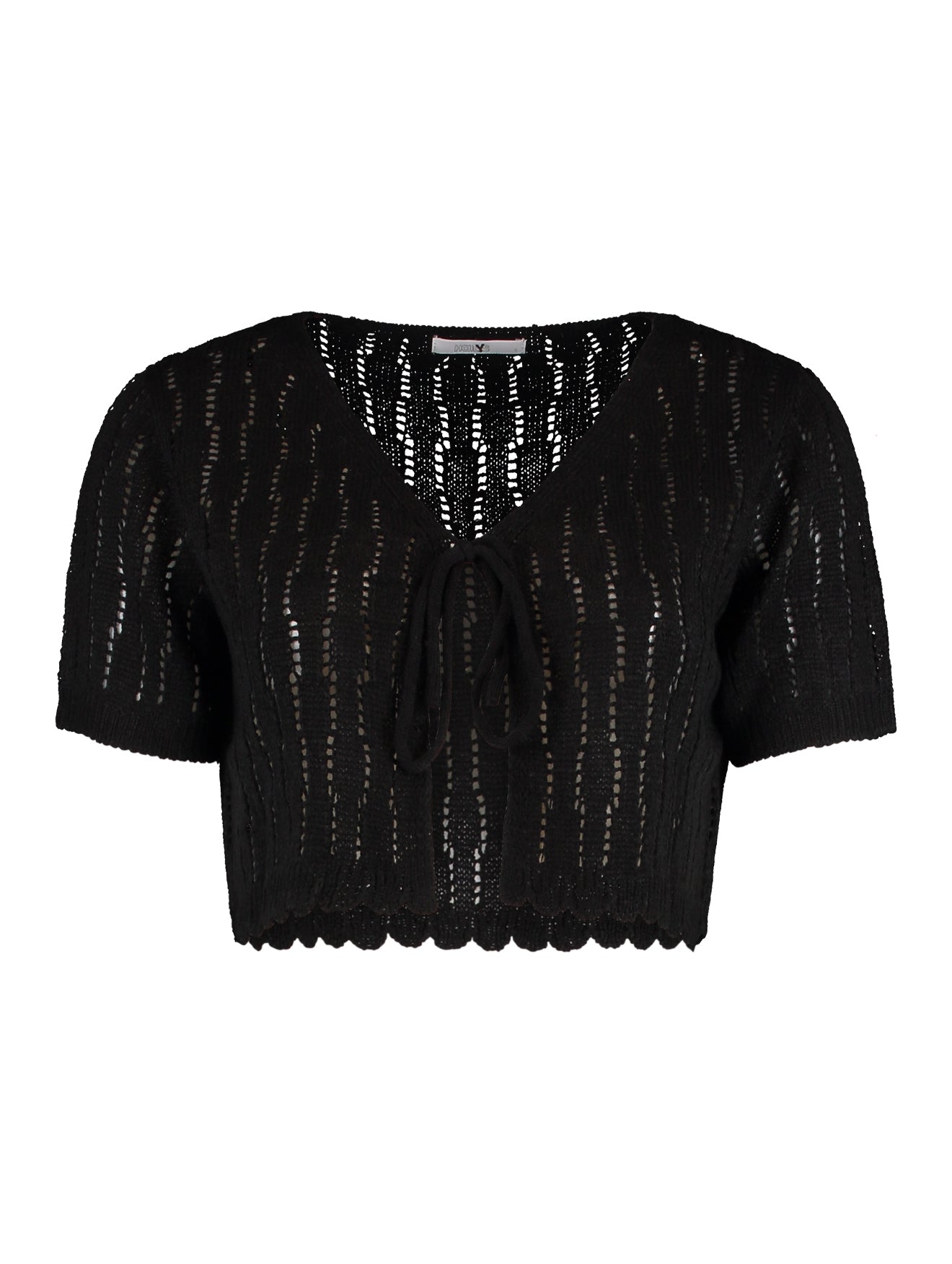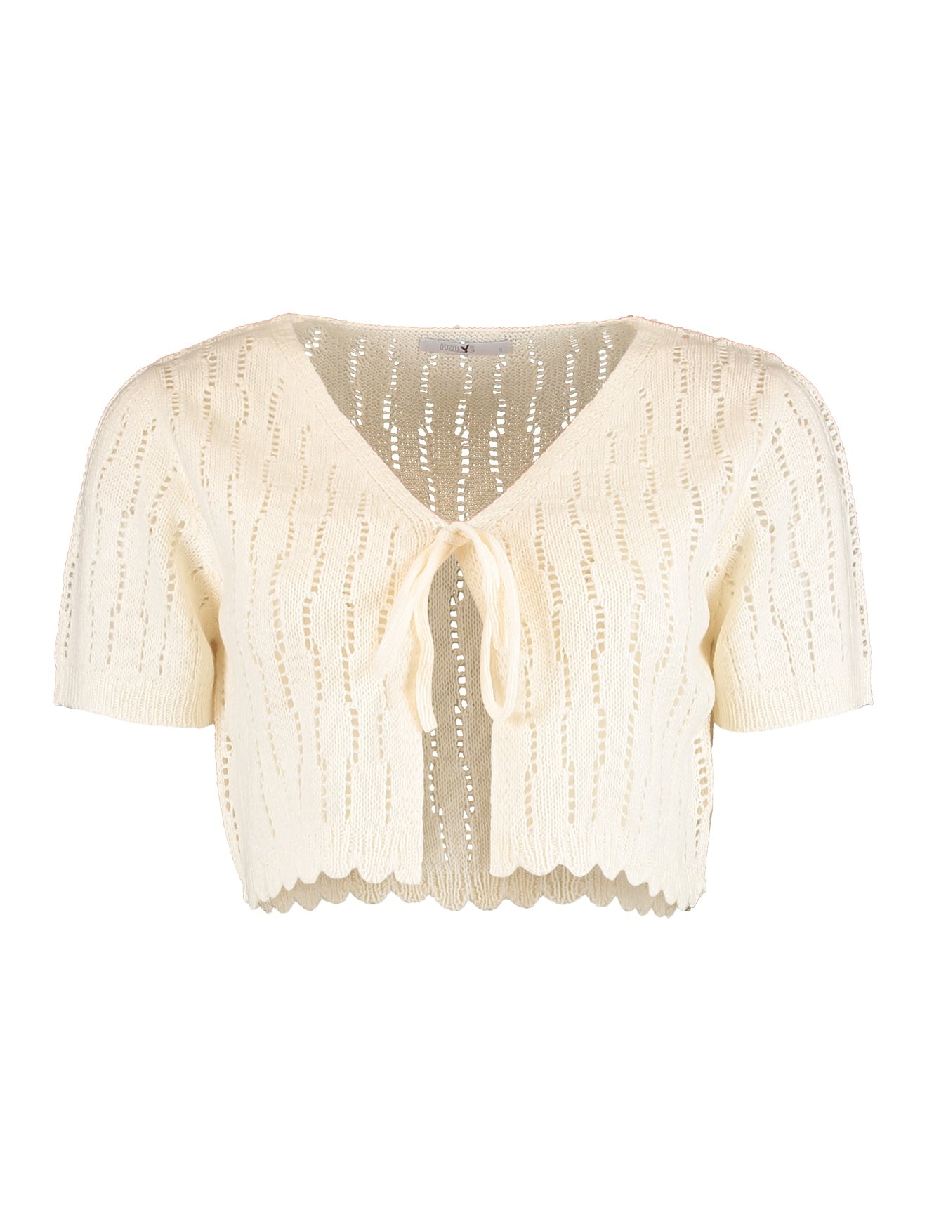 Kurzes Strickoberteil in Ajourstrickoptik mit kurzen Ärmeln und einer Schleife in der vorderen Mitte.100% Polyester