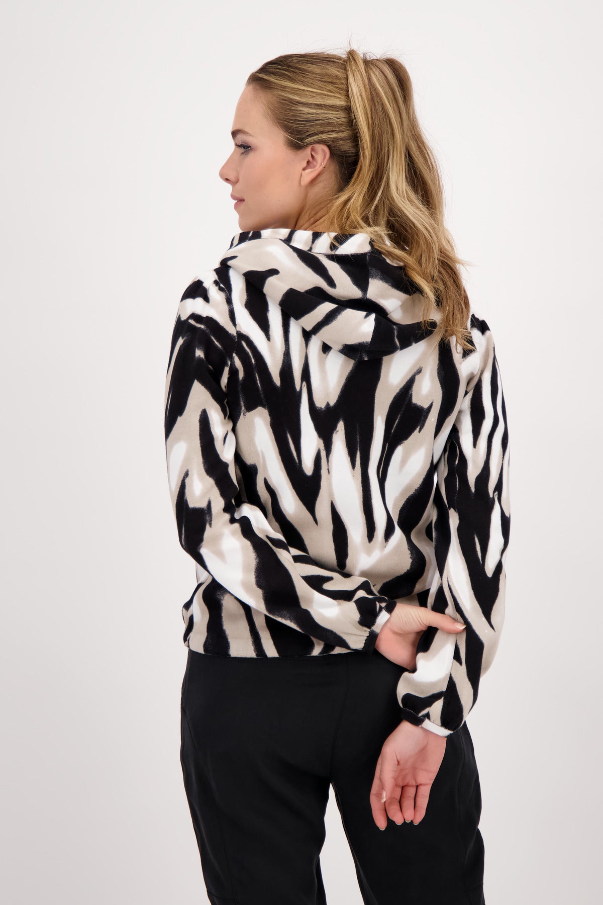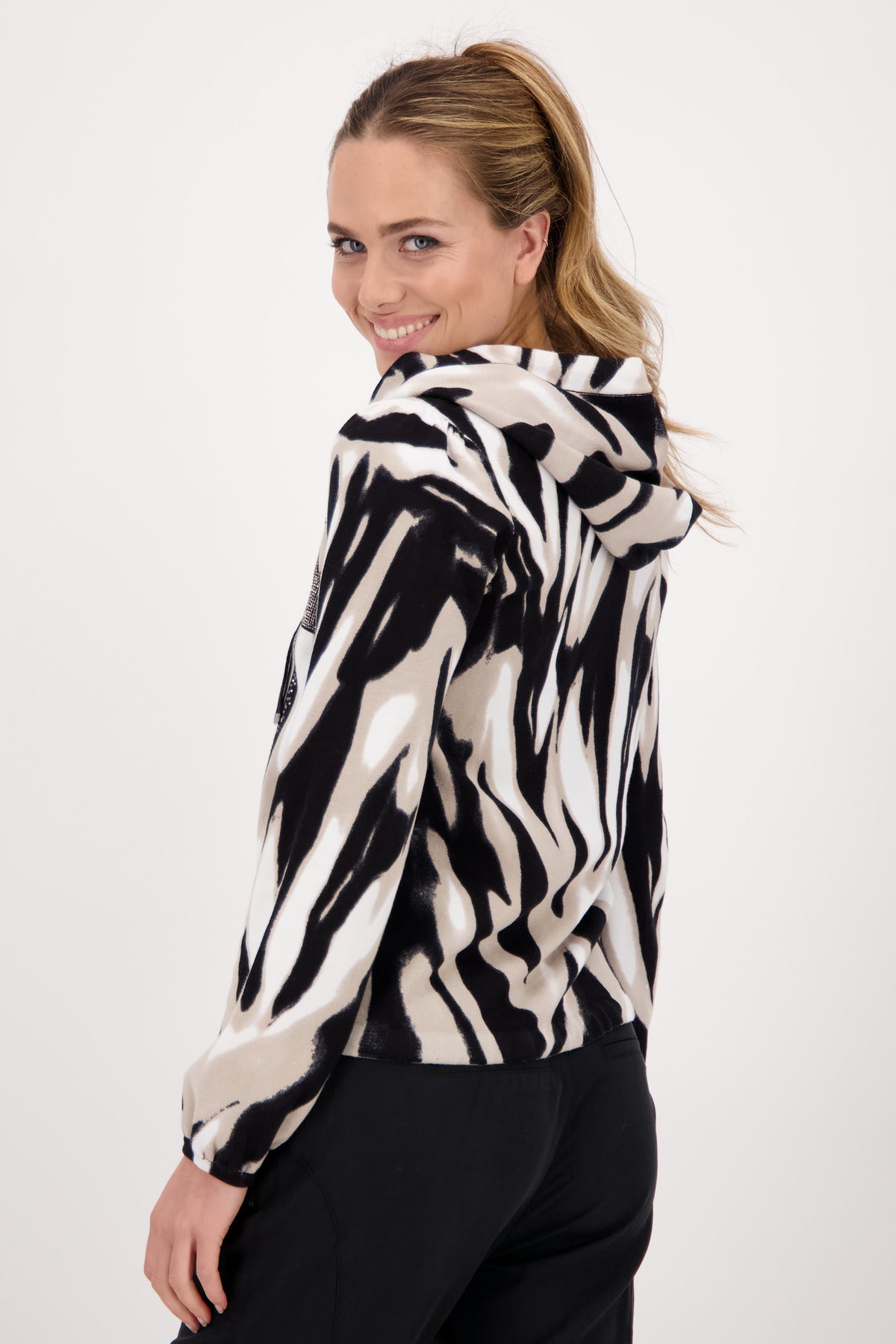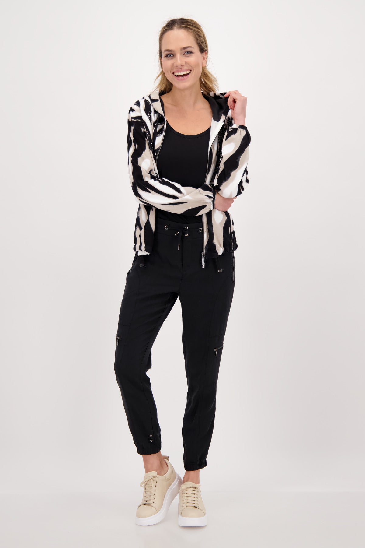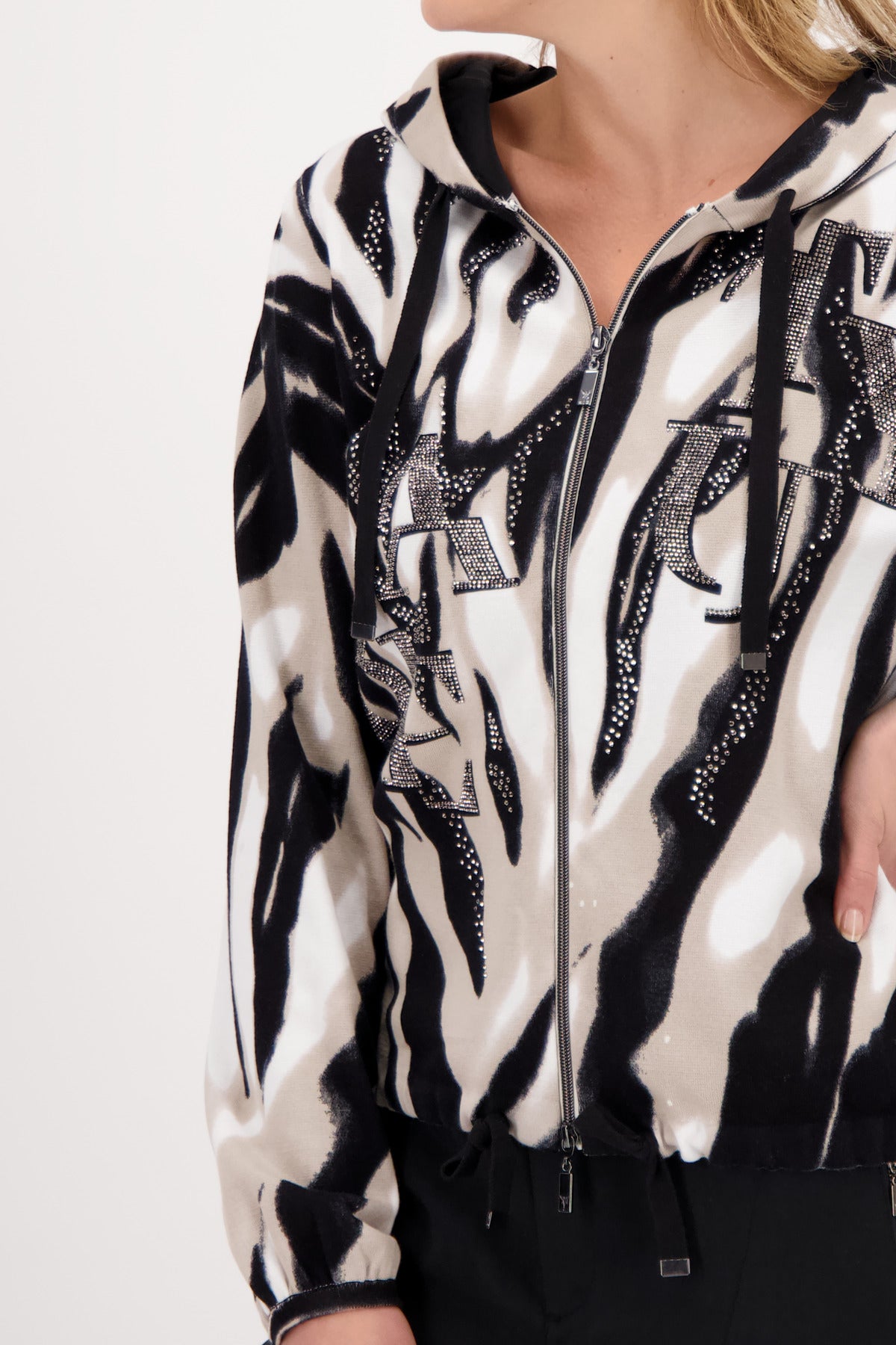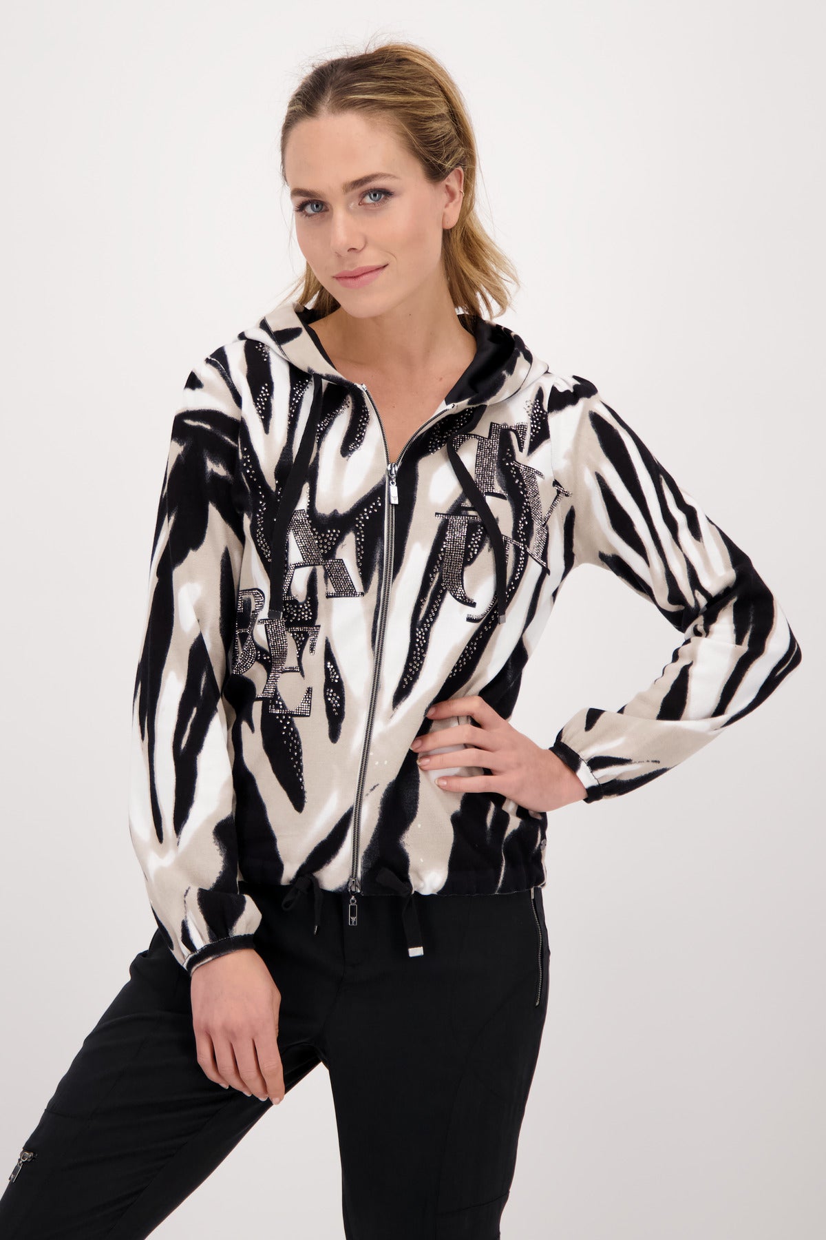 Die Strickjacke von monari erhält durch den verspielten animal print mit Glitzerschrift auf der Vorderseite ein erfrischendes Update. Die Regular Fit Form mit Kapuze, einem 2-Wege Reißverschluss sowie ein Saum mit Tunnelzug und Band zum Binden, setzen dabei ein perfektes Finish. Der Langarm endet mit einem kleinen Bündchen mit Falten am Ärmelsaum, während sich auf der Innenseite der coolen Kapuze Satin Qualität befindet. Erweitern Sie Ihre Garderobe um diese raffinierte Kapuzenjacke. Zur dunklen Jogpants ist das Tigermuster ein echter Blickfang.100% Baumwolle; 100% Polyester