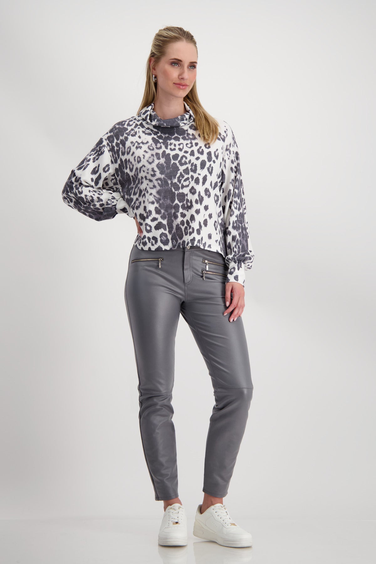 Dieses Sweatshirt mit trendigem Schneeleomuster besticht durch seinen Stehkragen, den leicht überschnittenen Langarm und die breiten Ärmelbündchen.Außenmaterial: 82 % Polyester, 15 % Viskose, 3 % Elasthan