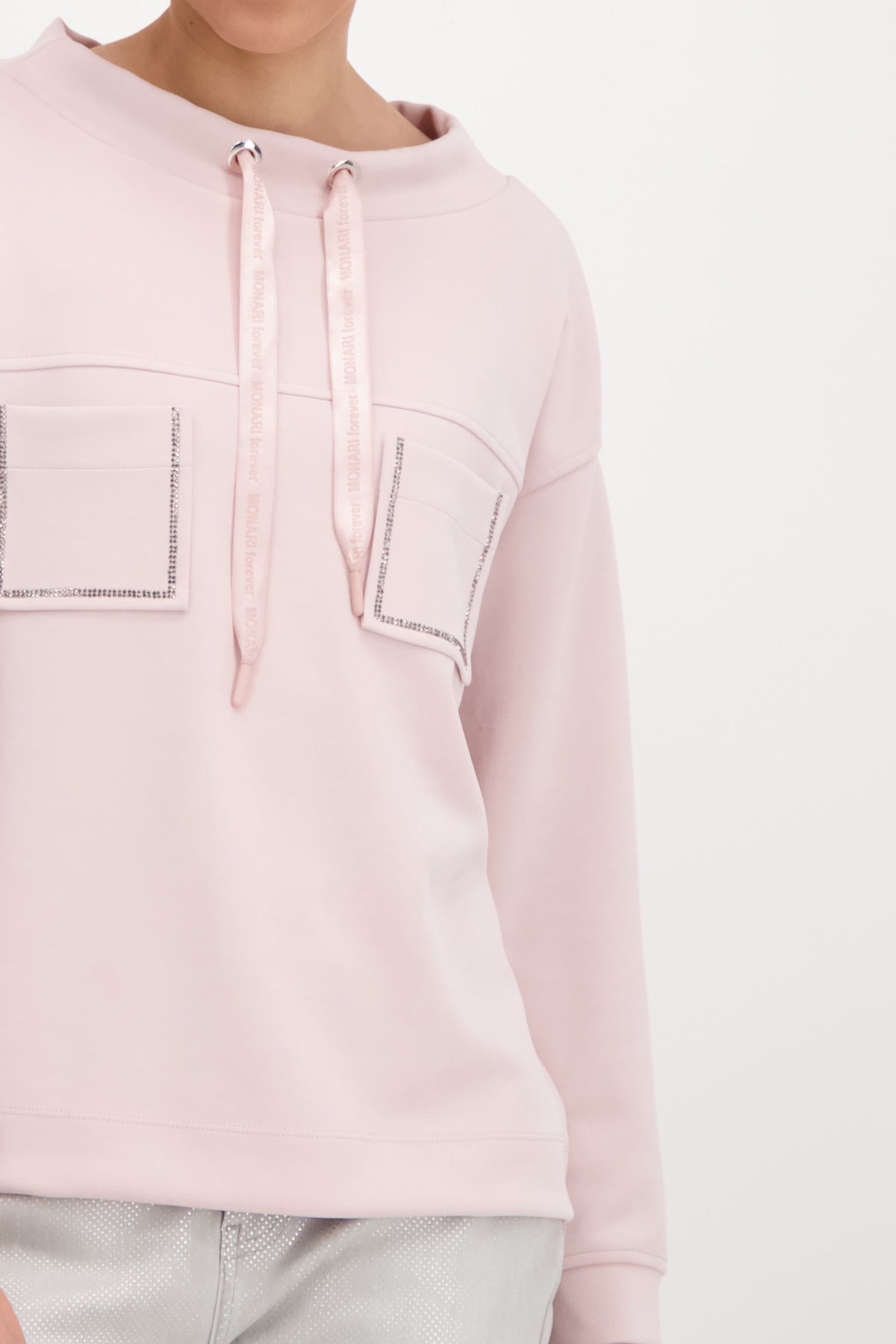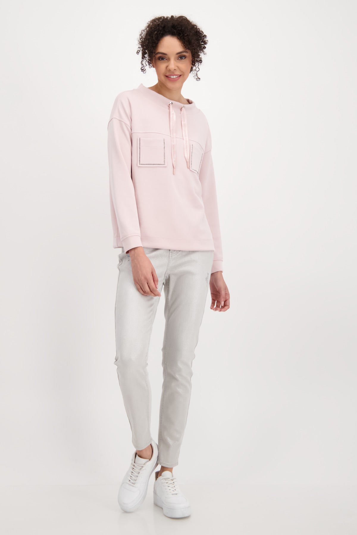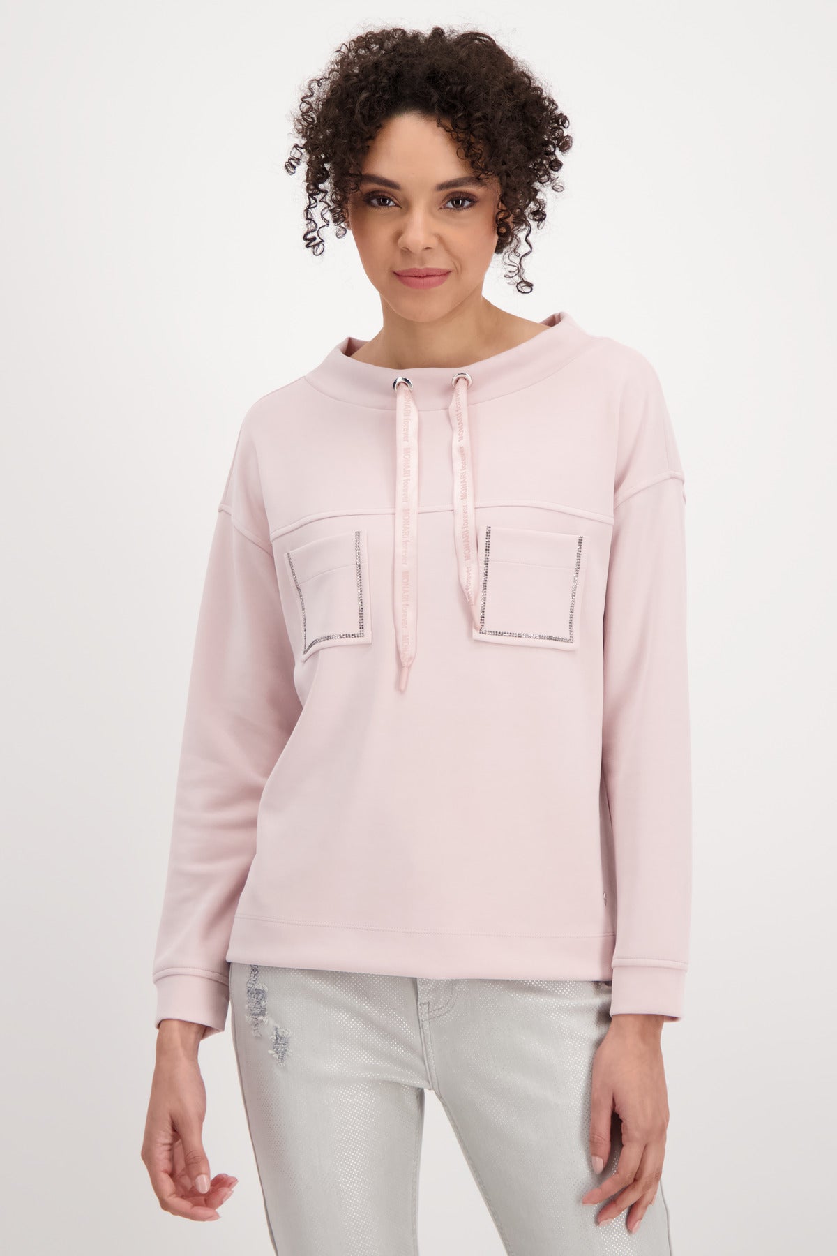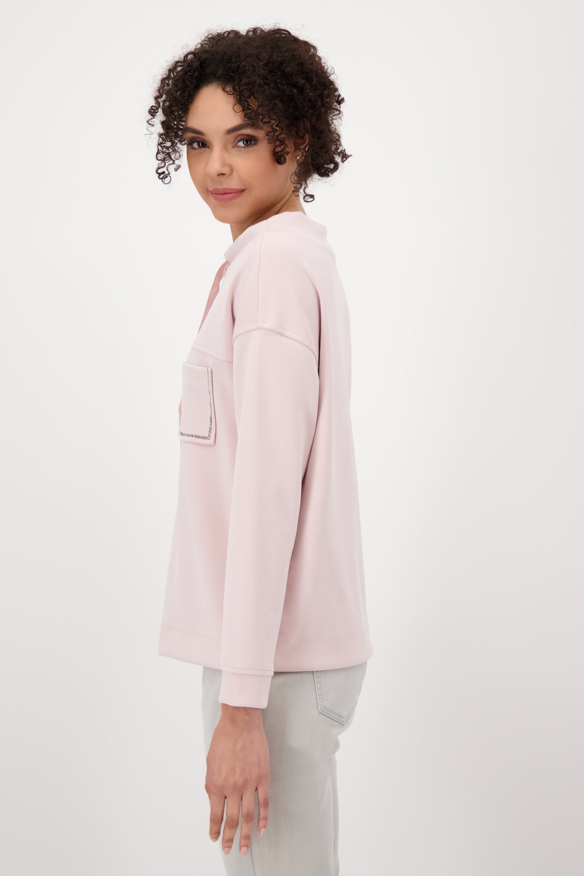 Die softe Qualität dieses schönen monari Sweatshirts fühlt sich unfassbar gut auf Ihrer Haut an. Der Fit: gerade geschnitten mit breiten Bündchen an Ärmelenden und am Saum, einem Stehkragen mit glänzendem Satinband mit 3-D-Wording und leicht überschnittenen Schultern. Die Vorderseite präsentiert sich modisch mit zwei aufgesetzten Taschen mit funkelndem Strassrahmen auf Brusthöhe und einer Passennaht. Ein wahrer Allrounder!55% Modal, 40% Polyester, 5% Elasthan