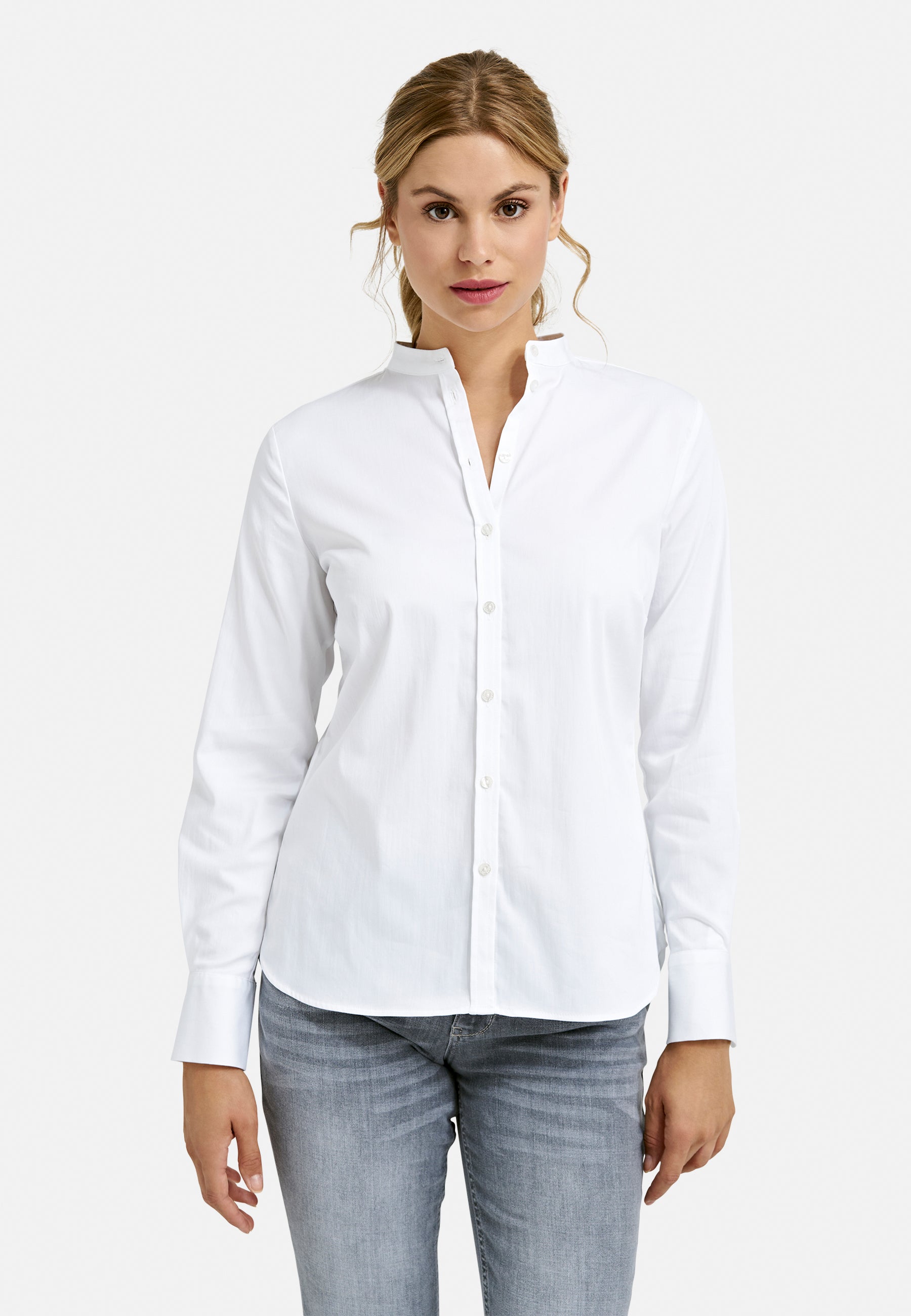 Blouse w stand up collar, placket, rounded hem + 1/1 sleeve