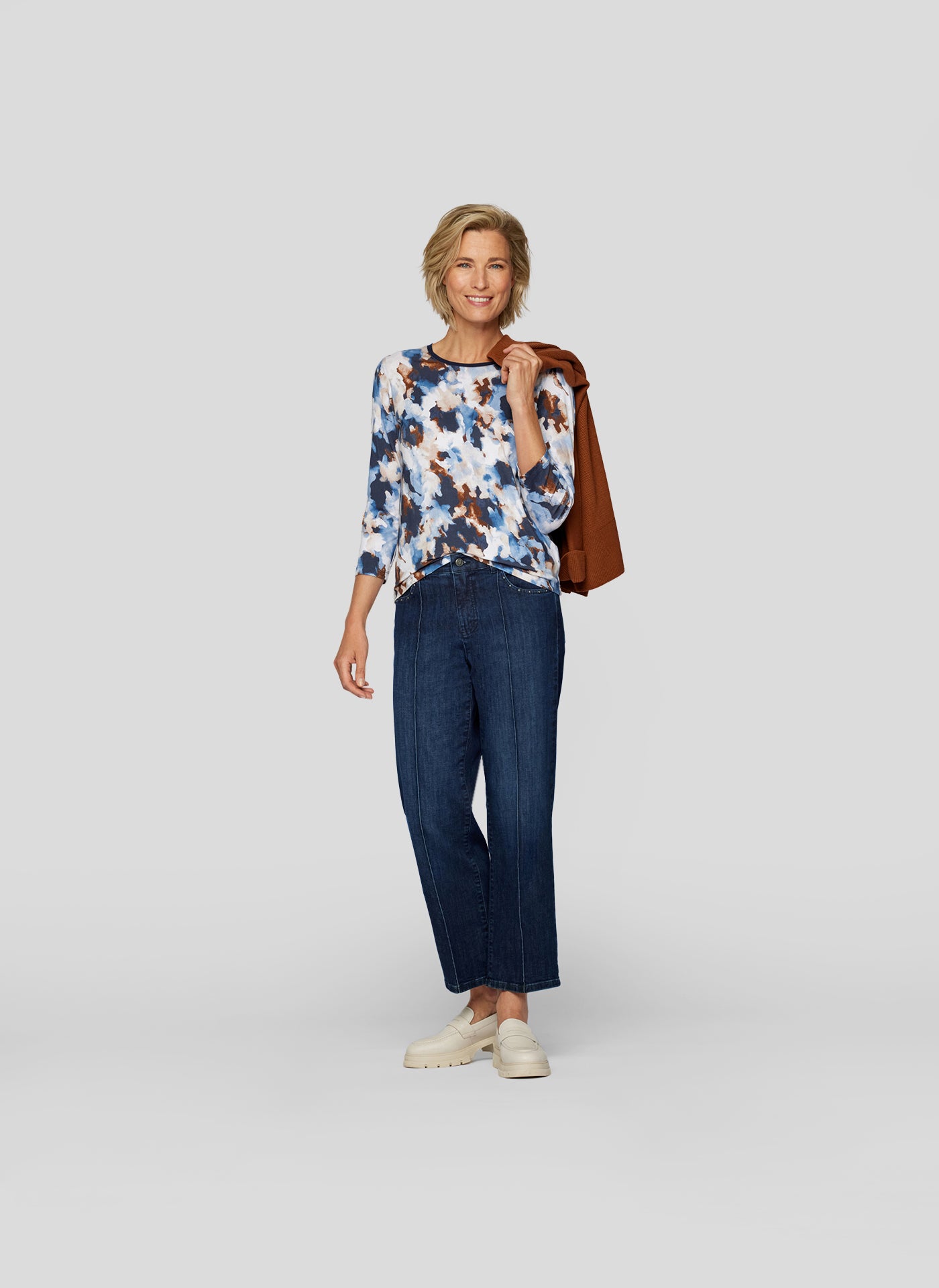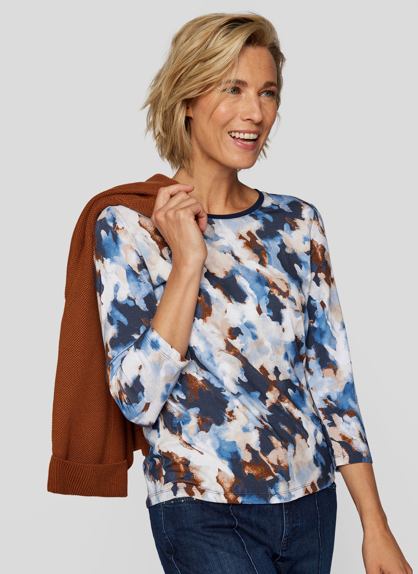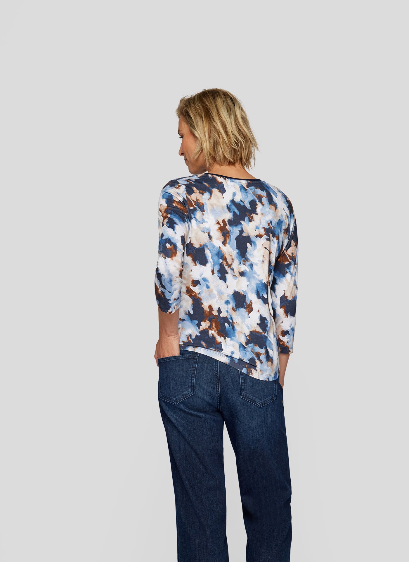 Entdecken Sie das perfekte Oberteil für jeden Anlass mit unserem stilvollen 3/4-Arm-Shirt im künstlerischen Design! Kreative Farbkombination aus Blau, Weiß und Braun für einen einzigartigen Look. Perfekt für Freizeit, Büro oder besondere Anlässe. Verleihen Sie Ihrer Garderobe einen Hauch von Kunst und Eleganz mit diesem außergewöhnlichen Shirt!96 % Viskose, 4 % Elasthan