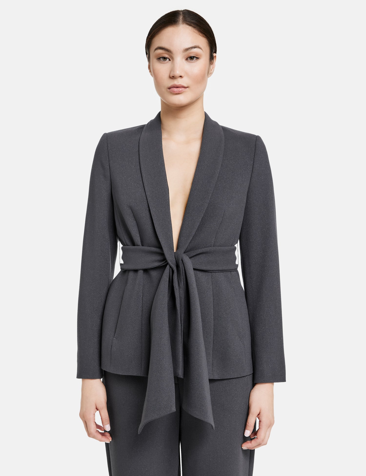 Bindegürtel. Passende Hose Art. 11_420432-11351. Bereit für einen stilvollen Auftritt? Unser Blazer mit Glitzer-Effekt und innovativer Knotentechnik verleiht deinem Look eine Extraportion Glamour. Die Taille wird auf subtile Weise inszeniert, während die feine Qualität mit Stretchkomfort für ein angenehmes Tragegefühl sorgt. Dieser Blazer ist die perfekte Ergänzung zur passenden Hose und wird zu deinem Go-to-Piece für elegante Anlässe!Futter: 52 % Polyester, 48 % Viskose; Außenmaterial: 69 % Polyester, 28 % Viskose, 3 % Elasthan; 100 % Polyester