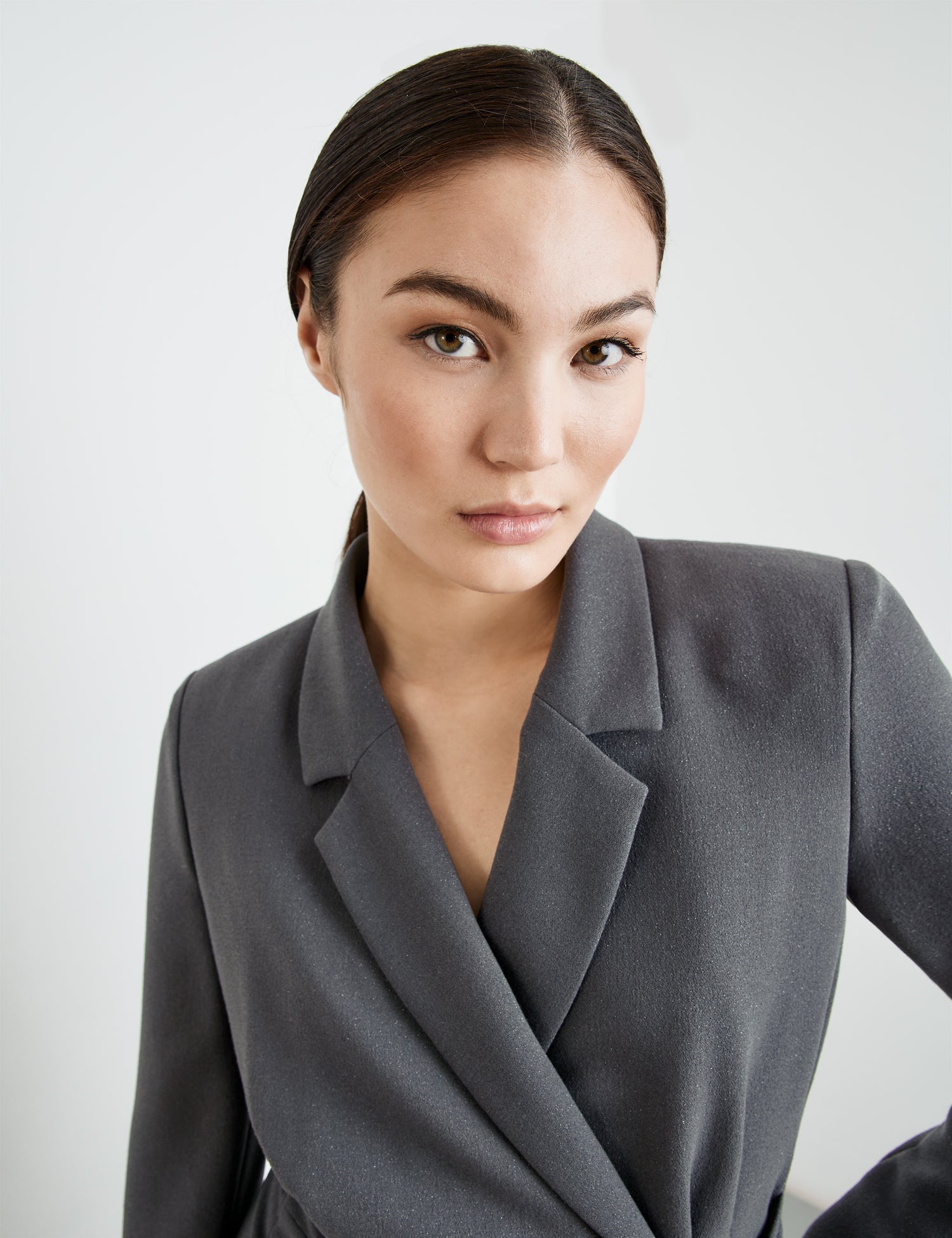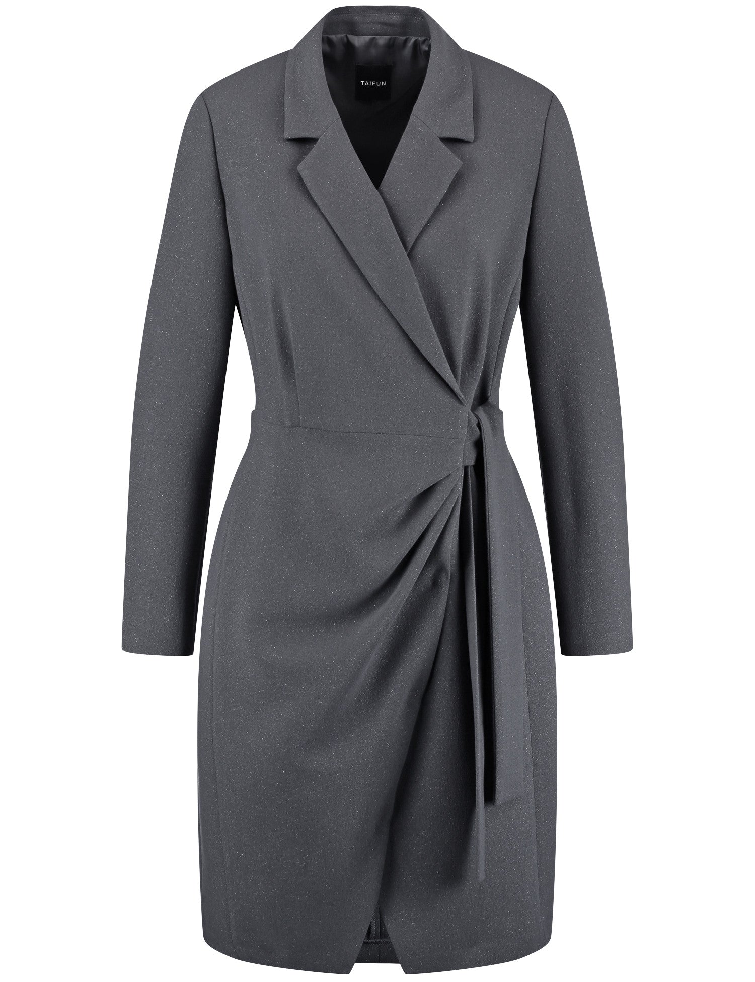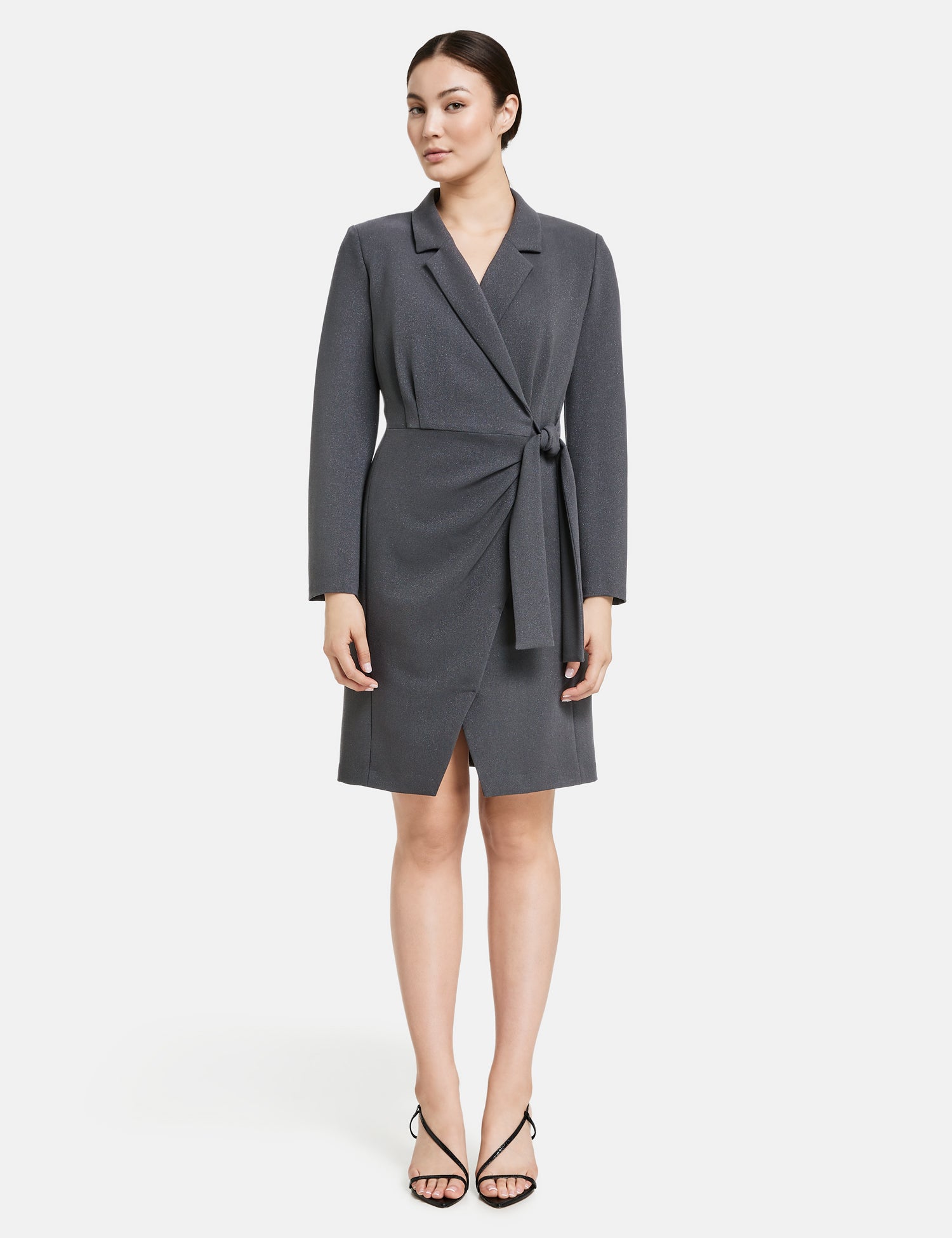 Verdeckte Druckknöpfe am Wickel im Rockteil. Seitlich gebunden. Sei die Königin der Nacht in unserem festlichen Blazerkleid! Mit dem seitlich gebundenen Wickel zauberst du ein atemberaubendes Dekolleté, während das überlappende Rockteil mit Druckknöpfen fixiert ist, damit du dich immer sicher fühlst. Die elegante Qualität mit Glitzer-Effekt verleiht dir den nötigen Glamour und der elastische Komfort sorgt für Bequemlichkeit. Zeig deine glamouröse Seite und rocke die Party!Futter: 52 % Polyester, 48 % Viskose; Außenmaterial: 69 % Polyester, 28 % Viskose, 3 % Elasthan