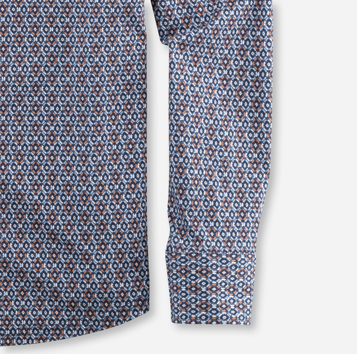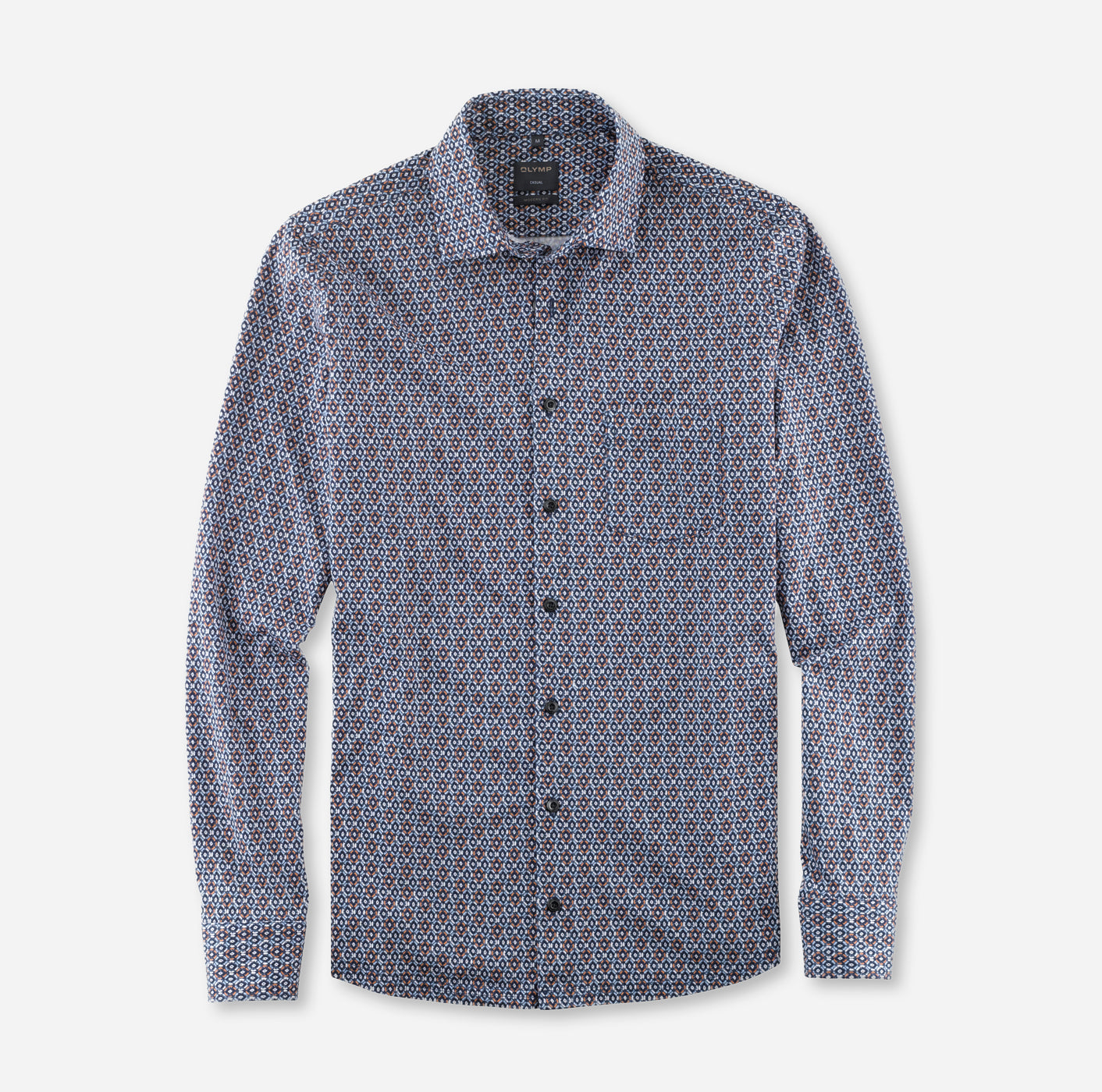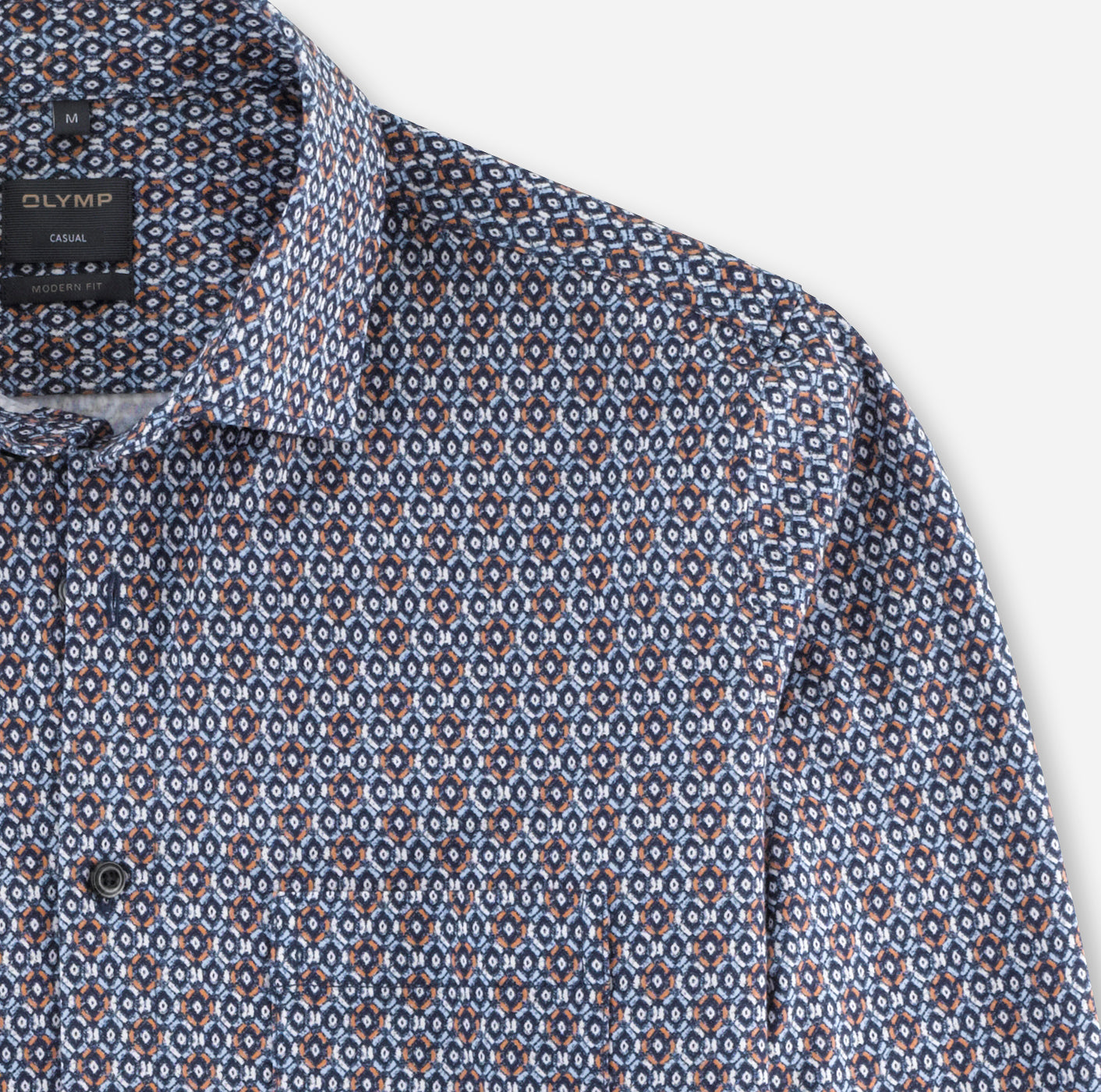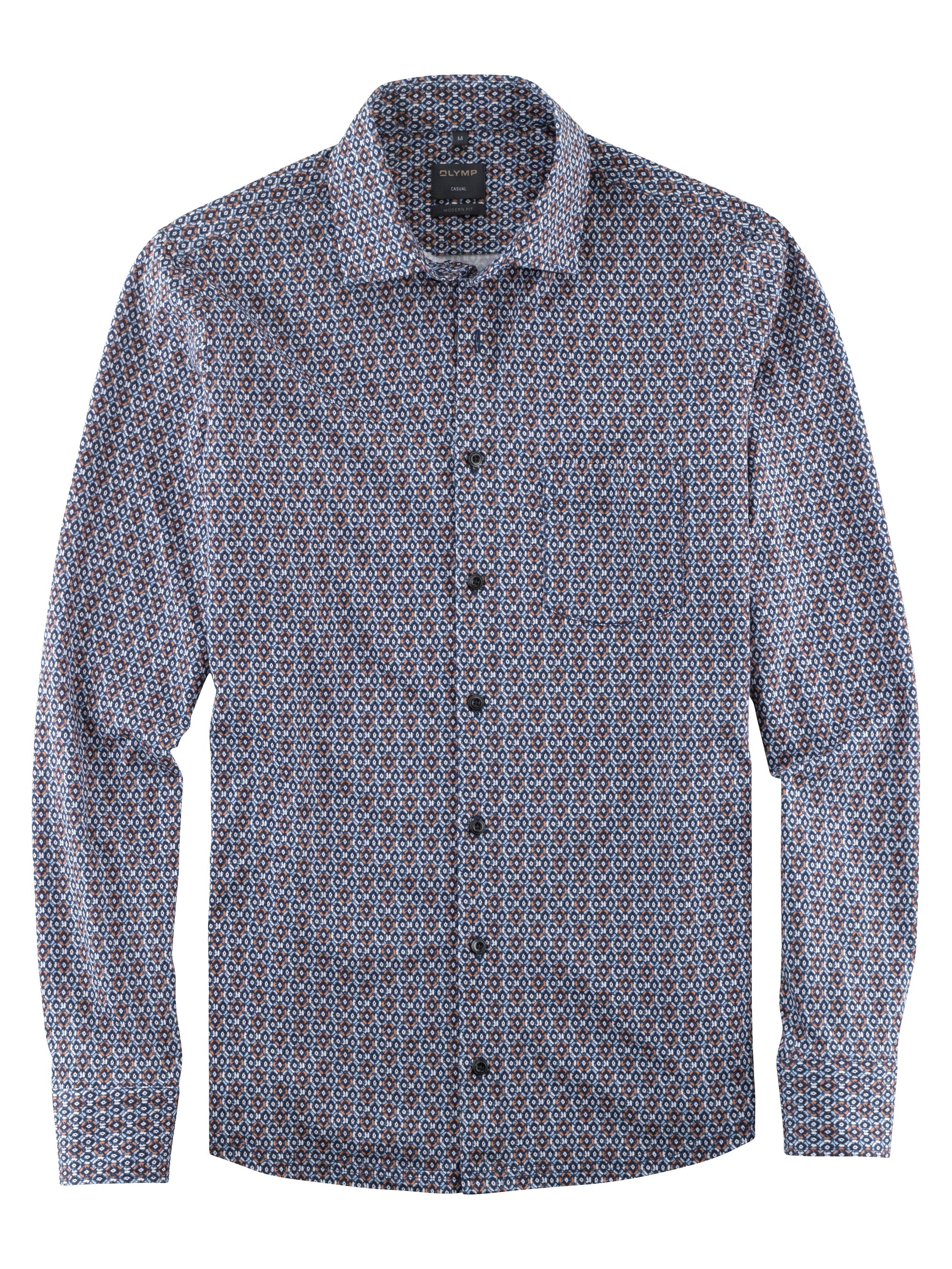 Grafische Digital-Prints mit außergewöhnlichen Mustern und Farbkompositionen, die sportlich leicht taillierte Linienführung und eine lässig abgerundete Saumkante definieren bei diesem OLYMP Casual modern fit den attraktiven Look. Die maskulin dynamische Jersey-Qualität aus reiner Baumwolle und ein klassischer Kent empfehlen sich für modische Casual-Kombinationen und setzen beim Einsatz im Office inspirierende Impulse. Die ausgezeichneten Trage- und Pflegeeigenschaften entsprechen selbstverständlich dem gewohnten OLYMP Standard.100% Baumwolle