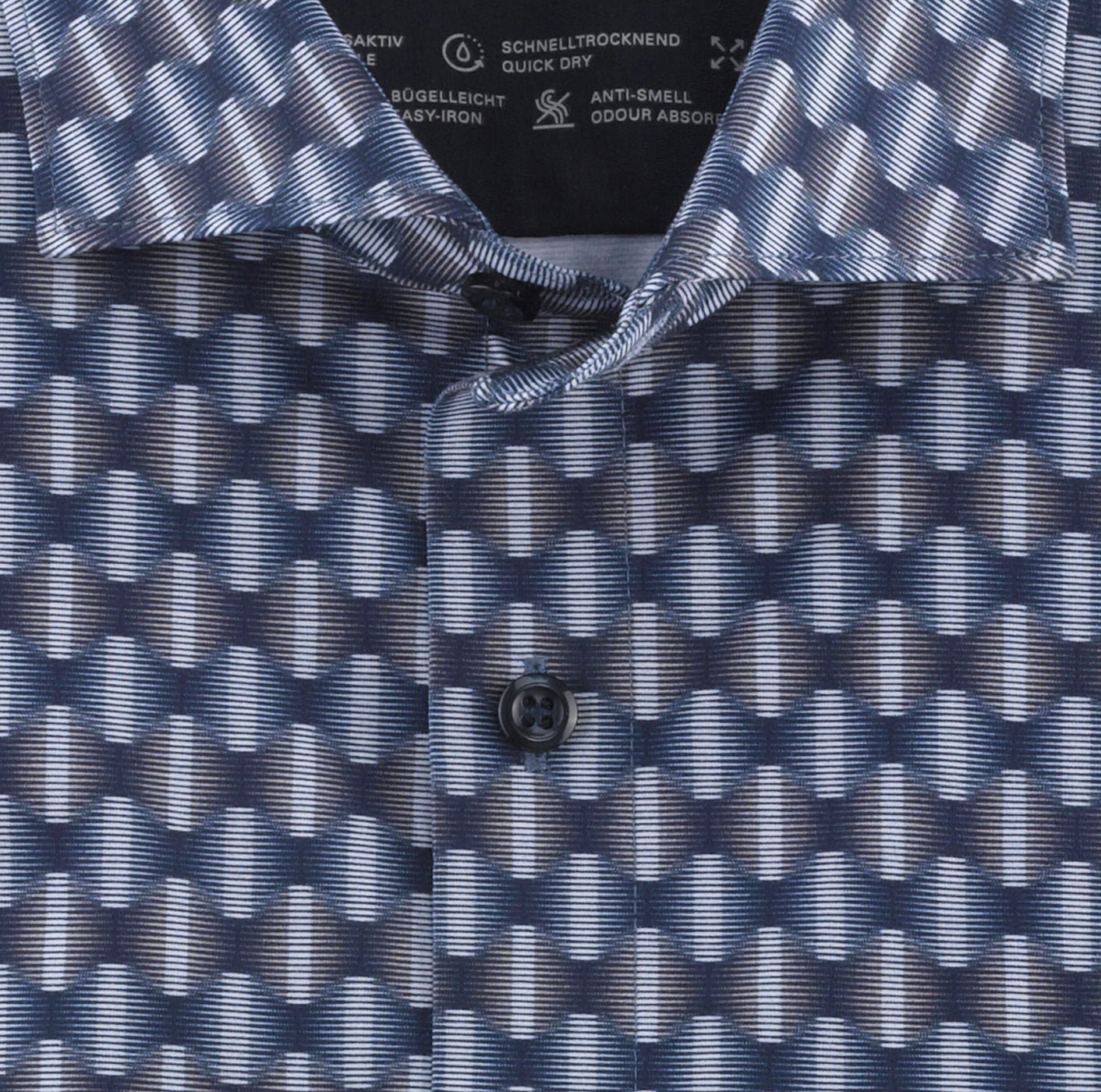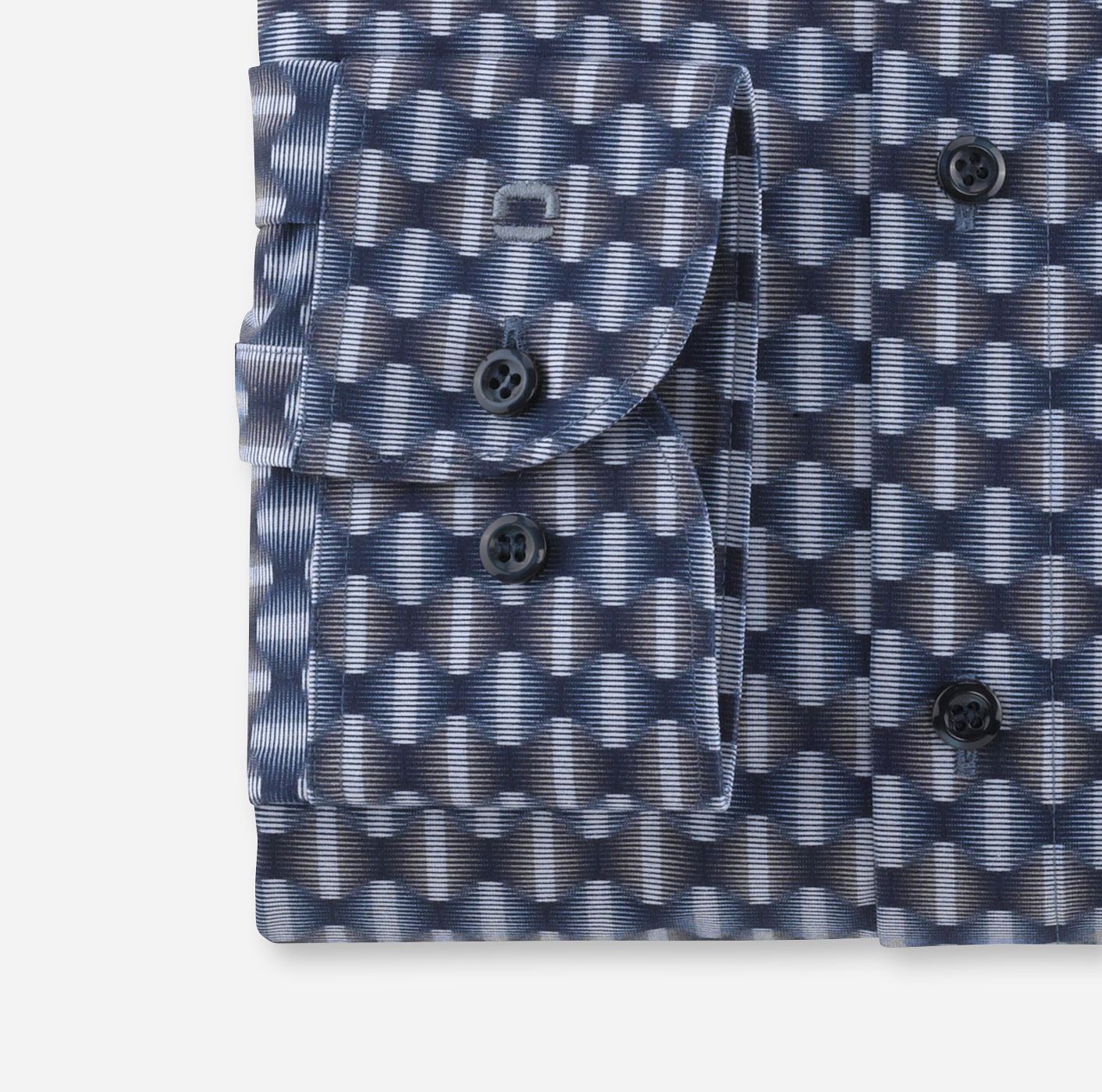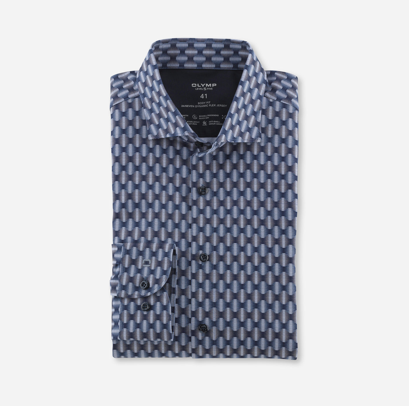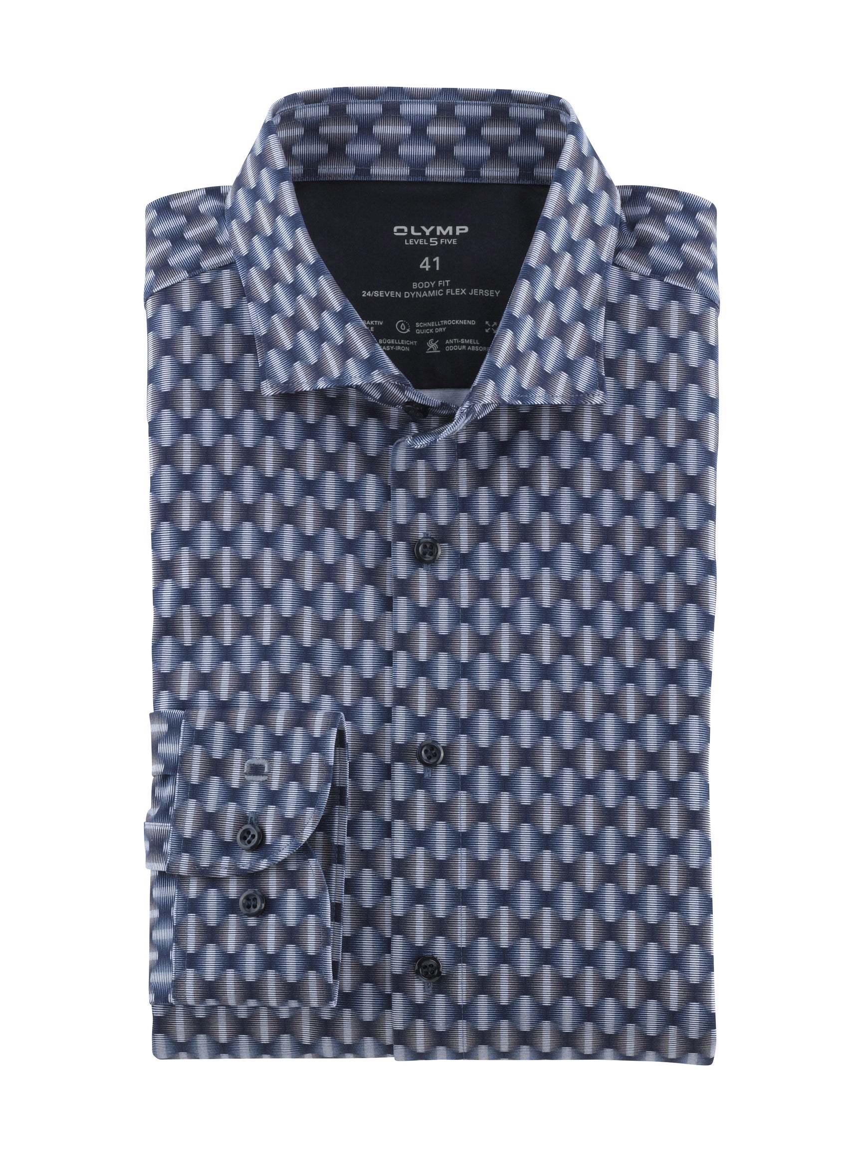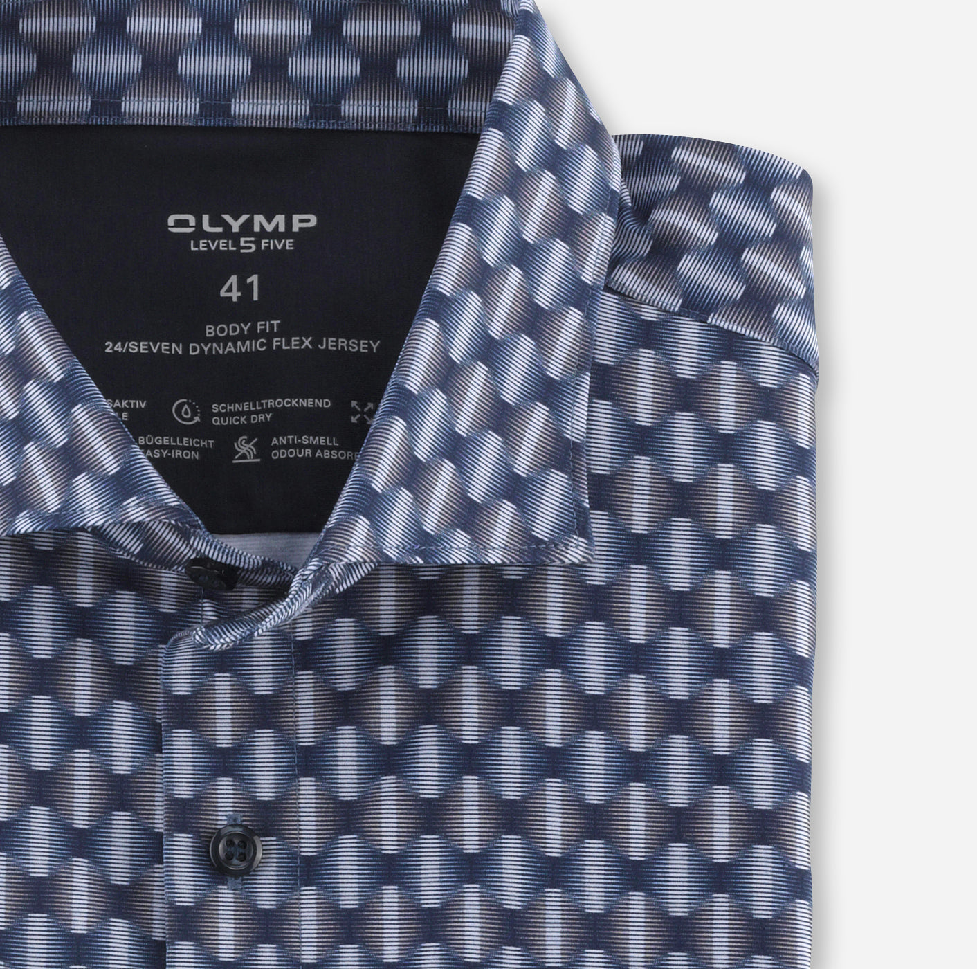 Hautsympathischer Tragekomfort in körperbetonter Body-Fit-Silhouette: Das innovative OLYMP Level Five 24/Seven Dynamic-Flex-Jersey ist die pflegeleichte Synthese aus sportlicher Eleganz und jugendlicher Lässigkeit. Die fein strukturierte Textur mit grafischem Print-Dessin auf glatter Bio-Baumwolle und geringem Elasthananteil. Ein Look, der seriös im Geschäftsleben ebenso wie im Homeoffice oder dem relaxten Afterwork-Szenario überzeugt. Vollendet durch einen klassischen Kent.92% Baumwolle, 8% Elasthan