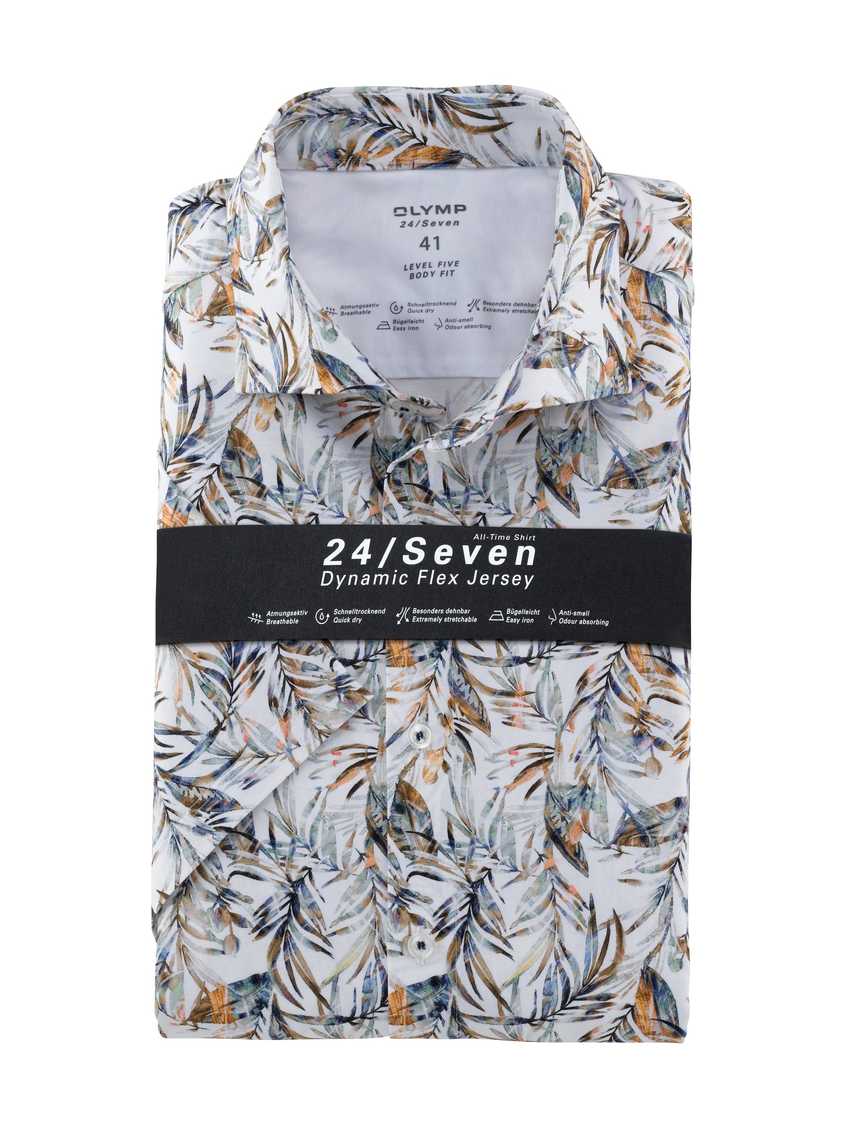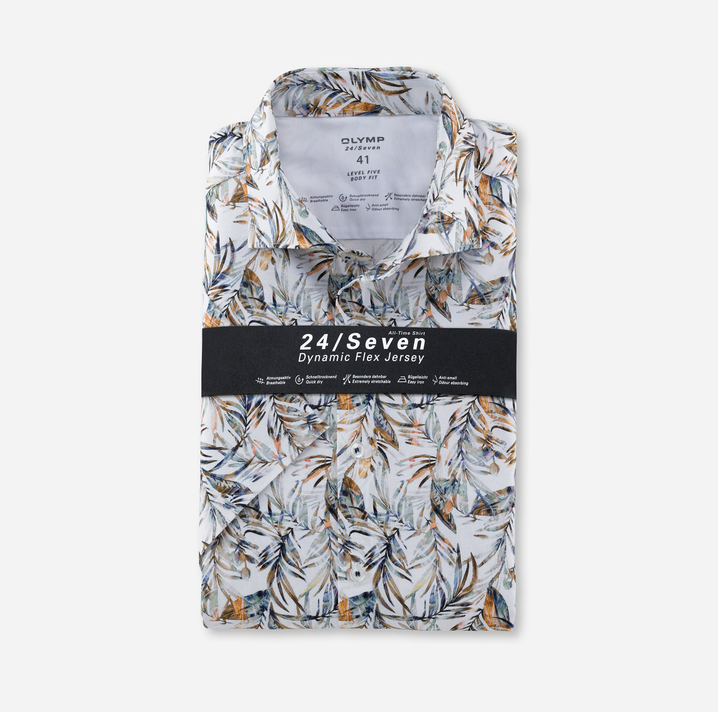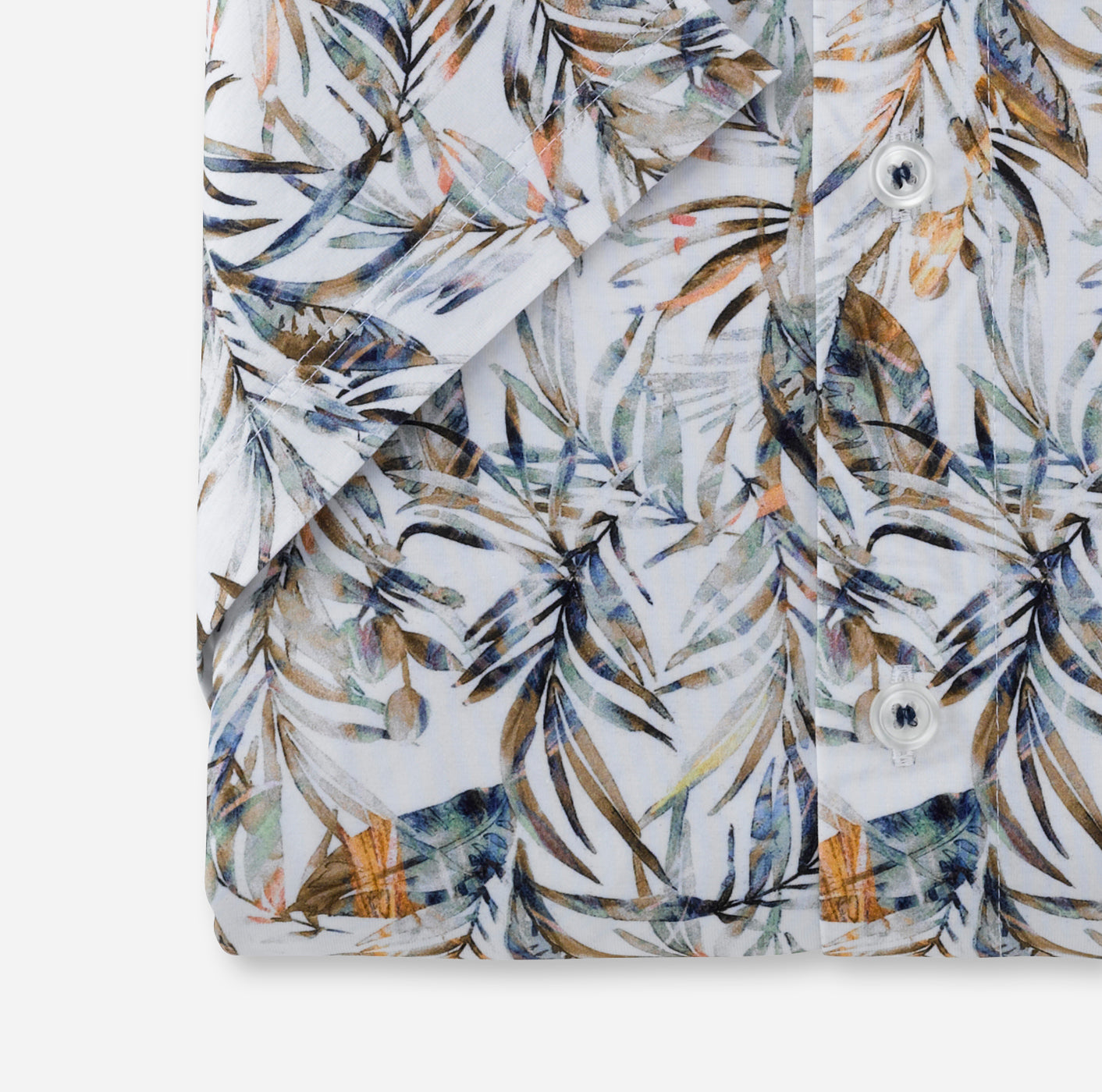 Als perfekte Einheit aus Dessin, Material und Schnittführung überzeugt dieses frühlingshafte OLYMP Level Five Kurzarmhemd mit stimmungsvollem Palmblätter-Print. Der vielfach beliebte 24/Seven Dynamic Flex Jersey begeistert hier durch eine leichte, glatte Baumwollqualität, versetzt mit einem hohen Anteil an Stretchfasern. Ein überzeugender Allrounder für Business und Freizeit, geschnitten in schlanker Body-Fit-Silhouette und mit elegantem Kent.92% Baumwolle, 8% Elasthan