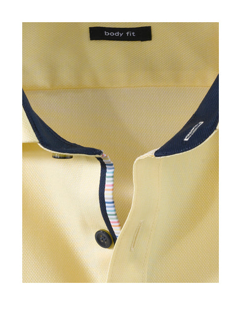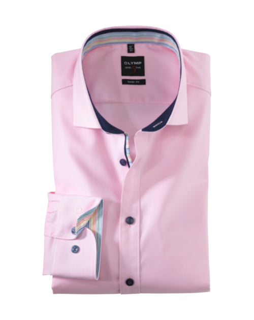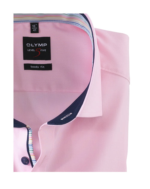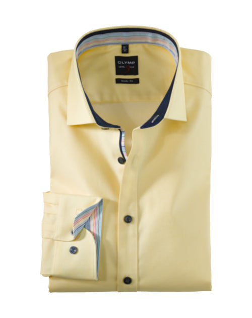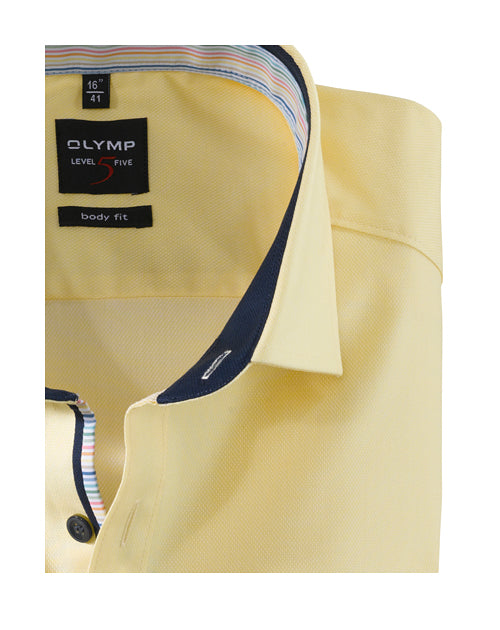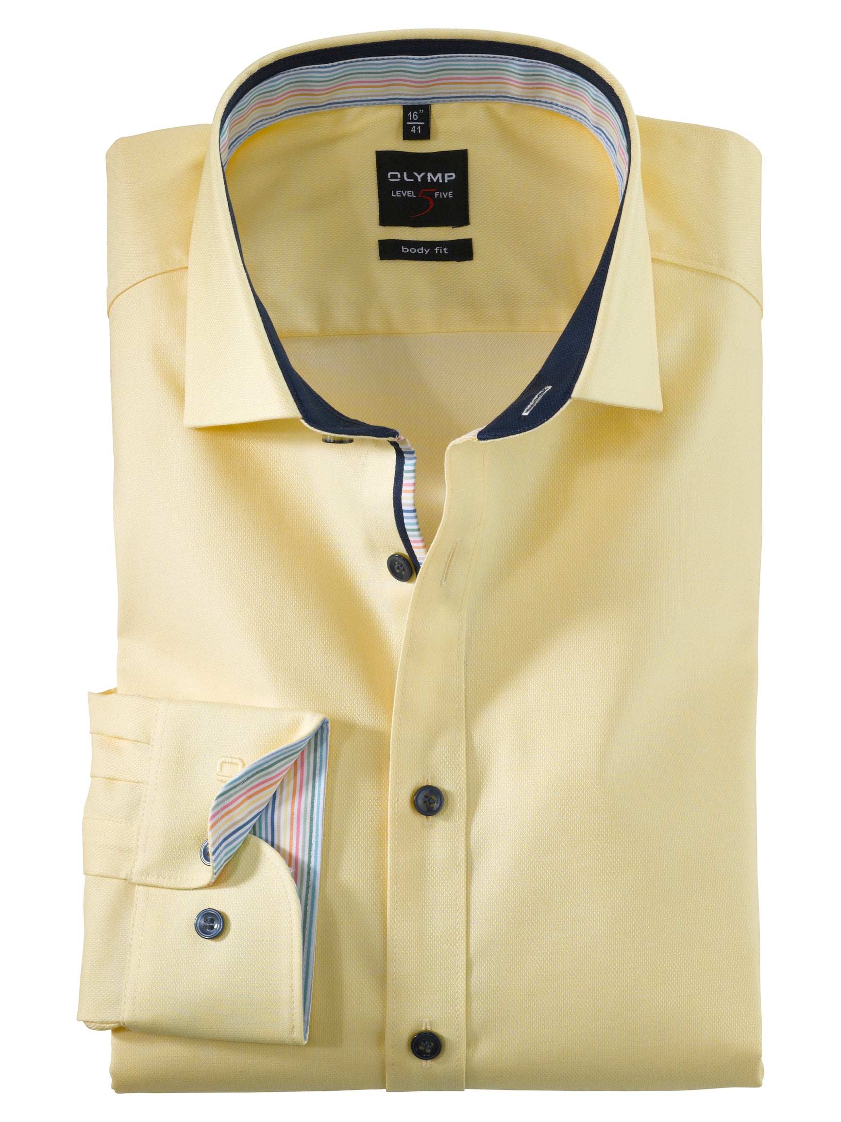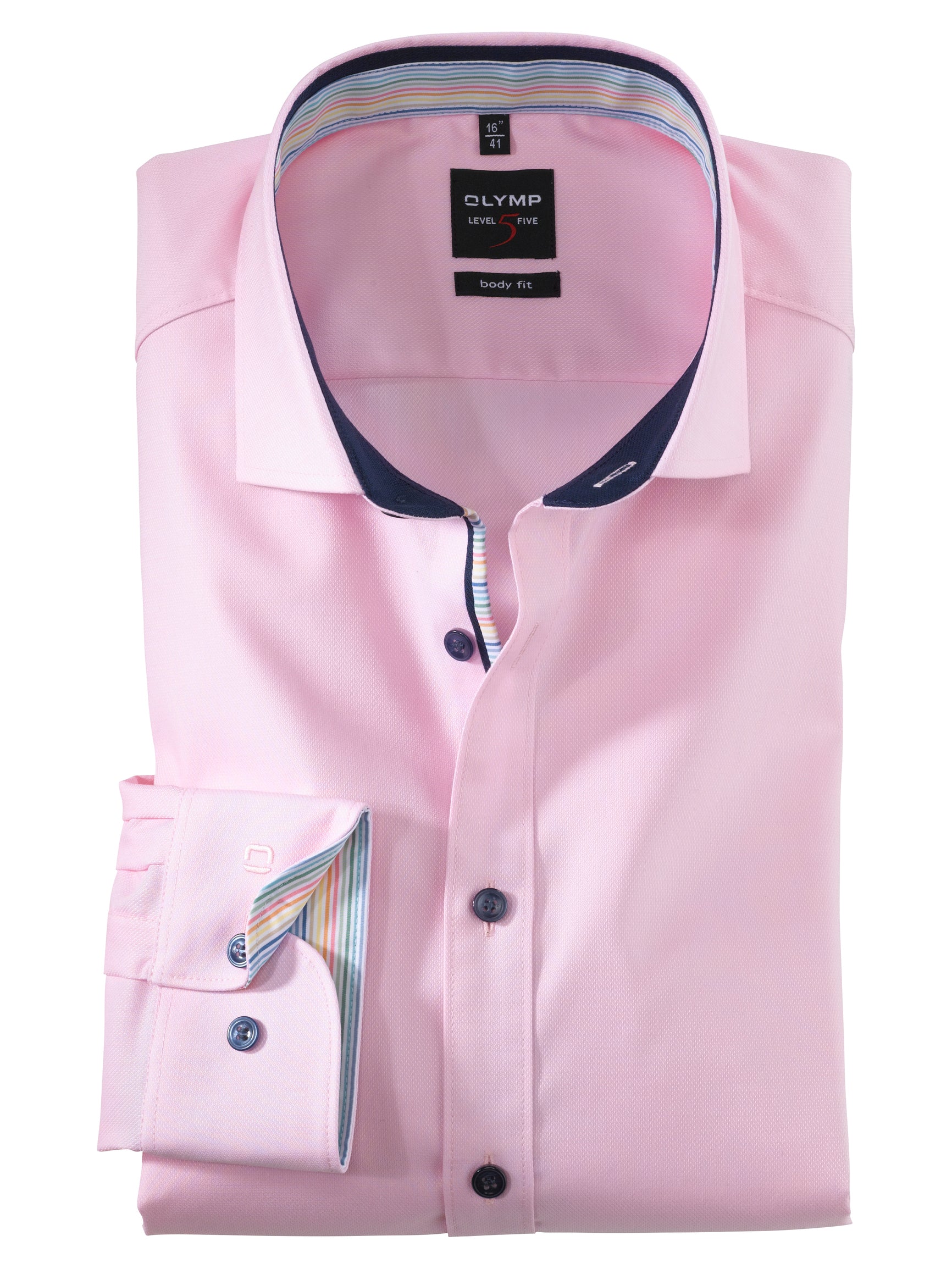 Dieses neue Hemd der Linie OLYMP Level Five eröffnet mit seinen frischen, modischen Farbvarianten ein völlig neues Spektrum am Konferenztisch. Der körpernah geschnittene Body Fit bringt die sportlich schlanke Silhouette optimal zur Geltung, ein eleganter Royal-Kent-Kragen signalisiert Sinn für die zeitlos klassischen Werte. Die hochwertige Baumwollqualität zeigt ein stilvolles, fein strukturiertes Schaftmuster und bietet dank Comfort Stretch höchsten Tragekomfort. Mit modisch gestreiftem Kontrastbesatz.97 % Baumwolle, 3 % Elastolefin