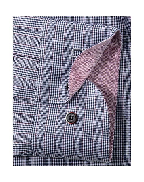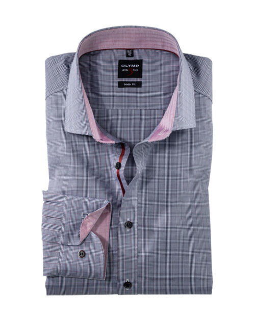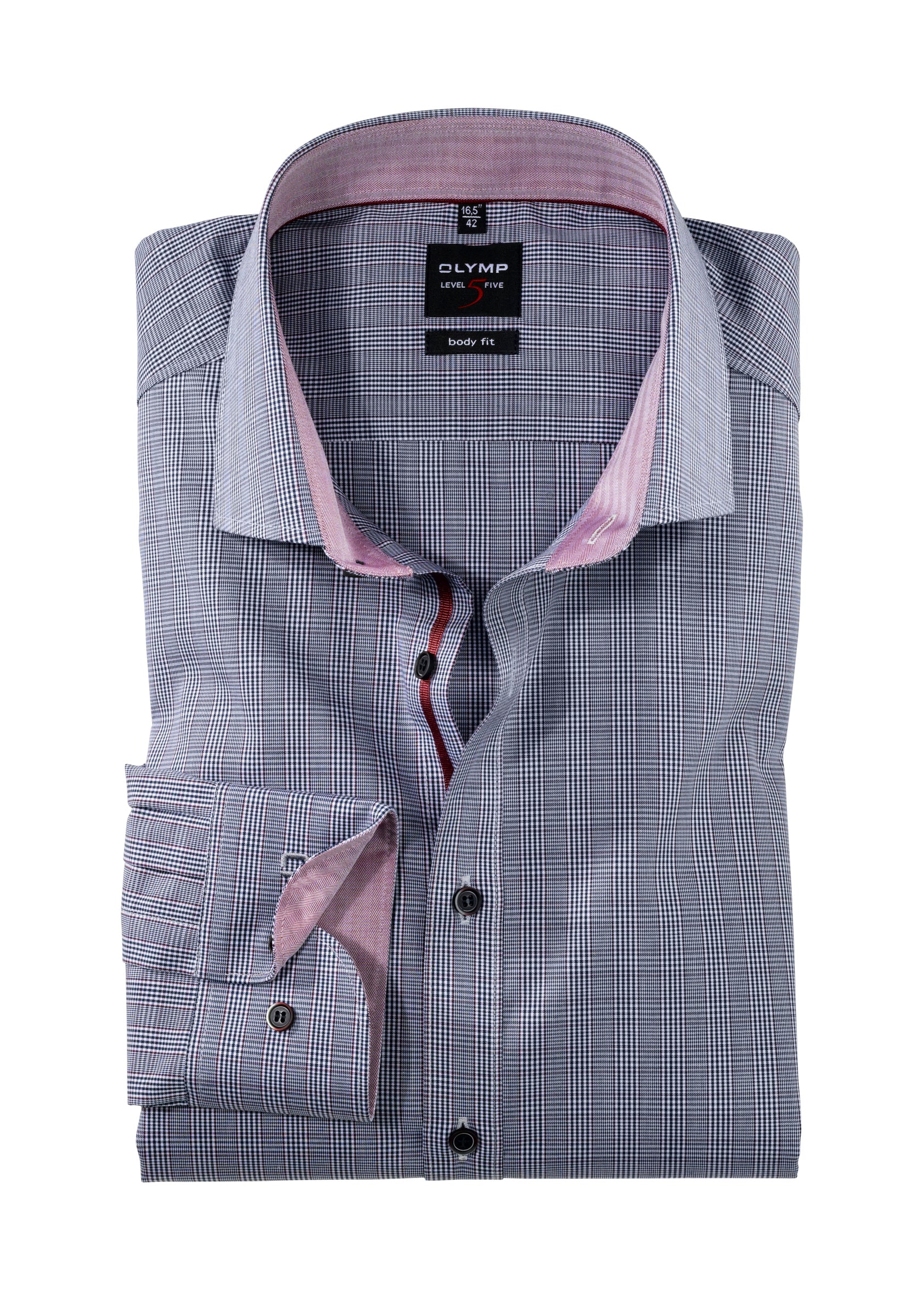 Das Businesshemd der Linie OLYMP Level Five besticht durch seine körperbetonende Schnittführung und hebt seinen Träger modisch auf einen neuen Level. Dazu gehören auffällige Produktdetails, wie etwa der karierte Oberstoff in Marine oder der Besatz am Krageninnensteg und den Innenmanschetten. Der elegante Royal-Kent-Kragen sowie die weitenverstellbaren Manschetten und die edlen Knöpfe mit Farbverlauf runden den Look ab. Die bügelleichte Beschaffenheit minimiert ungeliebtes bügeln. Das hochwertige Gewebe aus Comfort Stretch bietet grenzenlose Bewegungsfreiheit - trotz Body-fit-Passform.97 % Baumwolle, 3 % Elastolefin