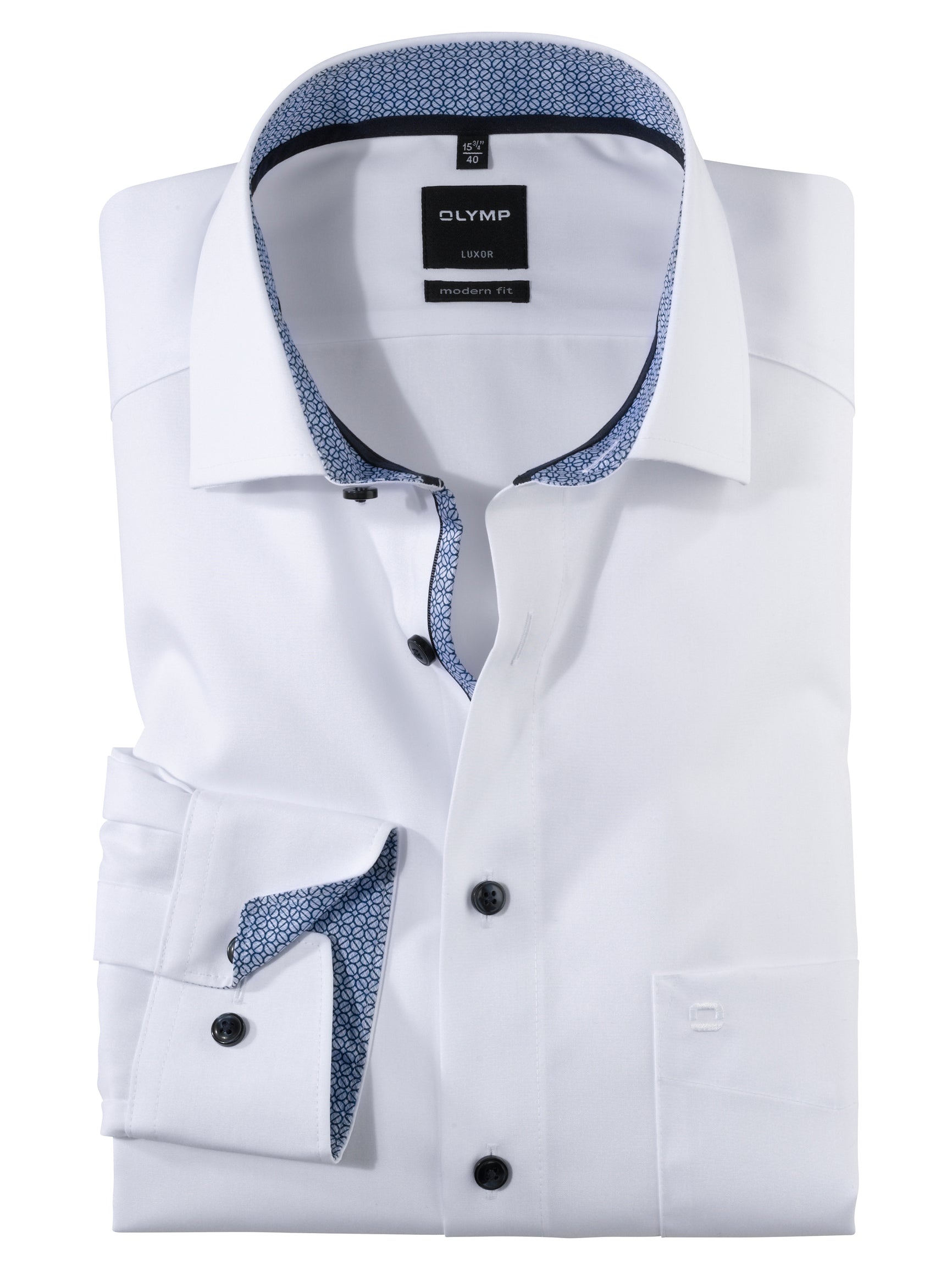 Einfach waschen, trocknen, anziehen – OLYMP Luxor modern fit bleibt auch ohne Bügeln den ganzen Tag glatt. Das knitter- und bügelfreie Businesshemd mit extra langem Arm aus 100% Baumwolle macht immer eine gute Figur. Der Oberstoff in Weiß harmoniert mit dem geschmackvoll darauf abgestimmten Kontrastgewebe am Krageninnensteg und den Innenmanschetten in perfekter Art und Weise. Ein eleganter Global-Kent-Kragen und weitenverstellbare Kombimanschetten machen den Style komplett. Der atmungsaktive und hautsympathische Stoff hält jeden Stress aus.100% Baumwolle