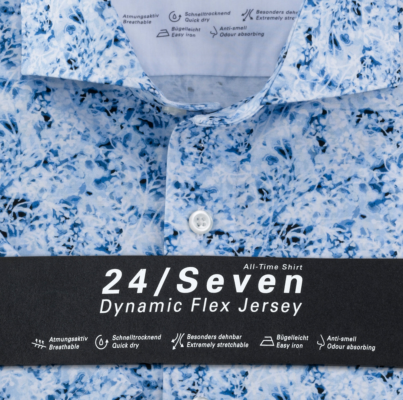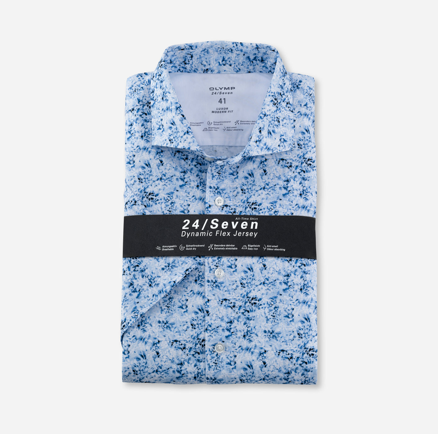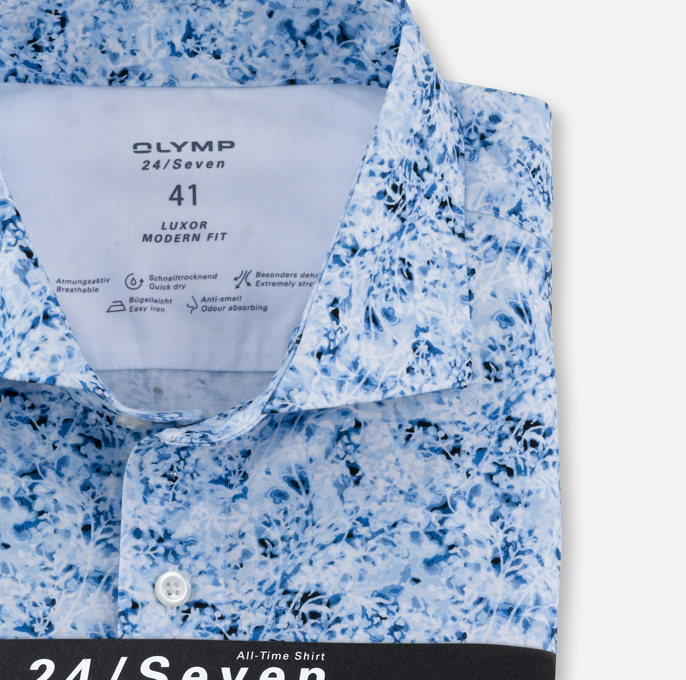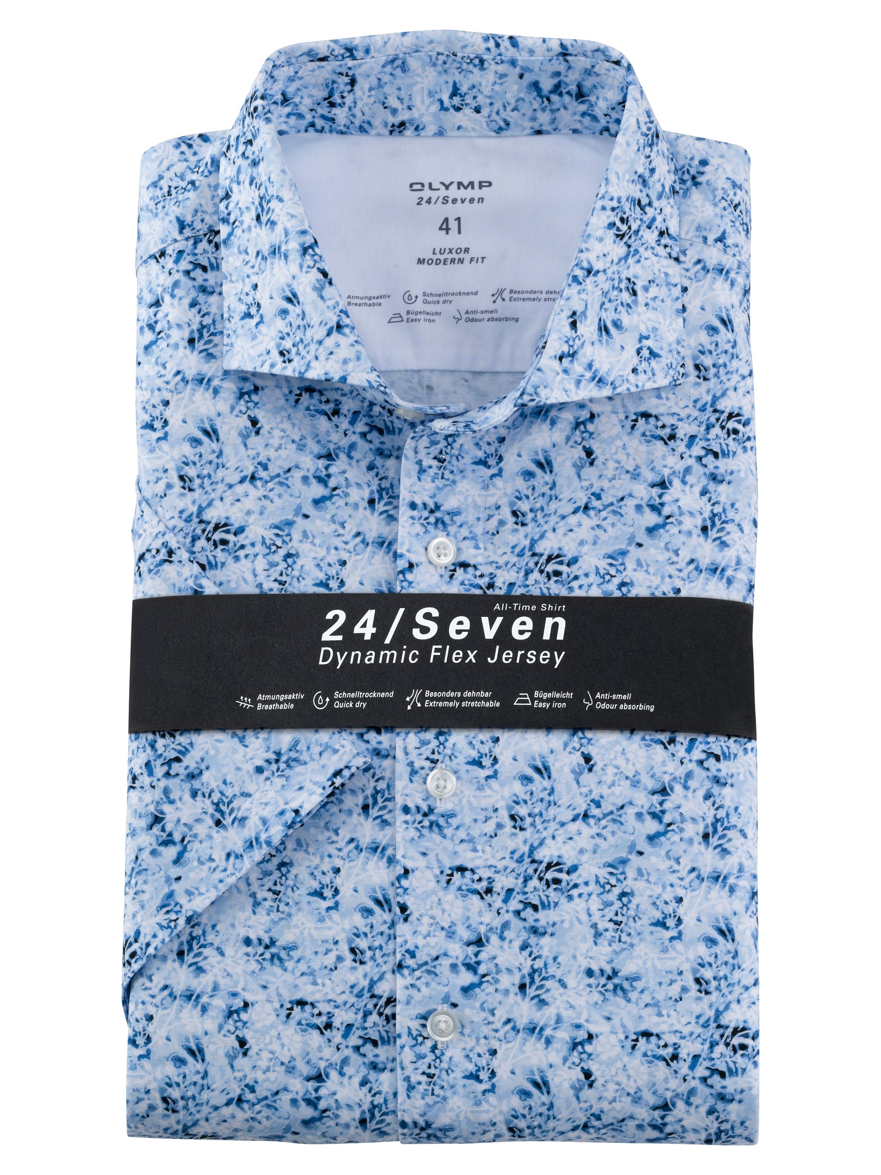 Wer denkt, dass Flower-Power im Business nichts zu suchen hat, täuscht sich gewaltig. Dieses OLYMP Luxor modern Fit in der 24/Seven Ausführung mit klassischem, aber softem Kent kombiniert entspannte Lässigkeit, persönlichen Style und inspirierende Kreativität wie kein anderes Businesshemd. Noch dazu garantiert es absolute Bewegungsfreiheit bei knitterfreier Formstabilität und lässt dadurch so manches traditionelle Businesshemd alt aussehen. Die innovative Dynamic-Flex-Jersey-Mischung mit Elasthanfasern ist atmungsaktiv, schnelltrocknend, bügelleicht und geruchsabsorbierend.92% Baumwolle, 8% Elasthan