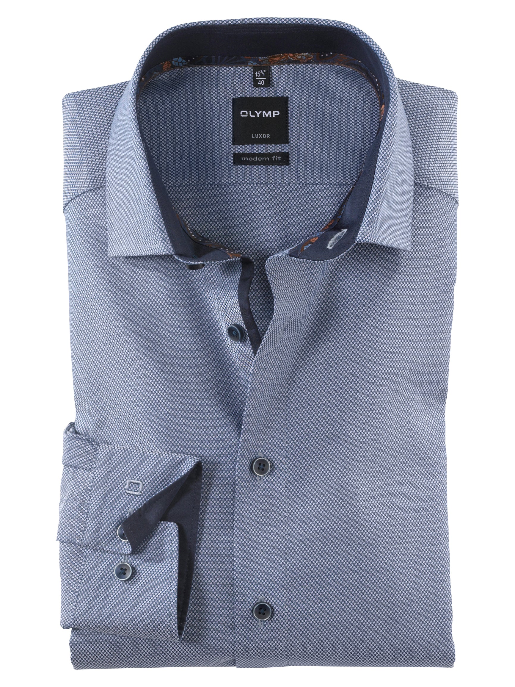 Mehr Souveränität durch faltenfreien Auftritt: Das exklusive Businesshemd der Linie OLYMP Luxor modern fit mit grenzenloser Bügel- und Knitterfreiheit. Auch bei hitzigen Debatten angenehmer Tragekomfort dank atmungsaktiver und hautsympathischer Stoffe. Der Oberstoff mit Schaftmusterung in Marine akzentuiert den Besatz aus Satin und Druck am Krageninnensteg und den Innenmanschetten. Nicht zuletzt machen der Global-Kent-Kragen und weitenverstellbare Kombimanschetten OLYMP Luxor zum idealen Geschäftspartner. Business im OLYMP.100 % Baumwolle