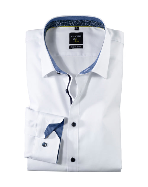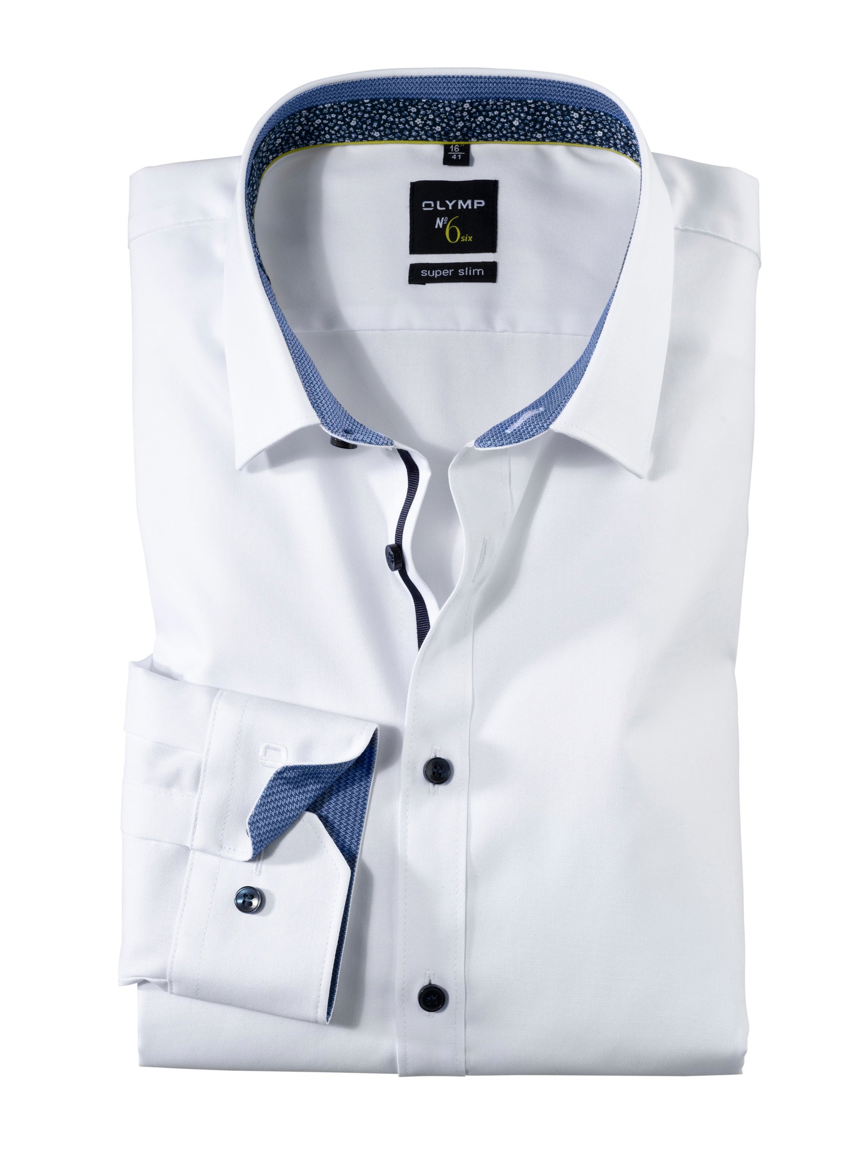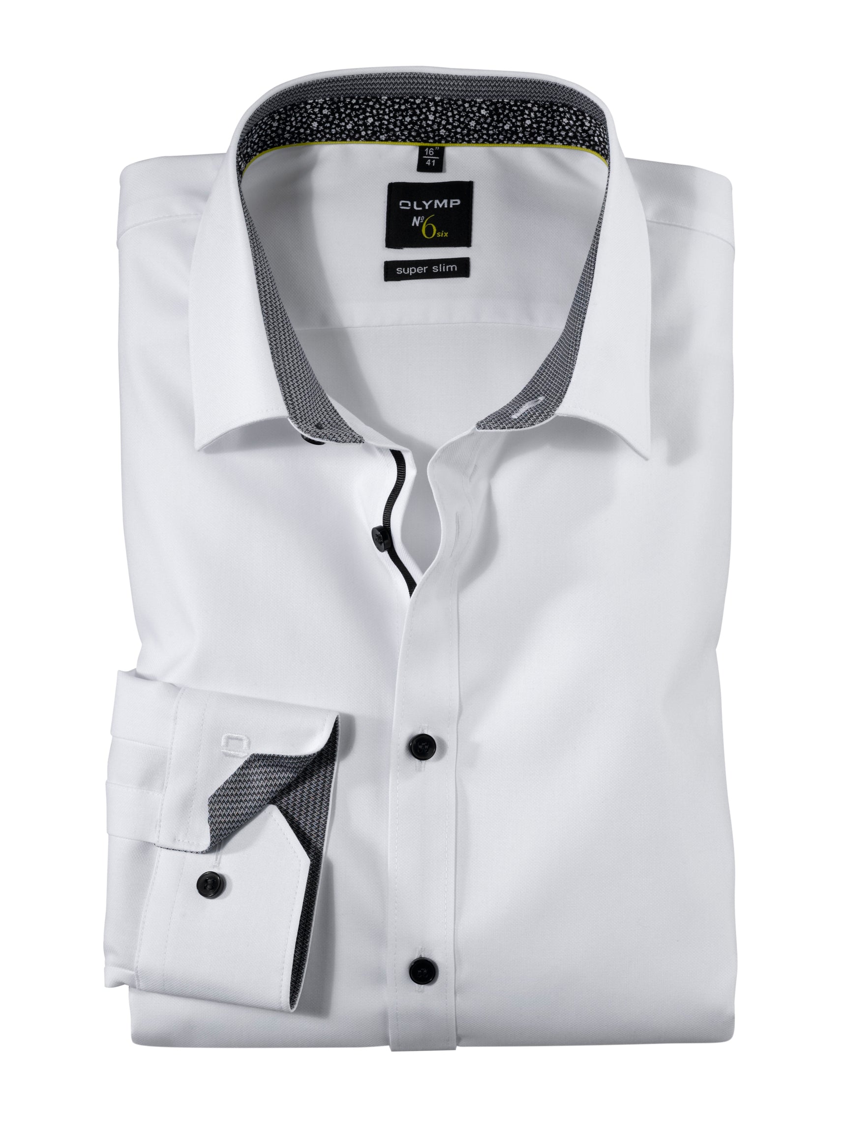 OLYMP No. Six super slim ist das sehr stark taillierte und körpernahe Businesshemd für superschlanke Männer. Die trendige Verjüngung der Silhouette unterstützt die Körperbetonung der sportaffinen Zielgruppe. Die schlanke Hemdenlinie mit elegantem Urban-Kent-Kragen und abgerundeten Manschetten ist außerdem besonders bügelleicht und zertifiziert nach OEKO-TEX® STANDARD 100. Der Oberstoff in Weiß und der Besatz am Krageninnensteg und den Innenmanschetten runden das Gesamtbild ab.97 % Baumwolle, 3 % Elastolefin
