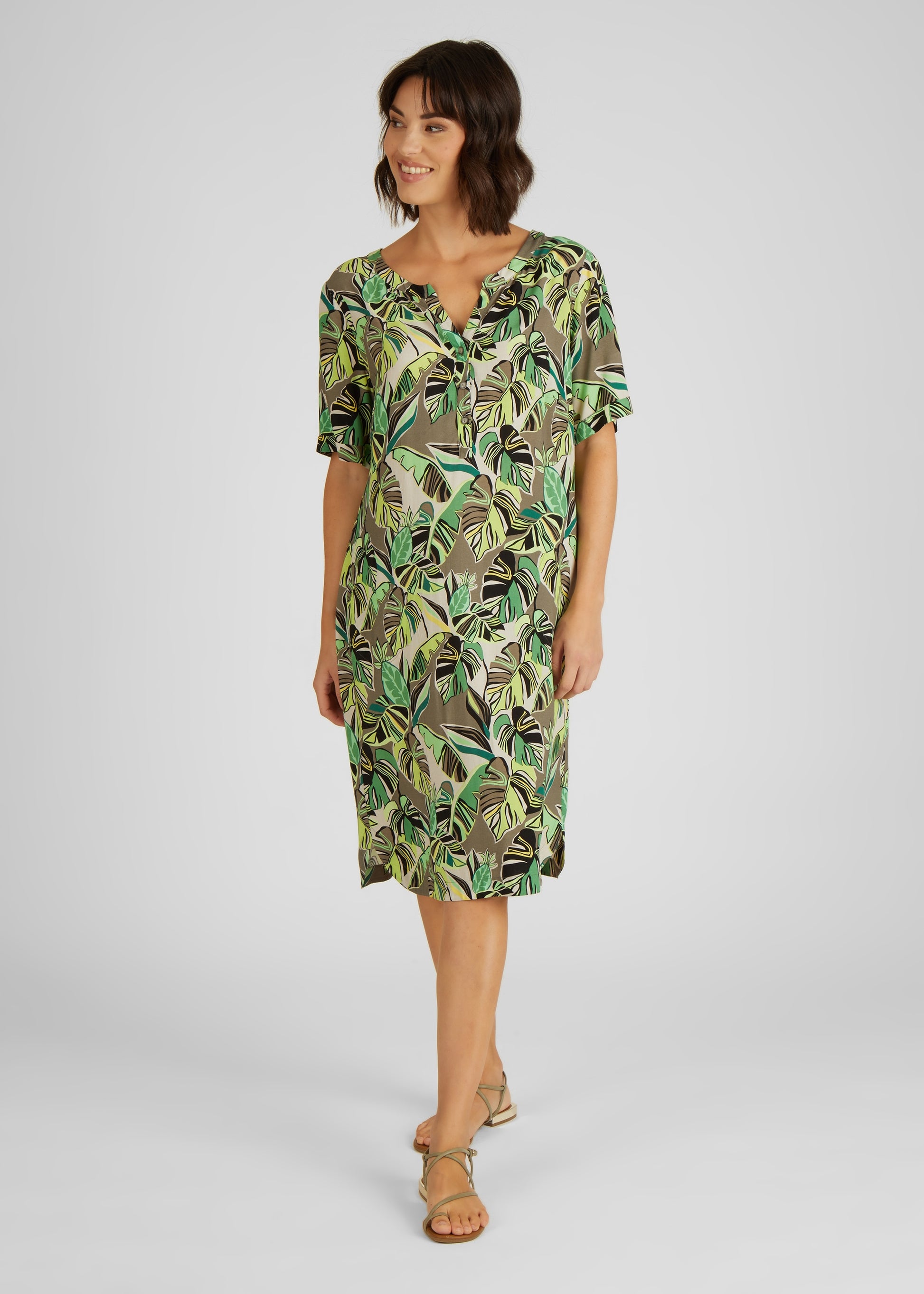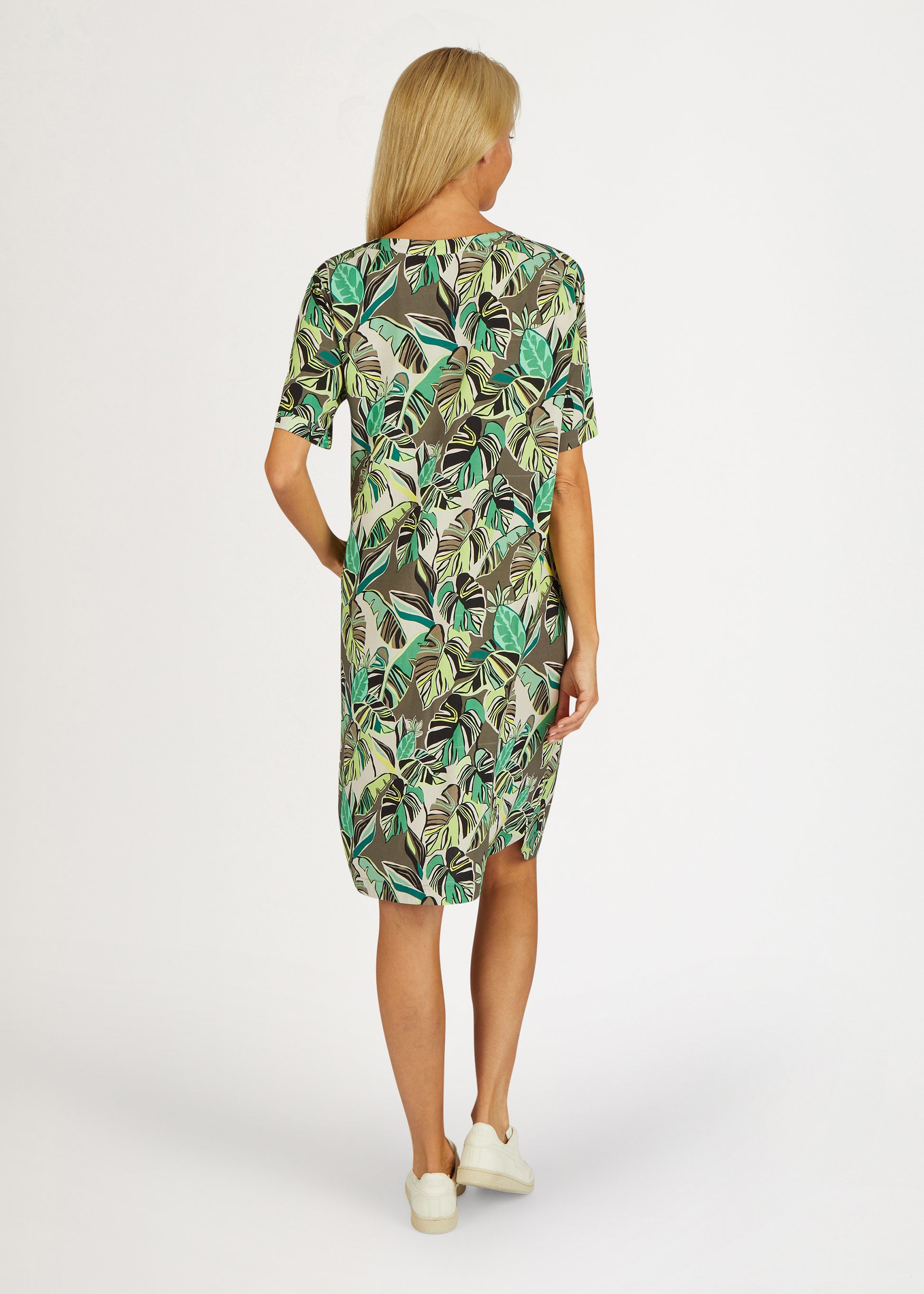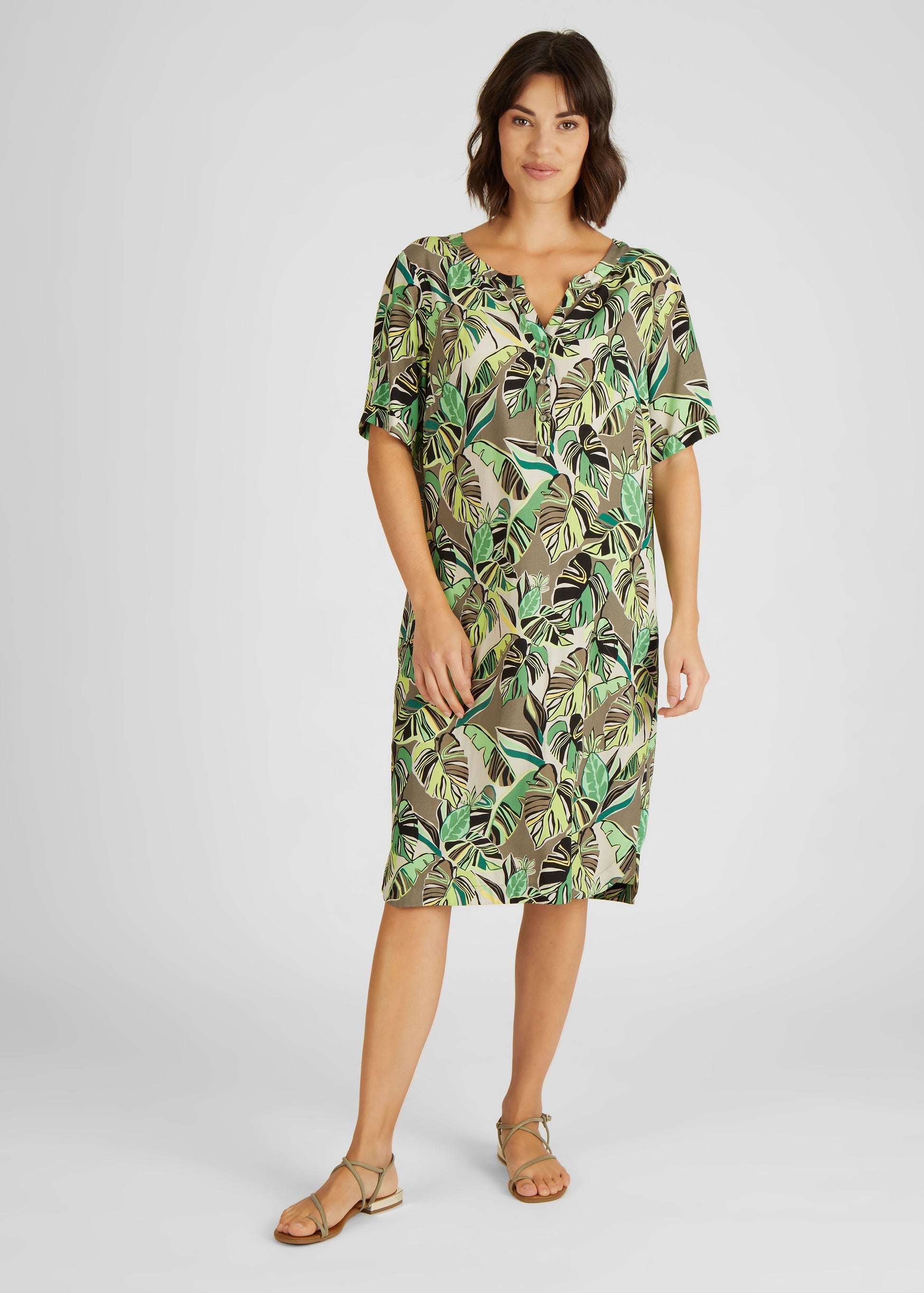Das Blusenkleid mit Palmblättermuster ist ein modisches und bequemes Kleidungsstück für Damen. Es verfügt über einen klassischen Rundhals mit einem kleinen V-Ausschnitt, der das Dekolleté auf subtile Weise betont. Das Muster des Kleides ist von tropischen Palmblättern inspiriert, die auf einem leichten und atmungsaktiven Viskosestoff gedruckt sind. Dieses Kleid ist perfekt für eine Vielzahl von Anlässen geeignet, von lässigen Tagen im Büro bis hin zu entspannten Wochenendaktivitäten. Kombinieren Sie es mit Sandalen und einer Tasche für einen einfachen und unkomplizierten Look. Egal wie Sie es tragen, dieses Blusenkleid wird Ihnen eine komfortable und stilvolle Option bieten.100% Viskose