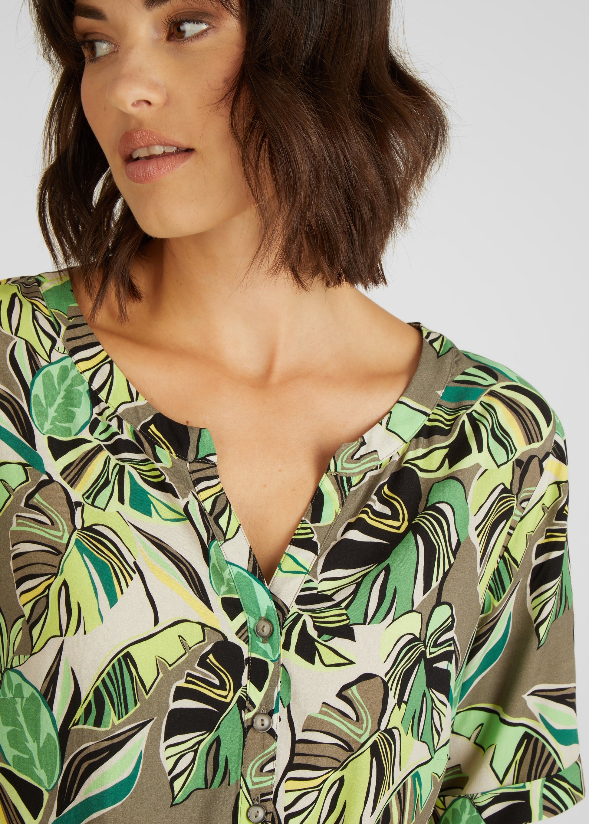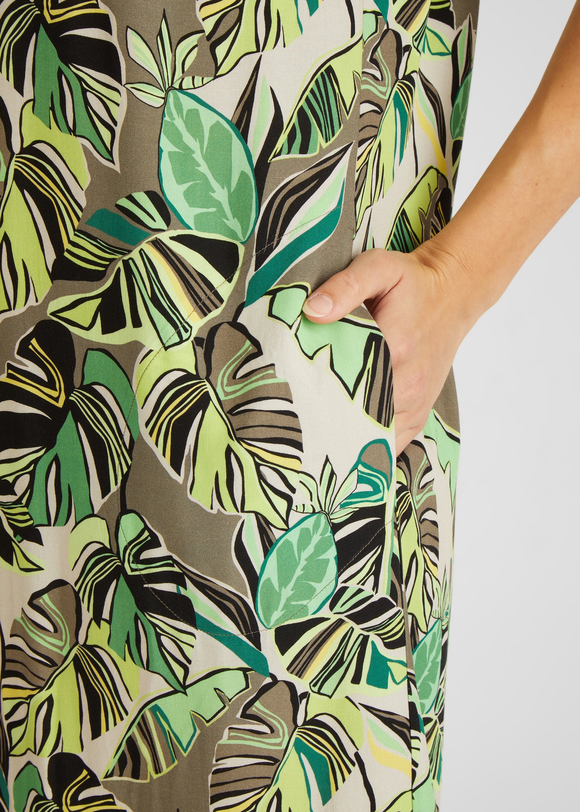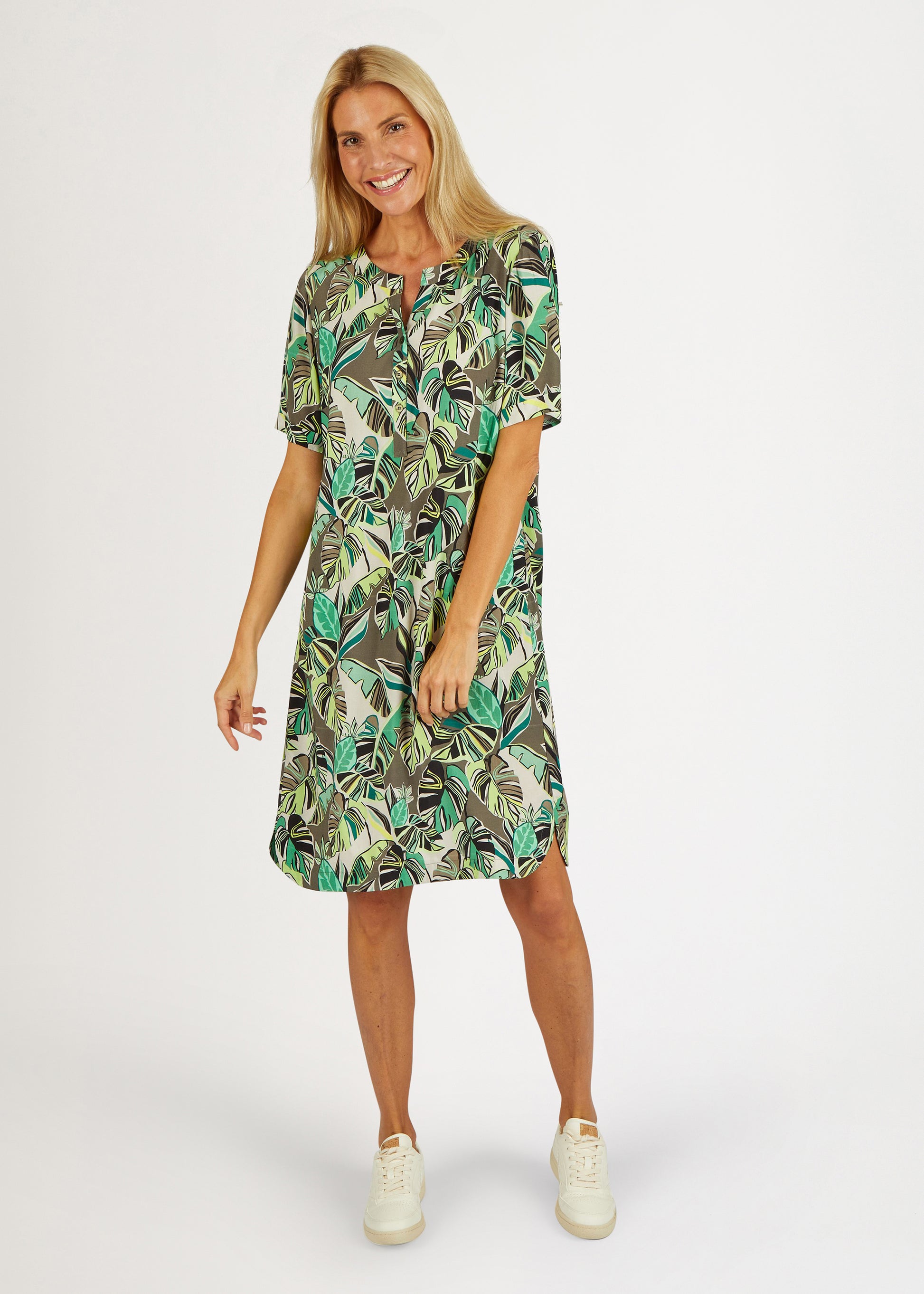 Das Blusenkleid mit Palmblättermuster ist ein modisches und bequemes Kleidungsstück für Damen. Es verfügt über einen klassischen Rundhals mit einem kleinen V-Ausschnitt, der das Dekolleté auf subtile Weise betont. Das Muster des Kleides ist von tropischen Palmblättern inspiriert, die auf einem leichten und atmungsaktiven Viskosestoff gedruckt sind. Dieses Kleid ist perfekt für eine Vielzahl von Anlässen geeignet, von lässigen Tagen im Büro bis hin zu entspannten Wochenendaktivitäten. Kombinieren Sie es mit Sandalen und einer Tasche für einen einfachen und unkomplizierten Look. Egal wie Sie es tragen, dieses Blusenkleid wird Ihnen eine komfortable und stilvolle Option bieten.100% Viskose