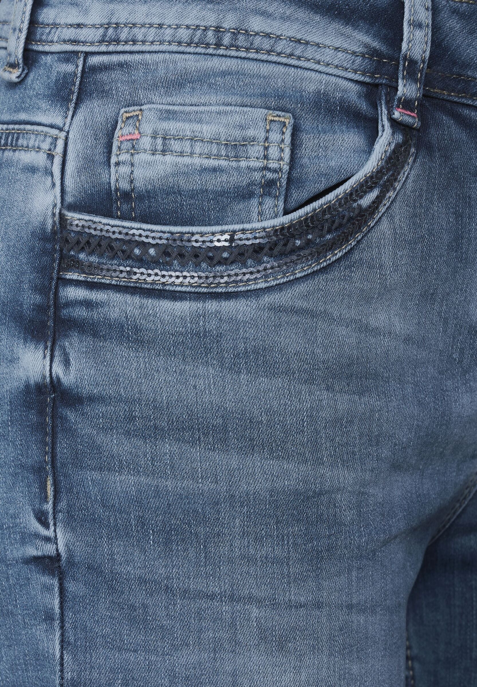 Ready for summer! Die Slim Fit Damen Caprijeans im Style Toronto von CECIL zeigt sich mit hohem Bund und schmalen Beinen und formt so eine tolle Silhouette. An den Eingrifftaschen des 5-Pocket-Styles zeigen sich funkelnde Pailletten. Ein Reißverschluss mit Knopf ergänzt den Style in mittelblauer Waschung.