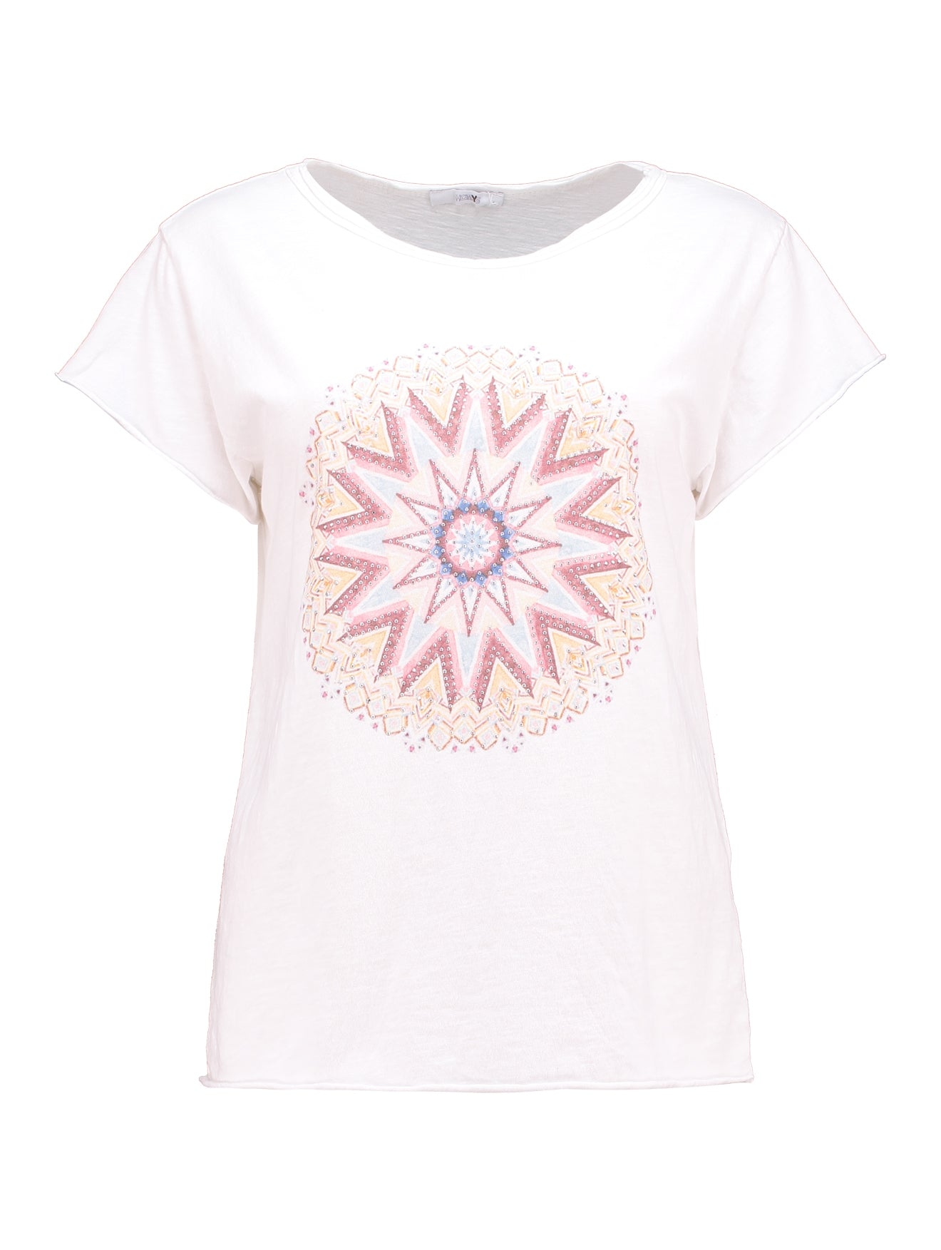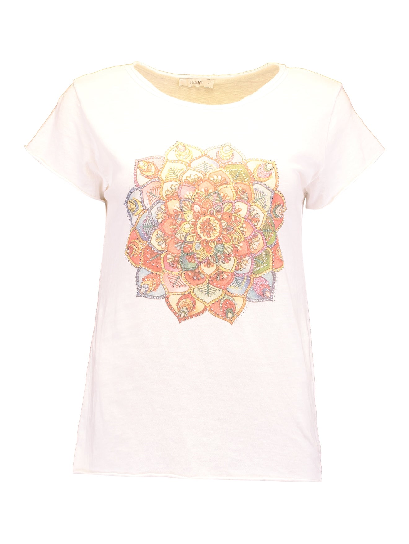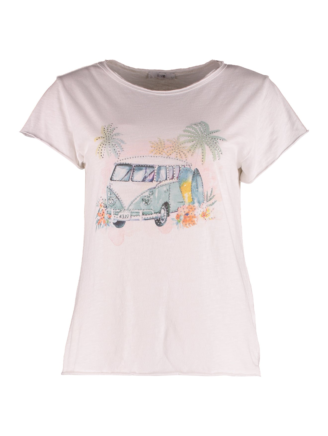 T-Shirt mit Moped-Print und Schmucksteinen. Kurze Ärmel und Rundhalsausschnitt.100 % Baumwolle