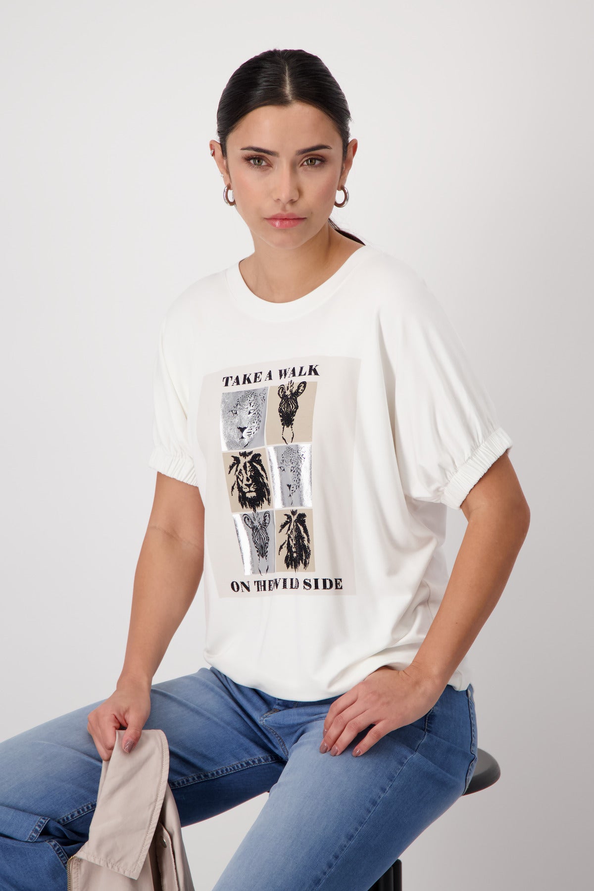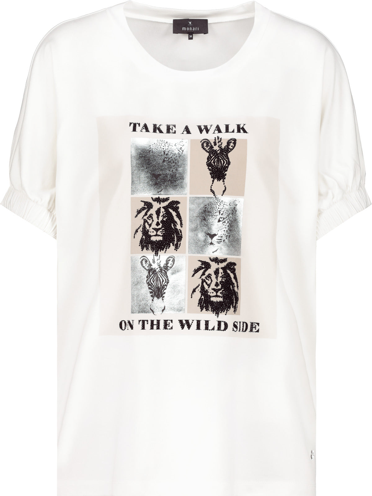 Das Shirt mit Strass Schrift und Safari Print sorgt für einen lässigen Look mit femininem Touch.45 % Viskose, 45 % Modal, 10 % Elasthan