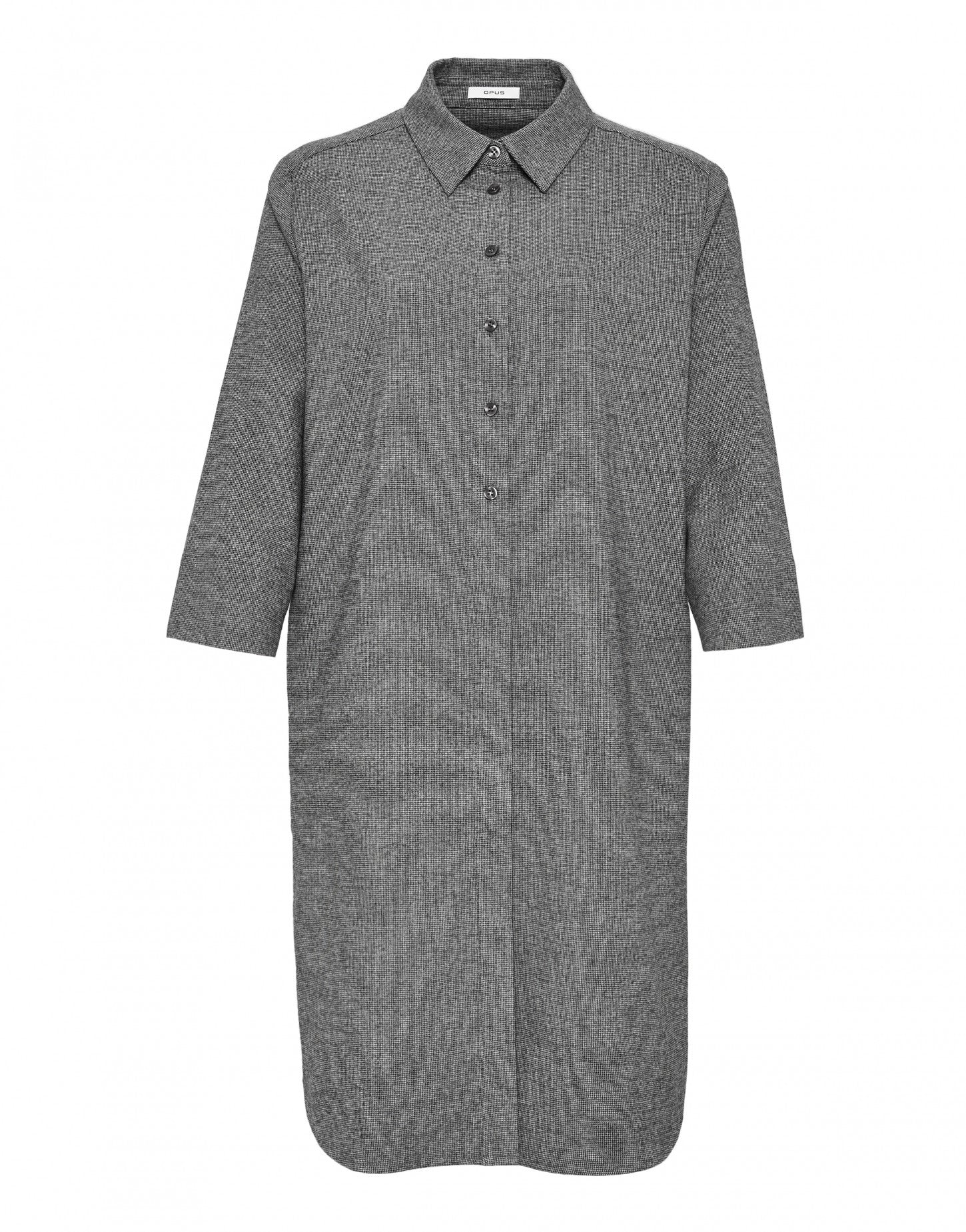 Recycled Polyester, ¾ Arm mit Schlitzen am Ende, mulinierte Ware, kleiner Check, lange Knopfleiste nur bis zur Hälfte sichtbar, danach blinde Leiste, abgerundeter Saum, Melange, das Model ist 176 cm groß und trägt Größe 3665% Polyester, 32% Viskose, 3% Elasthan